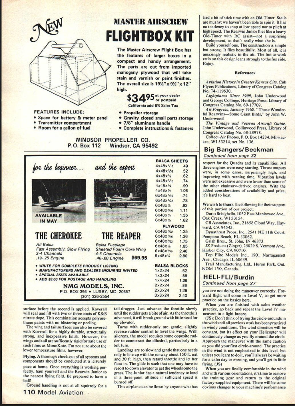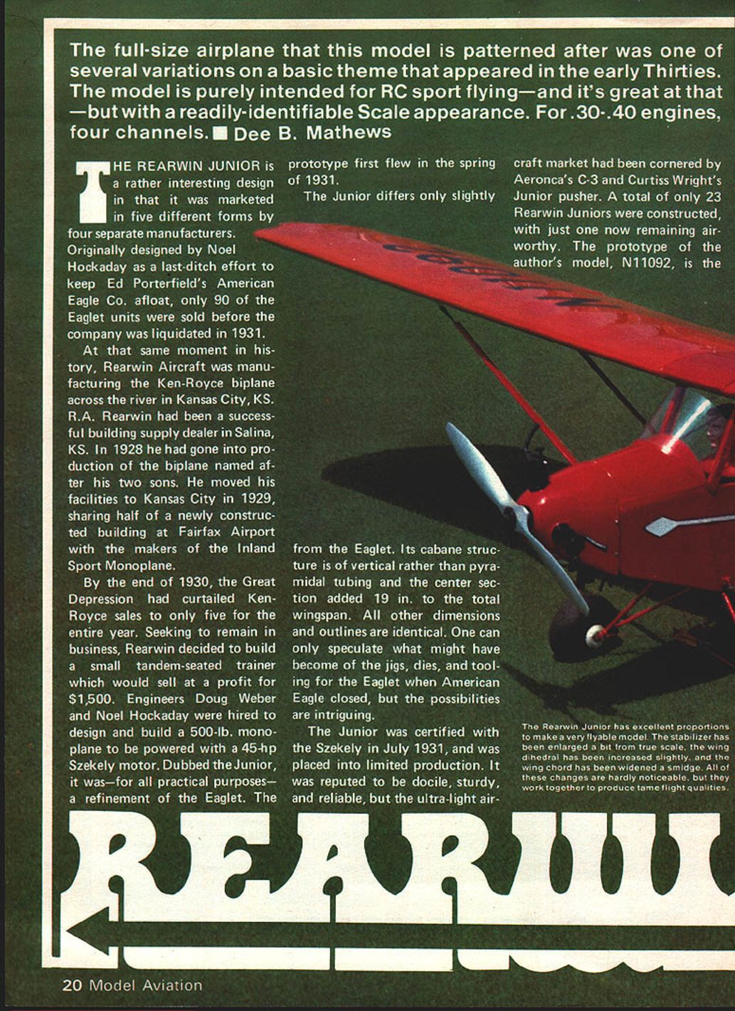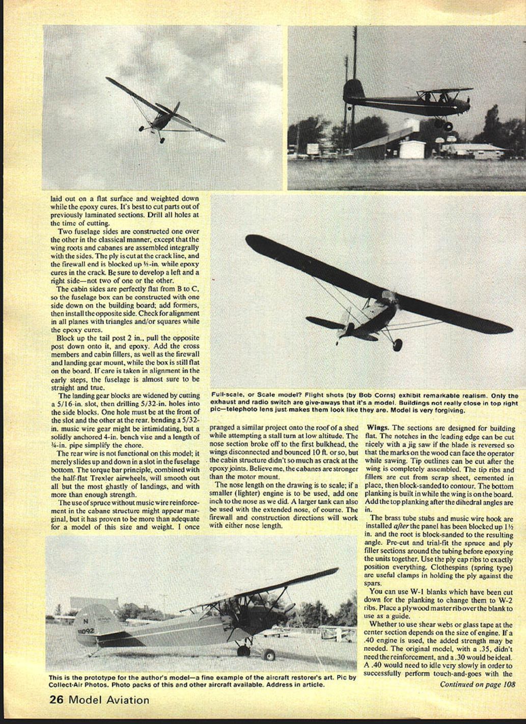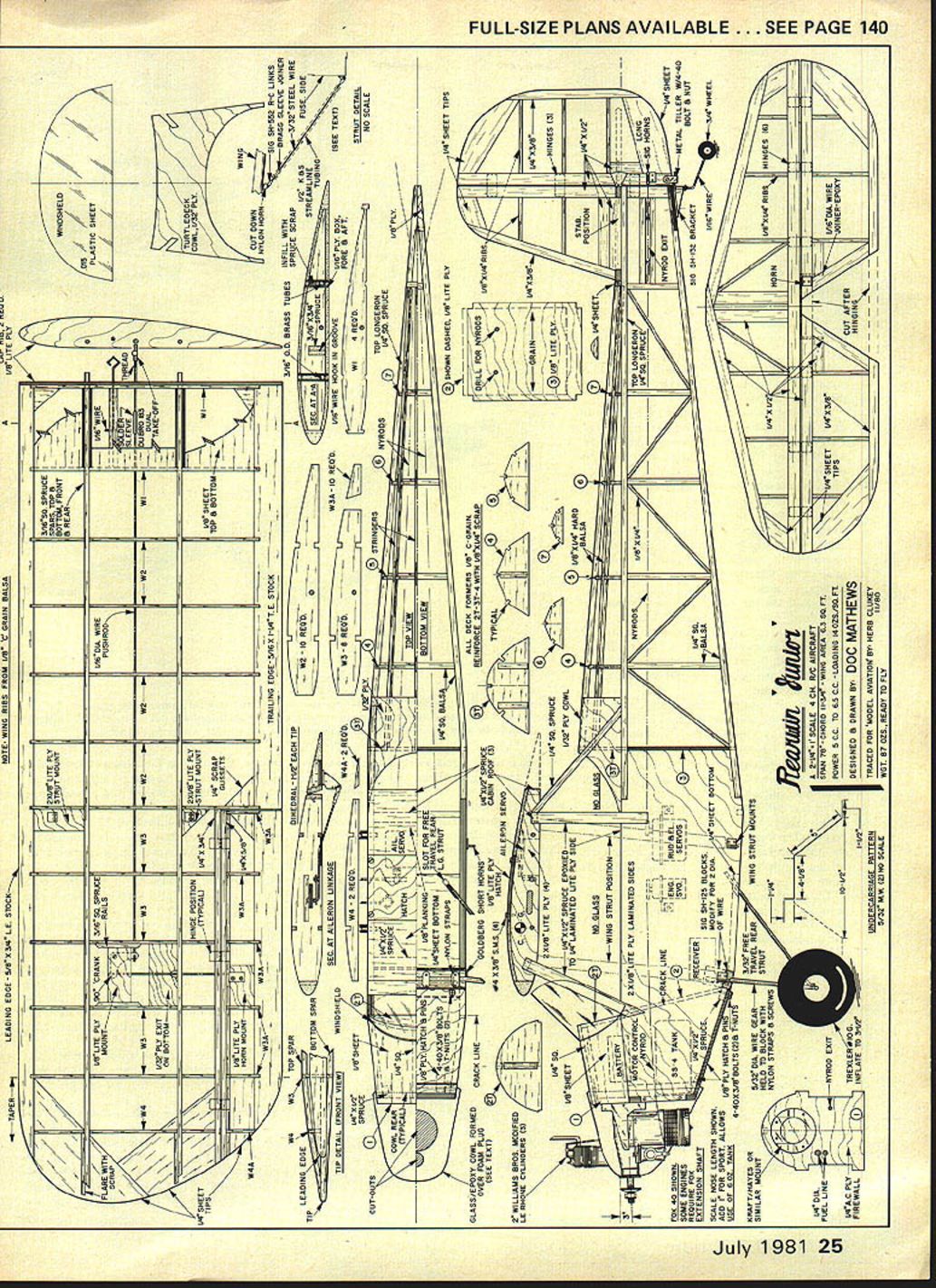 NO OCR TEXT NO OCR TEXT small black models used during WW II train air crews anti-aircraft gunners ground spotters recognize silhouettes friend ly enemy aircraft models highly detailed nor elaborately finished instantly recognizable trained eye concept has carried design development Rearwin jun ior model Its outlines shape general appearance identifiable question Rearwin Junior highly detailed nor its dimensions absolute scale has scale silhouette design intended interested strong highly flyable model prepared commit large amount time effort usually required buil4ing museum Scale models Frankly largest reward building Silhou ette Scale lies flying As model gracefully cruises around cloud-speckled sky can thrill illusion full-scale appear ance distance seems equal Precision Scale rendition same prototype Yet wing power loadings reasonable flier does need fight model fear cant maintain control use scale ruler design will reveal enlarged stabilizer increased dihedral slight increase wing chord changes virtually indistinguishable air add overall docility aircrafts flight Construction Since anyone has constructed Old-Timer Free Flight Scale model should encounter difficulty constructing model will waste space Part-Ato-Part-B description Rather shall try explain just unusual novel aspects models construction engine cowl really rather simple fabricate although foam plug epoxy/glass technique may seem rather axesome have never worked materials plug rough-cut Sig equivalent onepound foam polystyrene tack-glued firewall 5-min epoxy carved shape using knife sandpaper does need perfectly smooth well shaped Remove plug coat layer Hobbypoxy Formula Devcon 30-mm epoxy coat provides firm surface subsequent layers glass will applied Cut gores shapes like sections football cover fit plug Avoid multiple sharp corners covered same section Its better use several smaller gores large fiberglass use heavyweight type repalring car bodies ship hulls miserable luck attempting use type glass tape used wing nose reinforcements models Heavyweight glass cloth available boat sections stores such Sears KMart Mix batch epoxy spread thin layer over area plug covered gores Lay pre-cut glass onto epoxy flatten contour section plastic wrap such Saran Once properly posi tioned epoxy has pushed up through weave remove plastic wrap smooth out epoxy moist finger saliva seems effective solvent Hands can cleaned butyrate thinner Additional gores applied same man ner until surface plug completely covered Overlaps sanded feather edge once epoxy has cured Use *60 #100 aluminum oxide paper Repeat build-up steps until sections have least three layers fiberglass fourth areas high stress Since multiple layer steps take much longer epoxy set taken up actual work helpful fabricating cowl simultaneously building other components model Sand final layer #220 paper mix large batch epoxy spread over complete surface Attempt place epoxy nose plug next step tends push epoxy toward back Rearwin Junior looks good view Trexler air wheels dummy cylinders pliot figures work create remarkably realistic model A,thnr nIRnA covered Sig Koverall novel mannner described text Any high-temperature covering films okay intrepid pilot has moorcyclesype winascreen 50 Keep DU9S out No side rear windows available Rearwin Junior Use Williams Bros LeRhone cylinders 2%-in sportsman pilot ImpIe two-piece torque bar gear appears much like prototypes addition non-functional cross members shocks Trap door provides easy access fuel tank battery pack 3/16 0 D BRASS TUBE LOCKED IN 1/16 PLY PLATES AND SPRUCE FIL I/32PLYWOOD DECK A2 WILLIAMS BROS LE RHONE CYLINDER3 1/4 PLWXI FIBEWALL FIBERGLASS COWLING 1/16 WIRE PUSH ROD TO SER\ 3/16 X 3/4 SPRUCE BLOCKS SANDWKH 1/16 WIRE HOOKS Wa PLY CAFWIB 1/8 X /4 HARD BALSA lOP STRINGERS 1/8 LITE-PLY HAiCH L/B BALSAI/B LITE -PLY RIBS K4X /2 SPRUCE PLANKING DOUBLED TRUTS 4 VI/4SO SPRUCE BRES C PLYW COWLING /7 K 1/4 BALSA TIPS RUDDER AND STABILIZERX7JIIlINNj.j\ /8 X 1/4 RIBS 1/4 X 1/2 ELEVATOR ANDNiIfII[ STABILIZER SPARS AND LE I/4X V2 BALSA BLOCKS FORMER1/2K-S STREAMJNE TUBE I/B UTE- PLY 3/32 STEEL WIRE FOX 40 ENGINE ON516 SH 552 LINKS ATENDS KRAFT HAYES MOUNT1/4 SHEET BALSA BOlTOM COCKPIT ONLY SHAPED NYLON HORN I/B PLWJOOD HATCH WITHAT WING AND FUSELAGE 4-40 BOLTS INTO T-NUTSIN 1/4 X 1/2 SPRUCE BLOCK 5/32 WIRE LG STRUTS SHOCK STRUT WIRES516 SH 125 LG BLOCKSTREXLER ID G-3 I/2WI-EELSI REAR ONE SLIDES IN SLOT II I I/4X 3/8BALSATE 1/4 X 1/2 POSTS FOR AND RUBDER 1/16 BENT WIRE JOINS ELEVATOR HALVES 1/4 X 3/B T E 3/4 TAILWHEEL ON I/B WIRE THROUGH SIG SH- 132 BRACKET 1/4 SQ BALSA LONGERONS AND FRAMES I/BX 1/4 BALSA DIAGONALS I/B UTE PLY MOUNT FOR STRUT HORN WITH T-RUTS 1/32 PLY PLATE 5/16 XII/4 BALSA TE 1/4 15/BAlL SPAR 1/4 FILLERS 1/4 X 3/4 AILERON HINGE SRR 1/4 BALSA FILLERS /4 BALSA WING TIPS 3/16 50 SPRUCE SPARS TOP 8011DM 3/32 BALSA RIBS PLYWOD AT ROOTS 1/BLITE-PLY MOUNT FOR 900 BELLCRANK 5/BX 3/4 BALSA L E STOCK Inflate large rubber balloon press down over epoxy-coated plug until covers rear excess Slowly deflate balloon making sure back side folds under rear plug Allow epoxy cure remove balloon peeling off surface should level smooth relatively free voids some chance repeat balloon step thinner layer epoxy Small voids bubbles can easily filled micro-balloons epoxy Hobbypoxy PFC foam can removed inside cowl spoon similar instrument remaining small pieces will dissolve thinner gasoline Danger above should done outdoors glop forms extremely toxic inhaled residue should placed tightly sealed container buried sani tary landfill should left lying around nor should dumped sewer technique pioneered Hobby poxy EZ-does method use fi berglass rather Dynel cloth because epoxy works up through weave freely technique relatively simple very difficult goof up resultant cowl attractive much less expensive simple fabricate traditional block balsa unit durability excellent cowl unit completed placing vertical cylinder top two 1200 used 2-in scale Williams Bro