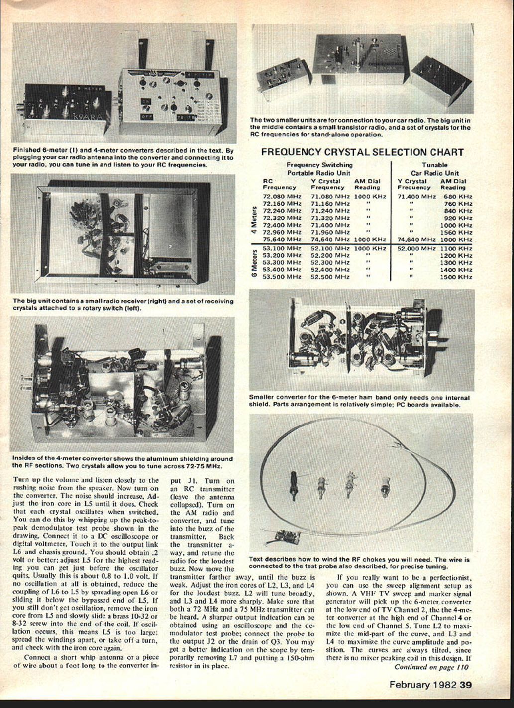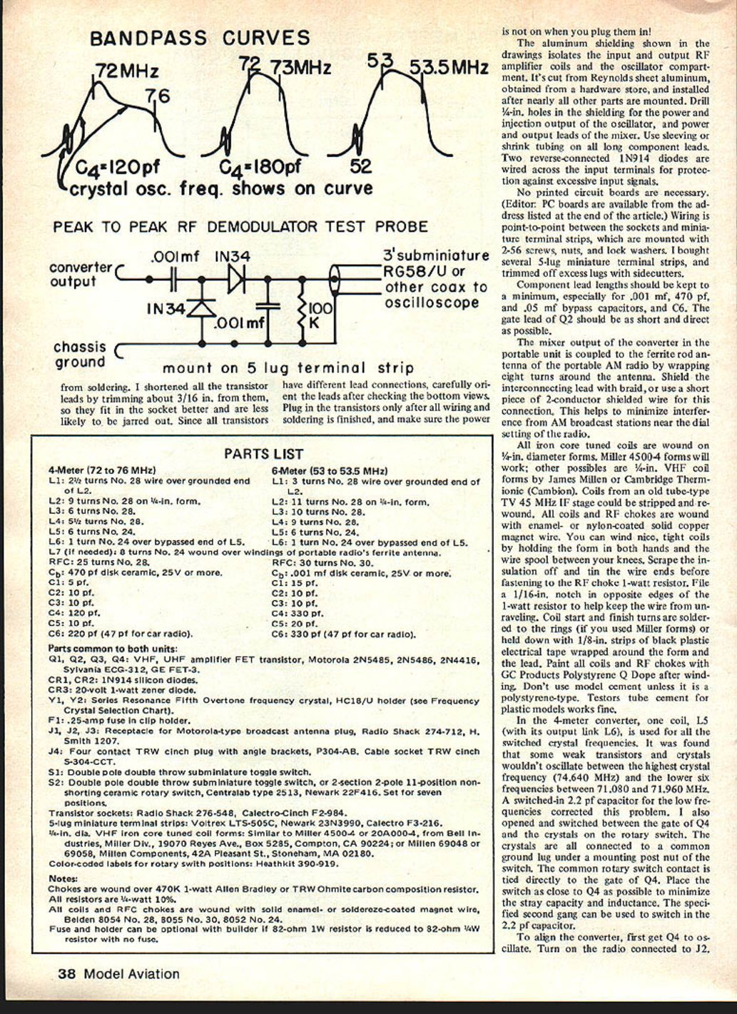 IIeceiViq CoqVerters NC Frequeqcies youve done some electronics work can find way around schematic heres building pro ject useful device converter allows listen RC fre quency portable radio club should have U John R Lange WOULD YOU LIKE able monitor RC frequency before fly chase down interference check giltches Would like sure some elses transmit ter impound area car hasnt left get glitched would like sure interference got am ham radio operator fly RC 6 meters 53 MHz wanted check band before flying since 6 meters can fested ignition engine noise amateur FM repeaters other things devel oped -this receiving converter circuits ARRL Radio Amateurs VHF Manual Anyone has built Heathkit Ace kit ought able build Most parts can easily obtained local Radio AC Frequency Monitor can easily mounted under car dash Just swap plugs switch between RC frequencies broadcast stations 4 METER AND 6 METER RC FREQUENCY CONVERTER IN 5 I/4x3Mx2 I/8 ALUMINUM BOX WITH UNDER DASH MOUNTING BRACKETS RADIO eOe eWe eOe ANTENNA 0 4 meter shown 6 meter has no 72-75 switch 2 0 eOe INPUT scale inches OL........1 3 4 METER AND 6 METER RC FREQUENCY RECEIVING CONVERTER PARTS LAYOUT IN 5 1/4 x 3x2 I/B ALUMINUM BOX BUDD CU 210GB CU-3006A RADIO SHACK 270-238 LMB 780 ALECTRO H4T741l/2x5/8cutout shield socket coil leads away chassis go gates drains leads closest chassis go terminal strip ground lugs bypass capacitors Cb Shack store receiving crystals can mallordered JAN Crystals International Crystals Addresses appear end article receiving converter can built either two ways version small mini box mounted under dash car uses cars whip antenna power fuse block Its connected car AM radio radio tuner selects chan nel want listen puts out car speaker listen radio simply turn off converter second version portable con tains its own pocket-size AM receiver 1 C U Cq o 10 0 0 U 0 0 S2 omitted 6 meter Cape inside nverters crystal iscover area rO between gate ground lug oNEINcNSCALE second version has seven-position rotary switch connected seven crystals can tune seven RC frequencies 4-me ter RC band way tune TV set first converter 6 meters hooked up car radio has two-FET-transistor cascode RF amplifier stage FET transistor mixer 52 MHz crystal-controlled FET transistor oscillator use 2-ft coaxial extension lead Moto rola male plugs connect car radio cord Part No 12-1314 Radio Shack listen RC frequencies unplug car antenna lead back antenna jack J3 plug front input Ji turn 36 Model Aviation eR @eQe e ee0 ONeBrW7208 680 01087216 760 0408 7224 840 ______Or-SO 7240 VoSO 7232 920 OFF727500-08 7296 1560 shielduse bottom hole 191of ground lugInsulat cbDL33Output RFC Cb4 RFC LI stand end wisleeveshield use sleevin 4-40 check clearanceY2 antennato fuse center pin tobngsleeving1-I25to shield use bottom hole gnd lugi-I45v 4 METER AND 6 METER RC FREQUENCY RECEIVING CONVERTER INTERNAL SHIELDS round off use 5052-H 32 sheet aluminum corners 0 0 o make bends vise dashed lines holes 3/32 diameter 10 A-I converter tune car radio tween 1100 1500 AM dial gives 531 MHz 1100 535 1500 pre-set two radio push-buttons correct spot two RC frequencies use just hit buttonjust like dialing AM station converter setup 4-me ter band 72 76 MHz works same way 4-meter converter can pick up sev en RC frequencies two receiving crystals Since first six frequencies tween 72080 72960 MHz less MHz apart 714 MHz crystal con verter local oscillator will aliow tune ali between 540 1600 radio diaL seventh frequency 75640 picked up switching 74640 crystal appears 1000 dial enough range either side bands receive adjacent interference sources get new frequencies hope tune weli portable converter has small under$10 Radio Shack AM pocket portable radio catalog number 12-171 12-172 tuned 1000 dial seven re ceiving crystals converter 1 MHz low corresponding RC frequency mounted poles rotary switch nine-volt battery series two AA pencells gives 12 volts needed convert er radio course has its own battery might consider building circuit aluminum box chassis case small car radio whip antenna instead pocket portable radio would allow power whole works 12-volt Gel Cell Ni-Cad pack also eliminates AM broadcasts pocket portable radio alignment G C6 I5ch pf__ --12v PORTABLERFC v--Gb OUTPUT FOR POCKET RECEIVER FUSE HOLDER MOUNTING DETAIL 25A fuse to~yJ424 scaleinchesIlockwt~T7i&I 0I23 Um~hiU LFLJ4-40x3/4 BOTTOM VIEW OF TRANSISTORS SG D DQ SQgroundD casecase round 2N5485 2N5486 ECG -312 Ddrain Ssource 2N4416 Ggate will occasionally pick up stations close 1000 dial Construction under-dash version converter built 51h x 3 x 2-1/8 alum inum mini-box portable version built cuVcEae 3ground lead short use 10 x 6 x 2 aluminum chassis bottom cover Physical parts placement fol lows schematic drawing inputs left outputs right oscillator section lower middle Sockets used transistors eliminate heat damage 4 METER AND 6 METER RECEIVNG CONVERTER FOR RC FREQUENCIES cascadeR F amplifiermixer RFC shield Cb IL3L4D QI SC6 70 CR1 _Cb. I8Cb 4 12v 1 r crystal controlled 33k local oscillator ll r~rmL1I output car O5mtradio SIA12 ant nna 121 Sib 25a CR3 i141145v 1 switch rotaryL switch tears 2 cryiols February 1982 37 About Author John R Lange has flying models since 1950s mostiy Free Flight Gas Old-Timer RC Assist Sailpianes systems engi neer microwave communications has worked TV tuner IF design John decided build RC frequency converters described after Dayton SAM Championships John tells us occasionally files seven-mile-square field converters handy see activity around since field large also help him work checking leakage communi cations equipment 70 MHz range would ordinarily have detec ted spectrum analyzer Presently member SOAR Lisle Aero RC Club John brings impressive technical skill bear RC interference problem BANDPASS CURVES 72MHz7 73MHz 535MHz 76 C4I2OpfC4l8Opf52 crystal osc freq shows curve PEAK TO PEAK RF DEMODULATOR TEST PROBE converter c output chassis ground 3 subminiature other coax oscilloscope mount 5 lug ter