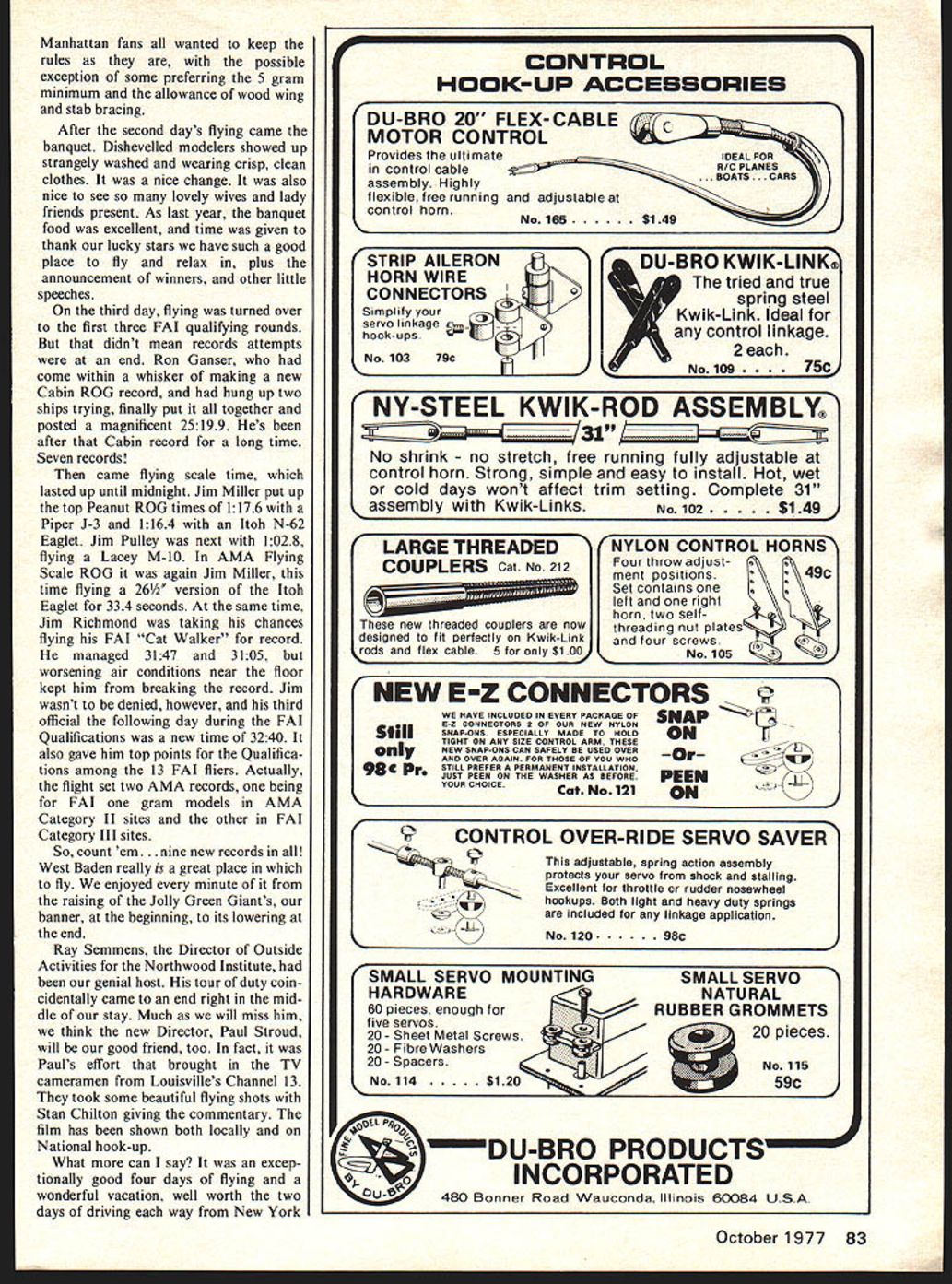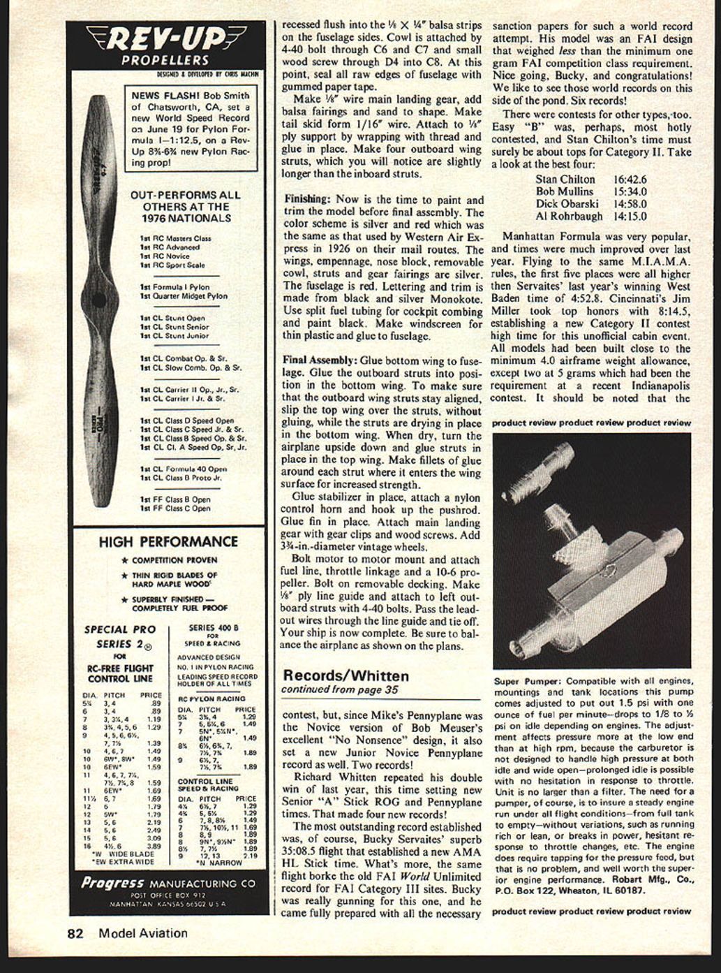 7211 OSE fair assume Record Trial time place set records Such being case should come no surprise grand total nine new Indoor Category II records set during June 2nd through 5th bash Northwood Institutes 96-foot Atrium West Baden Indiana scene Second Annual Na tional Indoor Model Airplane Societys Record Trials combined FAI door Team Qualification Contest North- South Central Regions great time should have living easy meals good accommodation rates inexpensive flying high quality Nine new marks set during four-day session fabulous Northwood Institute Atrium occasion 2nd Annual NIMAS Record Trials combined FAI Team QualificationE Ed Whitten West Baden fast becoming Mecca Category II flying rate going entire list Category II records will some day have set thereplus maybe Category helicopter record set dining room second year MIAMA club Florida sponsored event pewter mugs awarded broke approached existing records highest percentage Doc Martin hand see everything moved smoothly during first two days Ed Whitten took over CD FAI flying Top man Mike Van Gorder es tablished new Junior Pennyplane record 9314 gave him percentage index 20930 Novice Pennyplane included eligible event Continued page 82 following top eight places 90% better existing records NIMAS Index flying first two days 1 Mike Van Gorder 2 Richard Whitten 3 Richard Whitten 4 Bucky Servaites 5 Richard Doig 6 Stan Chilton 7 Ron Ganser 8 Robert Larsh Jr Sr Sr Op COp Cop COp COp Pennyplane Pennyplane Stick ROG HL Stick Stick ROG Paper Stick Cabin ROG HL Glider 20930% 11869% 10565% 10469% 9970% 9600% 9556% 9075% 9314 10039 11090 35085 15494 23140 22166 2096 Manhattan results 1 Jim Miller8155Miller Special42 grams 2 Dick Obarski7090Not Really40 3 Robert Larsh6150Trivaites Special52 4 Ron Williams *5501Yelloise43 5 Walt Van Gorder5174Jezebel51 6 Dick Hardcastle4302Uptown Manhattan40 * proxied Richard Whitten October1977 35 Top man NIMAS Record Trials Mike Van Gorder holding Meuser designed Pen nyplane pics author taken Trials Buck Servaites poses official photo world record model Its 38085 flight killed 2 birds 1 stonean PAl Category Ill record AMA Category II record Dick Oberski demonstrates tail boom attaches 2nd place Manhattan model Dick has active flier since 30s OUT-PERFORMS ALL OTHERS AT THE 1976 NATIONALS 1st AC Mastert Class 1st AC Advanced 1st AC Novice 1st RC Sport Scale 1st Formula Pylon 1st Quarter Midget Pylon 1st CL Stunt Open 1st CL Stunt Senior 1st CL Stunt Junior 1st CL Combat Op & Sr 1st CL Slow Comb Op & Sr 1st CL Carrier II Op Jr Sr 1st CL Carrier Jr & Sr 1st CL Class 0 Speed Open 1st CL Class C Speed Jr & Sr 1st CL Claw B Speed Op & Sr 1st CL Cl Speed Op Sr Jr 1st CL Formula 40 Open 1st CL Class B Proto Jr HIGH PERFORMANCE * COMPETITION PROVEN * THIN RIGID BLADES OF HARD MAPLE WOOD * SUPERBIY FINISHED COMPLETELY FUEL PROOF SERIES 400 B FOR SPEED NG ADVANCED DESIGN NO 1 IN PYLON RACING LEADING SPEED RECORD HOLDER OP ALL TIMES RC PYLON RACING DIA PITCHPRICE 5%354129 755h6149 7SN 5hN SN149 8% 65657 757%189 9857 757%189 CONTROL LINE SPEED & RACING DIAPITCHPRICE 4%657129 4%55%129 6788%149 77510511 169 889189 89N 95N189 85775189 91213219 N NARROW recessed flush /s X a strips fuselage sides Cowl attached 4-40 bolt through C6 C7 small wood Screw through D4 C8 point seal raw edges fuselage gummed paper tape Make 1/tn wire main landing gear add balsa fairings sand shape Make tail skid form 1/16 wire Attach support wrapping thread glue place Make four outboard wing struts will notice slightly longer inboard struts Finishing Now time paint trim model before final assembly color scheme silver red same used Western Air Ex press 1926 mail routes wings empennage nose block removable cowl struts gear fairings silver fuselage red Lettering trim made black silver Monokote Use split fuel tubing cockpit combing paint black Make windscreen thin plastic glue fuselage Final Assembly Glue bottom wing fuse lage Glue outboard struts posi tion bottom wing make sure outboard wing struts stay aligned slip top wing over struts gluing struts drying place bottom wing dry turn airplane upside down glue struts place top wing Make fillets glue around strut enters wing surface increased strength Glue stabilizer place attach nylon control horn hook up pushrod Glue fin place Attach main landing gear gear clips wood screws Add 3-in-diameter vintage wheels Bolt motor motor mount attach fuel line throttle linkage 10-6 pro peller Bolt removable decking Make sit ply line guide attach left out board struts 4-40 bolts Pass leadout wires through line guide tie off ship now complete sure bal ance airplane shown plans R ecords/Whitten continued page 35 contest since Mikes Pennyplane Novice version Bob Meusers excellent No Nonsence design also set new Junior Novice Pennyplane record well Two records Richard Whitten repeated double win last year time setting new Senior Stick ROG Pennyplane times made four new records outstanding record established course Bucky Servaites superb 3508 5 flight established new AMA HL Stick time Whats same flight borke old FAI World Unlimited record FAI Category III sites Bucky really gunning came fully prepared necessary sanction papers such world record attempt model FAI design weighed less minimum gram FAI competition class requirement Nice going Bucky congratulations like see world records side pond Six records contests other typestoo Easy B perhaps hotly contested Stan Chiltons time must surely about tops Category II Take look best four Stan Chilton Bob Mullins Dick Obarski Al Rohrbaugh 16426 15340 14580 14150 Manhattan Formula very popular times much improved over last year Flying same MIAMA rules first five places higher Servaites last years winning West Baden time 4528 Cincinnatis Jim Miller took top honors 8145 establishing new Category II contest high time unofficial cabin event models built close minimum 40 airframe weight allowance except two 5 grams requirement recent Indianapolis contest should noted product review product r