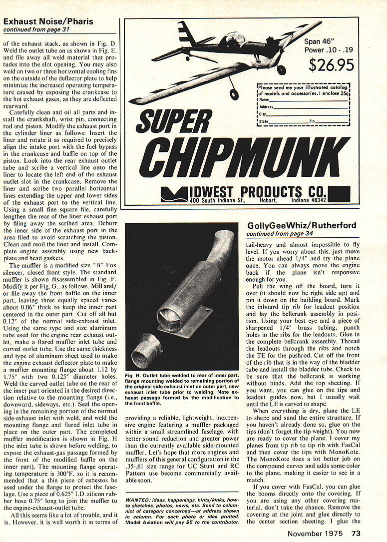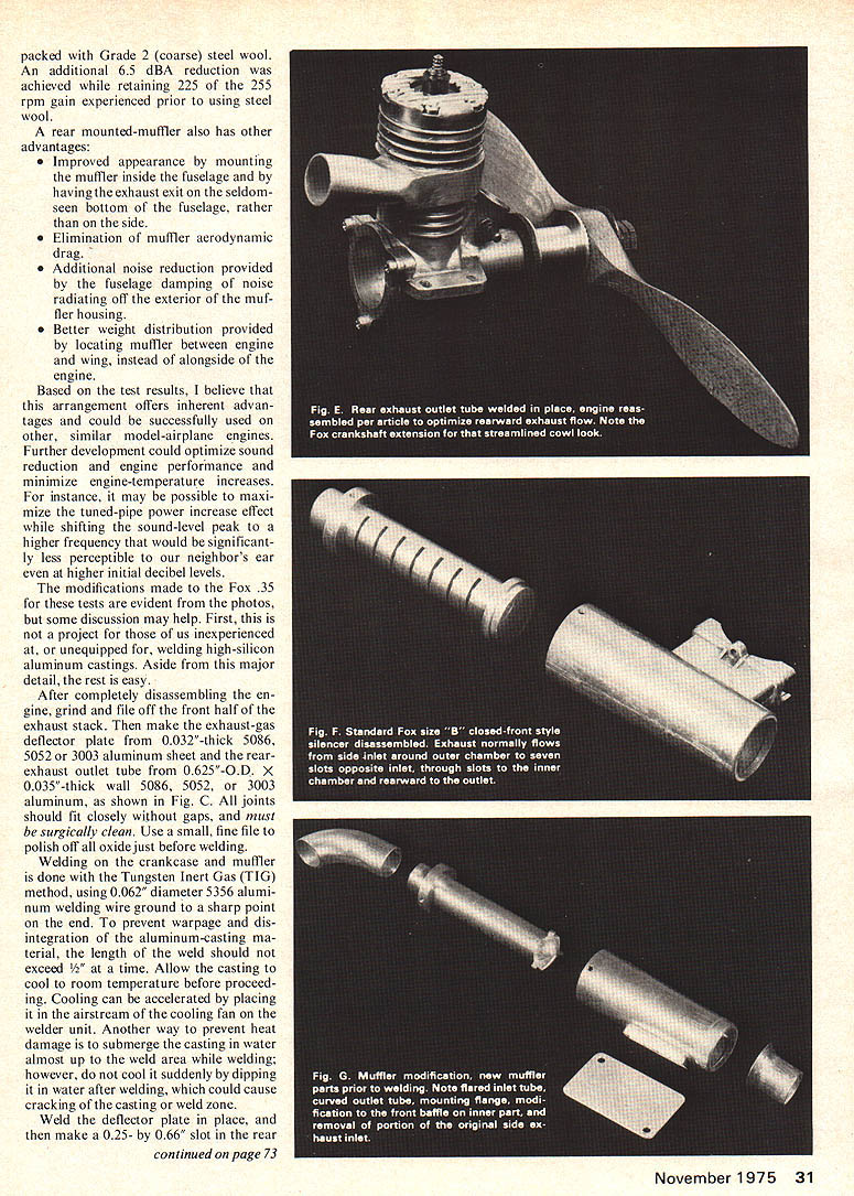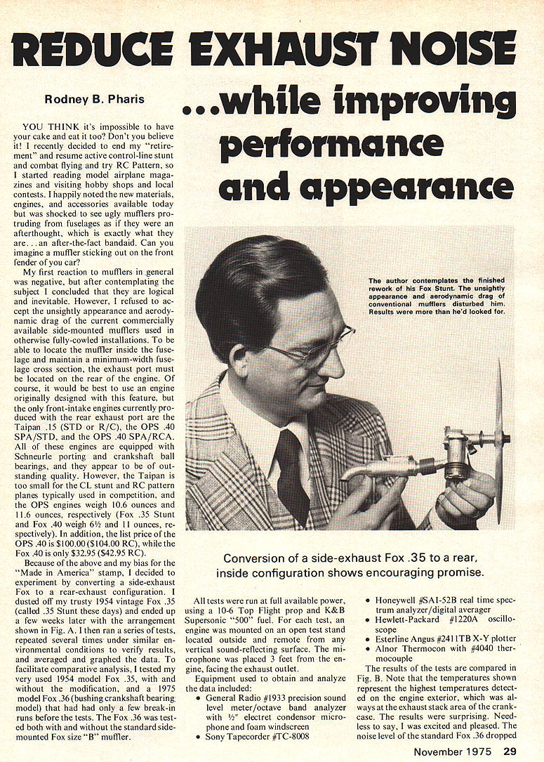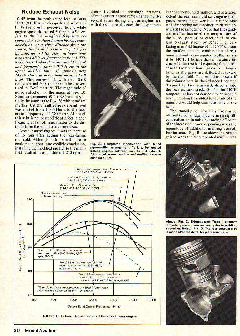 REDUCE EXHAUST NOiSE Rodney B Pharis YOU THINK its impossible have cake eat too Dont believe recently decided end retire ment resume active control-line stunt combat flying try RC Pattern started reading model airplane maga zines visiting hobby shops local contests happily noted new materials engines accessories available today shocked see ugly mufflers pro truding fuselages afterthought exactly what are. after-the-fact bandaid Can imagine muffler sticking out front fender car first reaction mufflers general negative after contemplating subject concluded logical inevitable However refused ac cept unsightly appearance aerody namic drag current commercially available side-mounted mufflers used otherwise fully-cowled installations able locate muffler inside fuse lage maintain minimum-width fuse lage cross section exhaust port must located rear engine course would best use engine originally designed feature front-intake engines currently pro duced rear exhaust port Taipan 15 STD R/C OPS 40 SPA/STD OPS 40 SPA/RCA engines equipped Schneurle porting crankshaft ball bearings appear out standing quality However Taipan too small CL stunt RC pattern planes typically used competition OPS engines weigh 106 ounces 116 ounces respectively Fox 35 Stunt Fox 40 weigh 6 11 ounces re spectively addition list price OPS 40 $10000 $10400 RC Fox 40 $3295 $4295 RC Because above bias Made America stamp decided experiment converting side-exhaust Fox rear-exhaust configuration dusted off trusty 1954 vintage Fox 35 called 35 Stunt days ended up few weeks later arrangement shown Fig ran series tests repeated several times under similar en vironmental conditions verify results averaged graphed data facilitate comparative analysis tested very used 1954 model Fox 35 modification 1975 model Fox 36 bushing crankshaft bearing model had few break-in runs before tests Fox 36 test ed both standard sidemounted Fox size B muffler .while improving performance appearance author contemplates finished rework Fox Stunt unsightly appearance aerodynamic drag conventional mufflers disturbed him Results d looked Conversion side-exhaust Fox 35 rear inside configuration shows encouraging promise tests run full available power using 10-6 Top Flight prop K&B Supersonic 500 fuel test engine mounted open test stand located outside remote vertical sound-reflecting surface mi crophone placed 3 feet en gine facing exhaust outlet Equipment used obtain analyze data included General Radio #1933 precision sound level meter/octave band analyzer tret condensor micro phone foam windscreen Sony Tapecorder #TC-8008 Honeywell j/SAI-52B real time spec trum analyzer/digital averager Hewlett-Packard #1220A oscillo scope Esterline Angus #241 ITB X-Y plotter Alnor Thermocon #4040 ther mocouple results tests compared Fig B Note temperatures shown represent highest temperatures detect ed engine exterior al ways exhaust stack area crank case results surprising Need less say excited pleased noise level standard Fox 36 dropped November1975 29 Reduce Exhaust Noise 10 dB peak sound level 3000 Hertz 90 dBA equals approximate ly all perceived level engine speed decreased 300 rpm dBA re fers -weighted frequency re sponse simulates human hearing charact ens tics given distance source general trend judge fre quencies up 1000 Hertz lower measured dB levelfrequencies 10006000 Hertz higher measured Db level frequencies 6000 Hertz upper audible limit approximately 14000 Hertz lower measured dB level corresponds l0-dB reduction 300- 400-rpm loss adver tised Fox literature magnitude noise reduction modified Fox 35 Stunt arrangement 92 dBA essen tially same Fox 36 standard muffler muffled peak sound level shifted 1500 Hertz lesscritical frequency 3500 Hertz Although shift perceptible 3 feet higher frequencies fall off much faster dis tance sound source increases Another surprising result increase 15 rpm after adding rear-facing manifold Although such small increase could support credible conclusion installing modified muffler mani fold resulted additional 240-rpm increase verified seemingly irrational effect inserting removing muffler several times during given engine run same results time ApparentFox 35 Stunt in/rear manifold wlo muffler 1134 dBA 9540 rpm 420F 110 Range sensitine human hearing Standard Fox 35 Stunt w/o muffler 1145 dBA 9525 rpm 300 F -77 Standard Fox 38 in/n mu e 1148 dBA 10200 rpm 305 F - 4----e] / 100 -J 0 z C N 0 C m 0 90 80 70 Standard Fox 36 wfstandard closed front fon muffler 11058 dBA 9900 rpm 390F{ Foe 35 Stunt in/rear manifold modfied Fox muffler 1053 dRA 97SOrpm440FII Foe 35 Stunt in/rear mandold modified Fox muffler packed steel wool 958 dBA 9750 rpm 455Fl Note Sound fecels approximarefy 2OdBA fosser measured 265 feet 8 meters engine II 2505001000 2000 4000800016000 Octane Band Center FrequencyHertz FIGURE B Exhaust Noise measured three feet engine ly rear-mounted muffler lesser extent rear manifold scavenge exhaust gases increasing power like tuned-pipe improving noise-reduction character istics same time Note stand ard muffler increased temperature hottest part exterior en gine exhaust stack 85eF rearfacing manifold increased 200F muffler combination rear manifold rear-mounted muffler raises l4OnF believe temperature crease result exposing crank case hot exhaust gases longer time gases deflected rearward manifold would occur exhaust port cylinder liner designed face rearward directly rear exhaust stack So far 4400F temperature has caused noticeable harm Cooling fins added side manifold would help dissipate some heat tuned-pipe efficiency also can utilized advantage achieving signifi cant reduction noise trading off some increased power depending upon magnitude additional muffling desired instance Fig B also shows results gained rear-mounted muffler 30 Model Aviation Fig Completed modification tuned pipe/muffler arrangement Tank located behind engine between mounts exhaust Air routed around engine muffler exits exhaust outlet Above Fig C Exhaust por