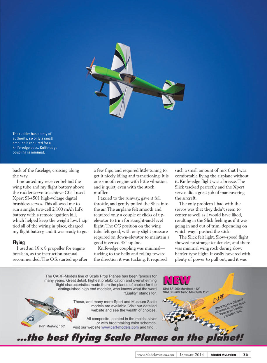 Knife-edge coupling was minimal—tucking to the belly and rolling toward the direction it was tucking. It required such a small amount of mix that I was comfortable flying the airplane without it. Knife-edge flight was a breeze. The Slick tracked perfectly and the Xpert servos did a great job of maneuvering the aircraft.