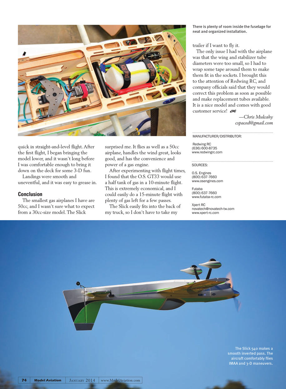 The smallest gas airplanes I have are 50cc, and I wasn’t sure what to expect from a 30cc-sized model. The Slick surprised me. It flies as well as a 50cc airplane, handles the wind great, looks good, and has the convenience and power of a gas engine.