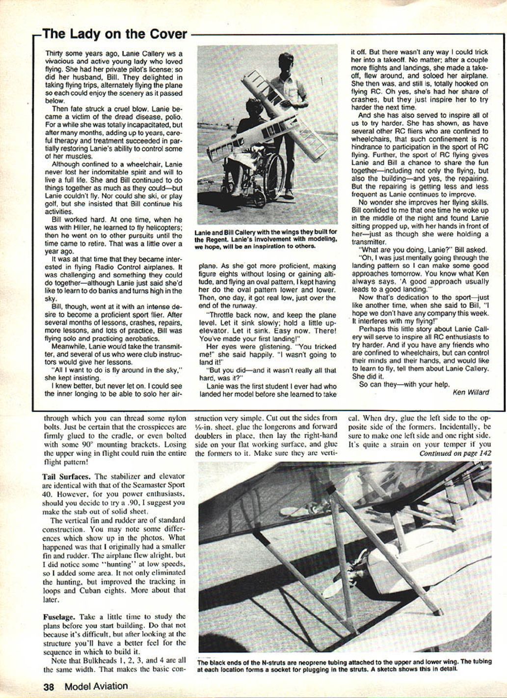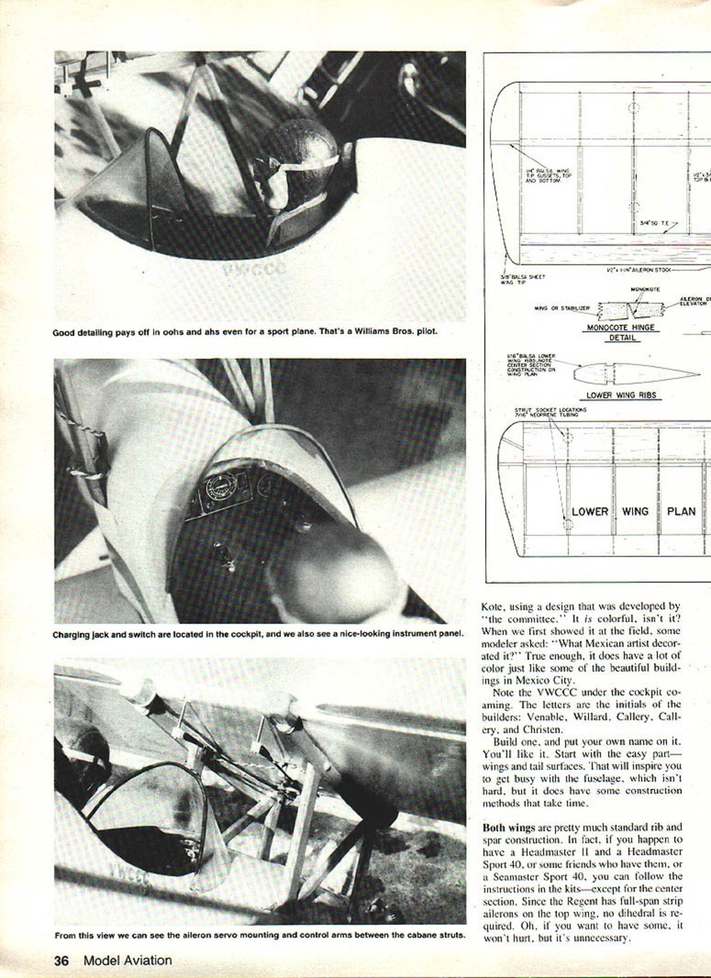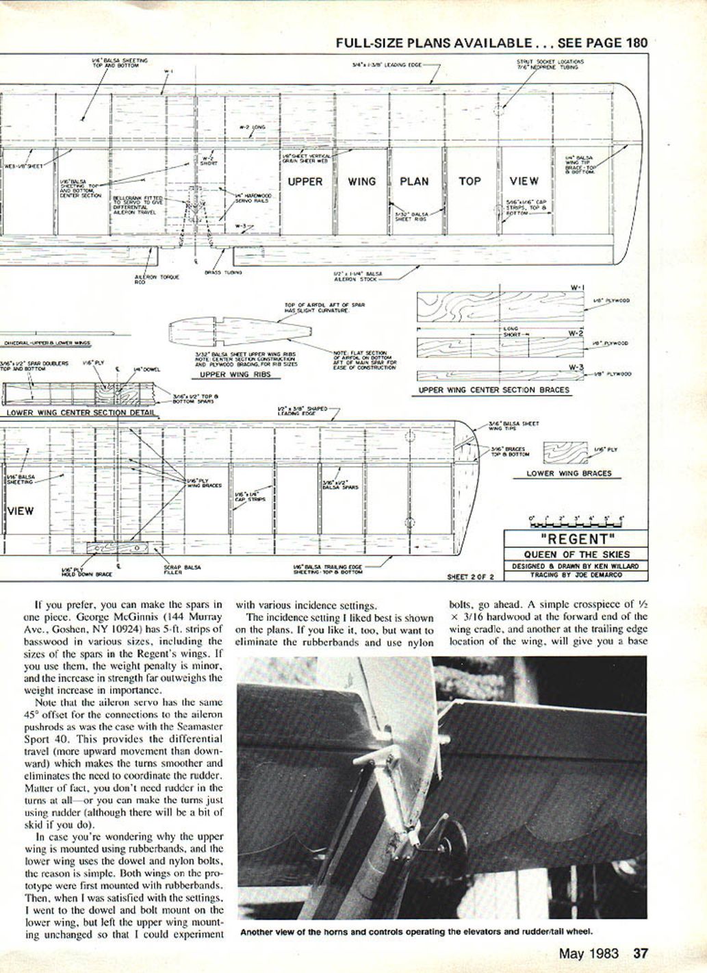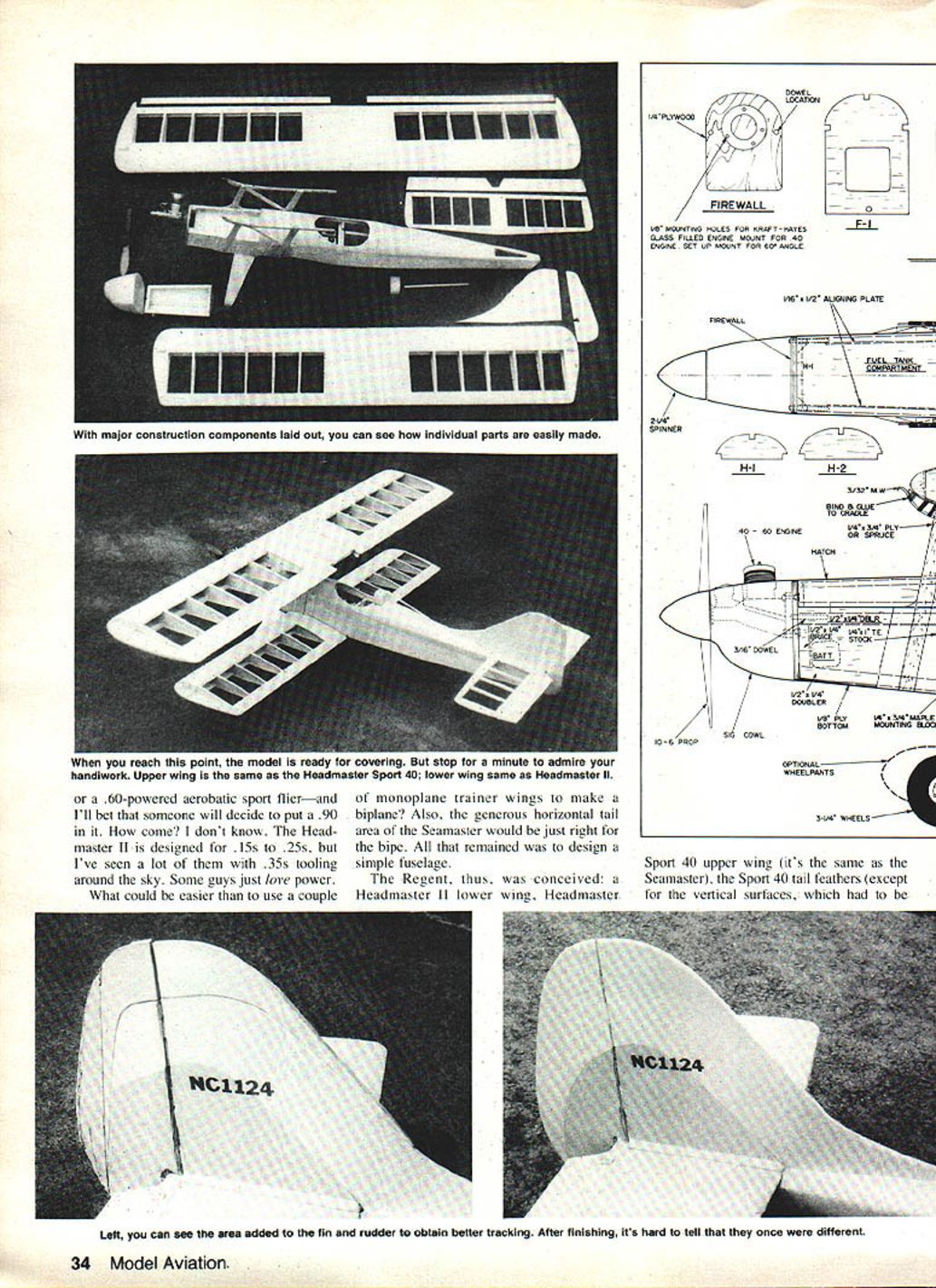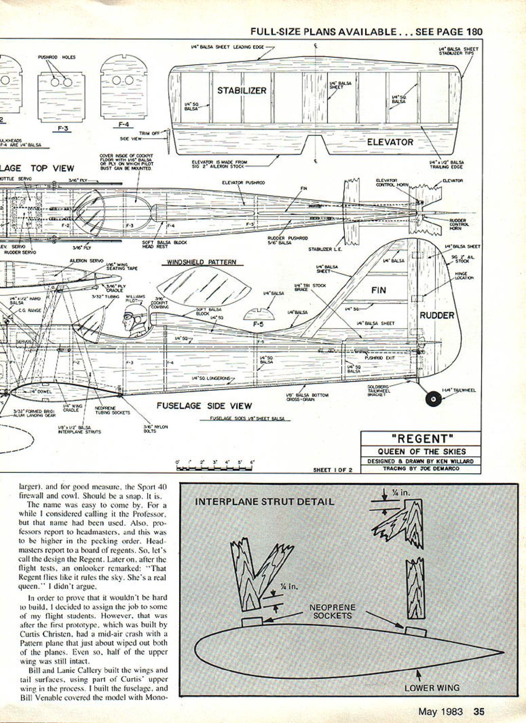 Big wheels mbination r s thing bi remark T r scheme top ne mm photos auest Shes real que m NO OCR TEXT beginner Seems modelers fly biplanes like hot performance Well lot us would like have nice biplane can handle learning soup up later hot performance about coming up sounded like interesting challenge First has easy build means conventional balsa plywood con struction least Fiberglass foam wings alright old-fashioned biplanes ribs spars longerons tougher parts building biplane open cockpit type cab ane structure Gotta keep simple Another requirement make good lookinglike biplanes Thirties Wacos Pitcairn Swallow Travelairall old-time beauties day out shop cleaning off Seamaster wing after some water fly ing As took over wing rack Headmaster II wing lay held Seamaster wing above moment before putting down Bingo An unequal-span sport biplane Just right size 40-powered trainer 32 Model Aviation Fuel tank removable hatch 40-size engine such K&B right training Move up 60 bipe aerobatics Cabane structure mounted outside fuselage sides adds lot overall strength easier install other methods boot its very noticeable airplane completely finished Author rubberbanded upper wing allow incidence adjustments necessary Instead could install hardwood crosspieces bolts Nothing unusual tail fittings Nyrod tube houses antenna VWCCC under cockpit coaming Initials stand participated building Regent L-R Bill Venable Ken Willard Lanie Callery Curtis Christen Bill Callery W2 I/B PLY3f 16 PLYWOCO SHORTCRADLES AlL LINKS AND TUBES SOLiD BLOCK1/4 SHEET-1/4 BALSA RUDDER / /I/4X11$1 LEI/4X 3/4 BALSA POSTAND LE 1/4 DORSAL /1/4 50 RIBS -2 SIG ALERON ii STOCK IS CNEPIECE I/4X1/2 ISPAR W- 2 I/B PLYWCOD LONG S PLYWOOD REINF LE 6 1/16 HEET HATCH WRAP F 10 5 V4 BULKHEADS I/4x i/a DOUBLERS H-I -2 1/4 FORMS ON 1/4 50 40-60ENGIrE ON TATONE MOUNT SIG PLASTIC COWL 1/4 PLThOOD FiREWALL I/4X 1/2 DOUBLER 1/4 X 3/4 piywooo OR SPRUCE CABANES 1/4 X T EDGE STOCK BOLT TO WING CRADLESBRACES FAIR CABANE / 1/16PtY SPARI JOINERSI I/4X 3/41 LiMOUNTS /1/4 BALSA 1/4 DOWEL IDOIJBIE spRWING SADDLE INTO DOUBLED - 4 RIBS OUT V4 C/L RIBS AS MNG LE/13/I&NYLON BOLTS 2 ANCHOR 3 1/4 WHEELS /32 BRIDI FORMED GEAR3I6 X /2 SPARS IN LOWER WING 7 I/4TAILWHEELON RUDDER STEER WIRE I/B BALSA SIDES ROTTOM /450 LONGERONS 3/32RIBSTOp WING I/16X I/4CAP STRIPS 0 T EDGE I/2X 11/4 AlL -STOCK 1/4 SHEET WING TIPS 3/BX 1/2 BALSA SPARS TCP-BOTTOM 3/4X 13/SI IBALSA L EDGE TOP WING 1/16 SH~ RIBS LOWER WINGS 1A6SHEET LECOVR-TOPABOfltt l/BX 1/2 BALSA STRUTS INTO NEOPRENE TUBING DCtENDS /2 X 3/B FORMED LEDGE SOCKS I/8BALSA WEBS TWO BAYS CtLY 60-powered aerobatic sport flierand Ill bet someone will decide put 90 come dont know Head master IL designed 15s 25s Ive seen lot 35s tooling around sky Some guys just love power What could easier use couple monoplane trainer wings make biplane Also generous horizontal tail area Seamaster would just right bipe remained design simple fuselage Regent thus conceived Headmaster II lower wing Headmaster DOWEL LOCATlON /4PLYWOOO FIREWALLo I/B MOUNTING HOLES FOR ERUFT-HAYES GLASS FILLED ENGINE MOUNT FOR 40 ENGINE SET UP MOUNT FOR 60 ANGLE 1A6 1/2 ALIGNING PLATE FIRE ALL FUEL TANK H-I G-LA SPINNER H-IH-2 0-6 PROP G/S2MW SING GLUE TO CRUOLE 40-60 ENGINEI/43A PLY OR SPRUCE HATCH .L ~STOC6 3A6 DOWELBRACT V2 OUBLER I/B PLYL4S/4MAPLE BOTTOMMOUNTING 5OO GIG COWL WHEELPANTS 3-1/4 WHEELS Sport 40 upper wing its same Seamaster Sport 40 tail feathers except vertical surfaces Left can see area added fin rudder obtain better tracking After finishing its hard tell once d4fterent 34 ModelAviatlon major construction components laid Out can see individual parts easily made vvnen reacn mis point toe rnuuei Ieuy iui uuering stop minute admire handiwork Upper wing same Headmaster Sport 40 lower wing same Headmaster II FULL-SIZE PLANS AVAILABLE. SEE PAGE 180 -70Th F-4___ TRIM OFF SIDE VIEW_____ COVER BARDE o cOcKPIT FLOOR WITH I/IA BALSA OR PLY ON WHICH PILOT BUST CAR BE MOIRTED IIISTABILIZERII/4LSA / III ELEVATOR 1/4I/2 BALSA TRAILW4G EDGE CONTROL HORN ITTLE SERVO3/IA PLYELEVATOR ELEVATORELEVATOR I----~------YV K 1___ I__ _____________TBBE-c IF-3 — F-4F51 — ------- __________________________________________RUDDER PtISI4ROO DAB BALSA / SOFT BALSA mOCK IVSERVO 3/TB PLYHEAD RESTSTABIUZER LE RUDDER SERVO AILERON SERVOWINGIHI LD RATTE N SA SEAliNG TAPE iw1i 5/TA PLYI/4TRI STOCK BADLEL4 BALSABRACEFIN 72 7 I/4 1/2 HARD\3/32 TUBNGWILLIAMSse BALSAMPILOTOCKPIT C G RANGECOMBNGSOFT BALSA1/4 50 YBLOCKL4 BALSA IL4SO IF-5I/K BALSA SHEET I_____________ _____ ____—F-5 _______ ______ RUDDER CONTROL HORN 114 BALSA SlEET L502AIL STOCK HINGE LOCATION RUDDER _ -__ __ ikDV ____ IIF3____BALSA __ ______-u fl ______ -__ ii J447Zc________ U I14SOLDNGEROT GOLDBERG TAILIAHEEL :/4 DOWEL vB BALSA BOTTOMBRACKET OTOSS -GRAIN I/A WINGFUSELAGE SIDE VIEW 3/32 FORMED BRIDICRADLETUBING SOCKETS .----ALUM LANONG GEAR FUSELAGE SISES 1/B SHEET BAI NA 1/B I/2 BALSA3/K NYLON RTERTLANE STRUTSBOLTS larger good measure Sport 40 firewall cowl Should snap name easy come considered calling Professor name used Also pro fessors report headmasters higher pecking order Headmasters report board regents So lets call design Regent Later after flight tests onlooker remarked lhat Regent flies like rules sky Shes real queen didnt argue order prove wouldnt hard build decided assign job some flight students However after first prototype built Curtis Christen mid-air crash Pattern plane just about wiped out both planes half upper wing still intact Bill Lanie Callery built wings tail surfaces using part Curtis upper wing process built fuselage Bill Venable covered model MonoMay 1983 35 PIJSHROO HOLES F-3 ILKHEAOS 4 ARE 114 BALSA AGE Top VIEW ELEVATOR IS MADE FROM Sb 2 AILERON STOCK 12345K SHEETIOFSI REGENT QUEEN OF THE SKIES NED S DRAW BY KEN WI TRACdG BY 30E DEMARCO Good detailing pays off oohs ahs sport plane Thats Williams Bros pilot I/O BALSA WINS TIP GUSSETS TOP ANT ROTTOR 3ROULSA SUCET II ill 34SG TE LZ -IAUICERON STO