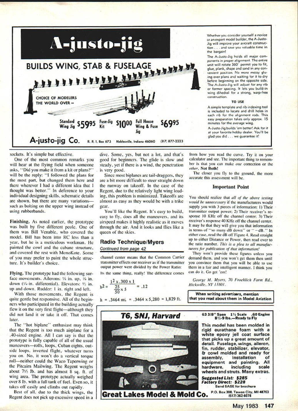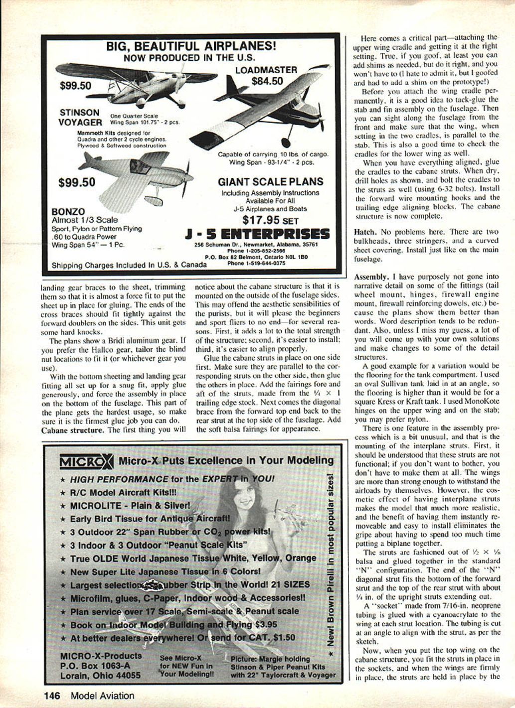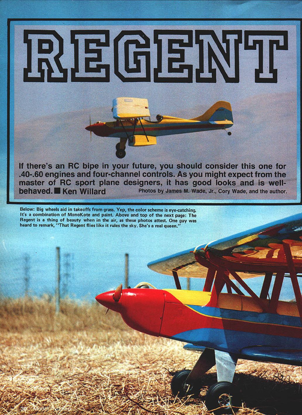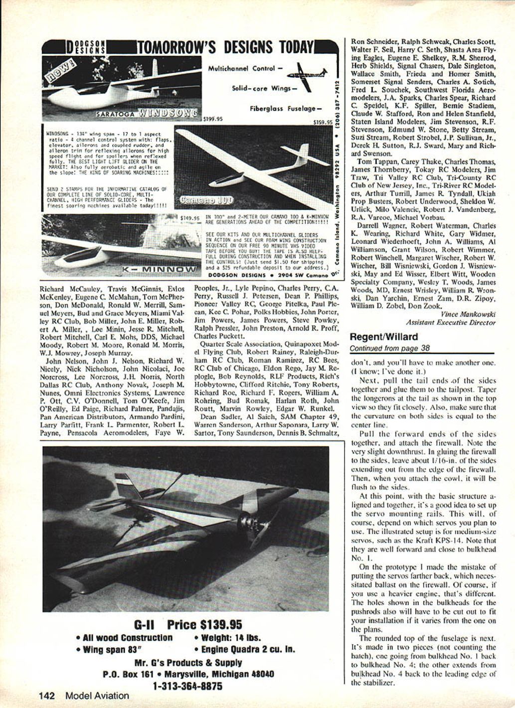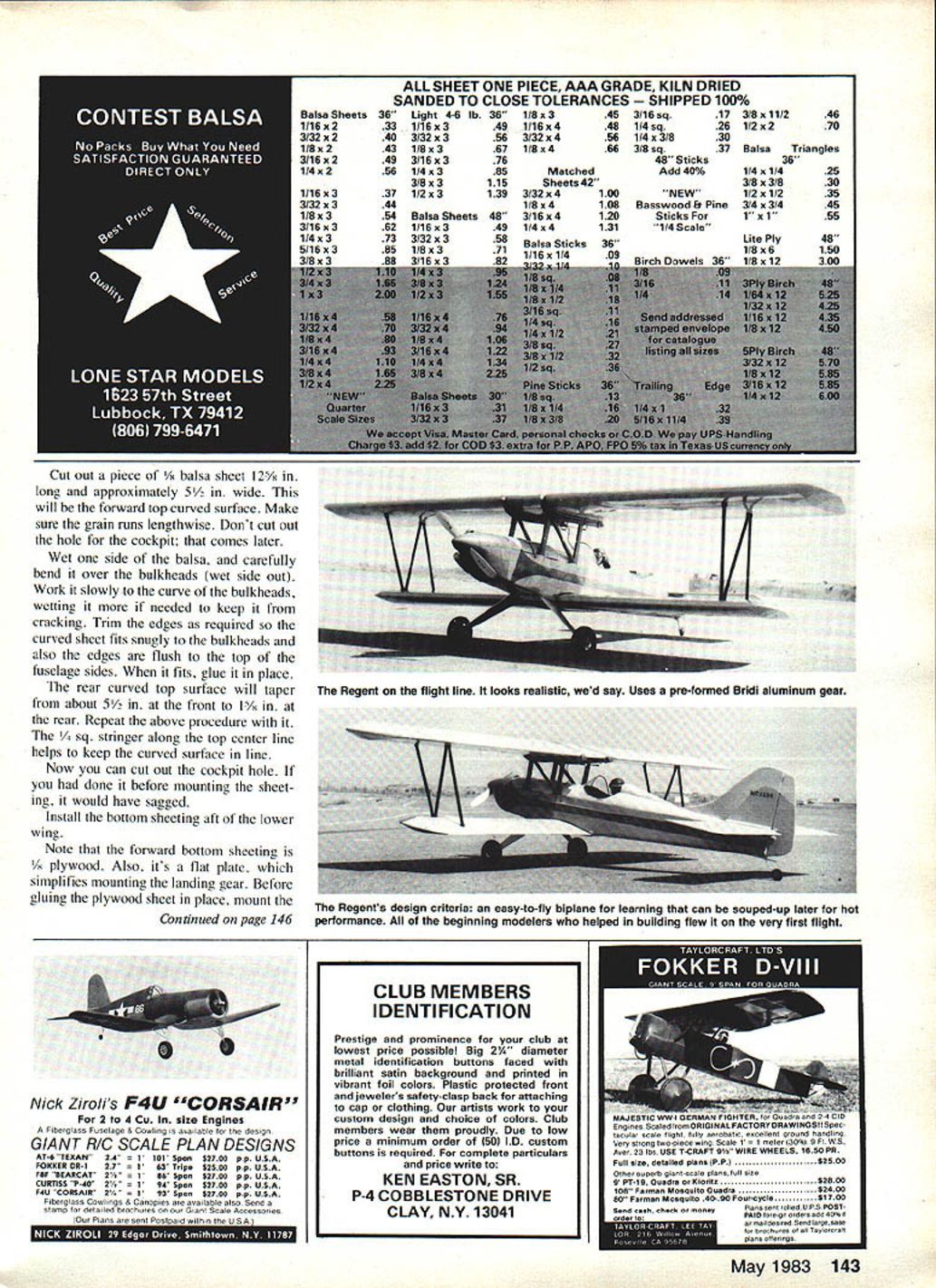 Big wheels mbination r s thing bi remark T r scheme top ne mm photos auest Shes real que m NO OCR TEXT beginner Seems modelers fly biplanes like hot performance Well lot us would like have nice biplane can handle learning soup up later hot performance about coming up sounded like interesting challenge First has easy build means conventional balsa plywood con struction least Fiberglass foam wings alright old-fashioned biplanes ribs spars longerons tougher parts building biplane open cockpit type cab ane structure Gotta keep simple Another requirement make good lookinglike biplanes Thirties Wacos Pitcairn Swallow Travelairall old-time beauties day out shop cleaning off Seamaster wing after some water fly ing As took over wing rack Headmaster II wing lay held Seamaster wing above moment before putting down Bingo An unequal-span sport biplane Just right size 40-powered trainer 32 Model Aviation Fuel tank removable hatch 40-size engine such K&B right training Move up 60 bipe aerobatics Cabane structure mounted outside fuselage sides adds lot overall strength easier install other methods boot its very noticeable airplane completely finished Author rubberbanded upper wing allow incidence adjustments necessary Instead could install hardwood crosspieces bolts Nothing unusual tail fittings Nyrod tube houses antenna VWCCC under cockpit coaming Initials stand participated building Regent L-R Bill Venable Ken Willard Lanie Callery Curtis Christen Bill Callery W2 I/B PLY3f 16 PLYWOCO SHORTCRADLES AlL LINKS AND TUBES SOLiD BLOCK1/4 SHEET-1/4 BALSA RUDDER / /I/4X11$1 LEI/4X 3/4 BALSA POSTAND LE 1/4 DORSAL /1/4 50 RIBS -2 SIG ALERON ii STOCK IS CNEPIECE I/4X1/2 ISPAR W- 2 I/B PLYWCOD LONG S PLYWOOD REINF LE 6 1/16 HEET HATCH WRAP F 10 5 V4 BULKHEADS I/4x i/a DOUBLERS H-I -2 1/4 FORMS ON 1/4 50 40-60ENGIrE ON TATONE MOUNT SIG PLASTIC COWL 1/4 PLThOOD FiREWALL I/4X 1/2 DOUBLER 1/4 X 3/4 piywooo OR SPRUCE CABANES 1/4 X T EDGE STOCK BOLT TO WING CRADLESBRACES FAIR CABANE / 1/16PtY SPARI JOINERSI I/4X 3/41 LiMOUNTS /1/4 BALSA 1/4 DOWEL IDOIJBIE spRWING SADDLE INTO DOUBLED - 4 RIBS OUT V4 C/L RIBS AS MNG LE/13/I&NYLON BOLTS 2 ANCHOR 3 1/4 WHEELS /32 BRIDI FORMED GEAR3I6 X /2 SPARS IN LOWER WING 7 I/4TAILWHEELON RUDDER STEER WIRE I/B BALSA SIDES ROTTOM /450 LONGERONS 3/32RIBSTOp WING I/16X I/4CAP STRIPS 0 T EDGE I/2X 11/4 AlL -STOCK 1/4 SHEET WING TIPS 3/BX 1/2 BALSA SPARS TCP-BOTTOM 3/4X 13/SI IBALSA L EDGE TOP WING 1/16 SH~ RIBS LOWER WINGS 1A6SHEET LECOVR-TOPABOfltt l/BX 1/2 BALSA STRUTS INTO NEOPRENE TUBING DCtENDS /2 X 3/B FORMED LEDGE SOCKS I/8BALSA WEBS TWO BAYS CtLY 60-powered aerobatic sport flierand Ill bet someone will decide put 90 come dont know Head master IL designed 15s 25s Ive seen lot 35s tooling around sky Some guys just love power What could easier use couple monoplane trainer wings make biplane Also generous horizontal tail area Seamaster would just right bipe remained design simple fuselage Regent thus conceived Headmaster II lower wing Headmaster DOWEL LOCATlON /4PLYWOOO FIREWALLo I/B MOUNTING HOLES FOR ERUFT-HAYES GLASS FILLED ENGINE MOUNT FOR 40 ENGINE SET UP MOUNT FOR 60 ANGLE 1A6 1/2 ALIGNING PLATE FIRE ALL FUEL TANK H-I G-LA SPINNER H-IH-2 0-6 PROP G/S2MW SING GLUE TO CRUOLE 40-60 ENGINEI/43A PLY OR SPRUCE HATCH .L ~STOC6 3A6 DOWELBRACT V2 OUBLER I/B PLYL4S/4MAPLE BOTTOMMOUNTING 5OO GIG COWL WHEELPANTS 3-1/4 WHEELS Sport 40 upper wing its same Seamaster Sport 40 tail feathers except vertical surfaces Left can see area added fin rudder obtain better tracking After finishing its hard tell once d4fterent 34 ModelAviatlon major construction components laid Out can see individual parts easily made vvnen reacn mis point toe rnuuei Ieuy iui uuering stop minute admire handiwork Upper wing same Headmaster Sport 40 lower wing same Headmaster II FULL-SIZE PLANS AVAILABLE. SEE PAGE 180 -70Th F-4___ TRIM OFF SIDE VIEW_____ COVER BARDE o cOcKPIT FLOOR WITH I/IA BALSA OR PLY ON WHICH PILOT BUST CAR BE MOIRTED IIISTABILIZERII/4LSA / III ELEVATOR 1/4I/2 BALSA TRAILW4G EDGE CONTROL HORN ITTLE SERVO3/IA PLYELEVATOR ELEVATORELEVATOR I----~------YV K 1___ I__ _____________TBBE-c IF-3 — F-4F51 — ------- __________________________________________RUDDER PtISI4ROO DAB BALSA / SOFT BALSA mOCK IVSERVO 3/TB PLYHEAD RESTSTABIUZER LE RUDDER SERVO AILERON SERVOWINGIHI LD RATTE N SA SEAliNG TAPE iw1i 5/TA PLYI/4TRI STOCK BADLEL4 BALSABRACEFIN 72 7 I/4 1/2 HARD\3/32 TUBNGWILLIAMSse BALSAMPILOTOCKPIT C G RANGECOMBNGSOFT BALSA1/4 50 YBLOCKL4 BALSA IL4SO IF-5I/K BALSA SHEET I_____________ _____ ____—F-5 _______ ______ RUDDER CONTROL HORN 114 BALSA SlEET L502AIL STOCK HINGE LOCATION RUDDER _ -__ __ ikDV ____ IIF3____BALSA __ ______-u fl ______ -__ ii J447Zc________ U I14SOLDNGEROT GOLDBERG TAILIAHEEL :/4 DOWEL vB BALSA BOTTOMBRACKET OTOSS -GRAIN I/A WINGFUSELAGE SIDE VIEW 3/32 FORMED BRIDICRADLETUBING SOCKETS .----ALUM LANONG GEAR FUSELAGE SISES 1/B SHEET BAI NA 1/B I/2 BALSA3/K NYLON RTERTLANE STRUTSBOLTS larger good measure Sport 40 firewall cowl Should snap name easy come considered calling Professor name used Also pro fessors report headmasters higher pecking order Headmasters report board regents So lets call design Regent Later after flight tests onlooker remarked lhat Regent flies like rules sky Shes real queen didnt argue order prove wouldnt hard build decided assign job some flight students However after first prototype built Curtis Christen mid-air crash Pattern plane just about wiped out both planes half upper wing still intact Bill Lanie Callery built wings tail surfaces using part Curtis upper wing process built fuselage Bill Venable covered model MonoMay 1983 35 PIJSHROO HOLES F-3 ILKHEAOS 4 ARE 114 BALSA AGE Top VIEW ELEVATOR IS MADE FROM Sb 2 AILERON STOCK 12345K SHEETIOFSI REGENT QUEEN OF THE SKIES NED S DRAW BY KEN WI TRACdG BY 30E DEMARCO Good detailing pays off oohs ahs sport plane Thats Williams Bros pilot I/O BALSA WINS TIP GUSSETS TOP ANT ROTTOR 3ROULSA SUCET II ill 34SG TE LZ -IAUICERON STO