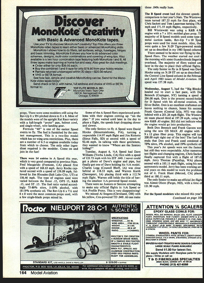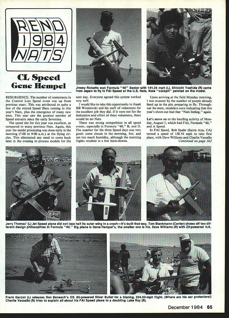 CL Speed Gene Heunpel RESURGENCE number contestants Control Line Speed event up previous years attributed quite few retired Speed fliers coming years Nats plus emergence new ones year saw greatest number Speed entrants since early Seventies speed site year excellent compared previous Nats Again year model processing done early morning 700 900 am flying cir cles eliminated need come back later evening process models next day Everyone agreed system worked very well would like take opportunity thank Bill Wisniewski staff volunteers excellent job did dedication effort volunteers would no Nats strong competition speed events especially Formula 40 B D weather three Speed days very good some clouds morning hot too much humidity although morning flights resulted few burn-downs Upon arriving field Monday morning stunned number people already lined up pits preparing fly Through out meet modelers indicating years shoot-out Nats feeling again Lets move bustling activity Mon day August 5 FAI Formula 40 Speed FAI Speed Bob Spahr Santa Ana CA turned speed 15854 mph take first place Dave Williams Charlie Vassallo Continued page 162 December 1984 65 1984 NPTS Jimmy Ricketta won Formula 40 Senior 14124 mph L Shinichi Yoshlda R came Japan fly FAI Speed US Nata Note cockpit painted model Jerry Thomas L Jet Speed plane did lose half its outer wing crashits built thai way Tom Biankmann Center ahows off two dif ferent design philosophies Formula 40 Big plane Gene Hempels smaller Dave Wliilams R Zit-powered 1/2A Frank Garzon L releases Don Beneachs OS 65-powered Silver Bullet biazing 20400-mph flight ear protectoral Charlie Vassailo R tries explain about FAI Speed plane doubting Luke Roy R ACCURATE ABLE -TOREAD ACCUTACH W IN TWO MODELS 3 FUNCTION ACCU-TACH 1 7995 Digital LCD tachometer has dual scale lOX-bOX stable RPM readout Full scale voltmeter can used check/cycle TXIRX battery com bos Reads load up 20 volts ACCESSORIES QSAl-Quarter Scale Adaptor ATi & AT2-500ma load . 995 SCAl -Servo Current Adaptor Airtronics Futaba Kratt. 995 4 FUNCTION ACCUTACH 2 Je 8995 Same useful capabilities ACCU-TACH 1 includes DC ammeter used check servo cur rent Will find worn bind ing stalled servo condi tions w/SCA1 Add function ATi Calij AVIONKSS INC Send check MO NorCal AVIONICS Inc PO Box 70956 Sunnyvale CA 94086 Calif add 60/0 tax Add $2 S&H See dealer first Nats CL CarrierlMazur Continued page 64 problems Junior Profile contestant Jane Johnson thin air combined tailwind resulted failure become airborne end deck first two attempts group effort father Art contestants produced borrowed fuel prop tank pit crew got air third attempt official flight first-place trophy Robbie Mehmen flew Naccarato-designed Zero first place Senior Profile 1825 points 100-point landing something two Open contestants would accom plish day Open Profile started battle between Pete Mazurs five-year-old GS Bearcat powered plain-bearing Tune-Hill 36 Bill Meltons original 38-in Guardian Mk IX 896 mph high 147 mph low speed Bearcat resulted 2608 score held up against Guardians faster high 904 mph slower low 101 mph Bills TWA 36 sagged just enough touch down before reaching deck Glen Magree other Open contestant make 100-point landing took second place 2202 points ST 36 S-powered Rolley Wildcat wasnt set quite right high speed 698 mph low 172 mph certainly respectable Tony Addie Naccarato both flew Profile year Tonys nonscale 28-in Black Mariah has extremely low aspect ratio long fuselage 156 mph low speed impres sive breeze 50-point landing put him out running Addies 32-in ME 109-2T showed close relationship Black Mariah same long nose tail moments stubby wings Event Director Roland Baltes felt model did close ly resemble prototype thus could given scale bonus points Tony Addie mally protested ruling sup ported CL Category Director Jim Ricketts backed Event Directors decision As consequence Tony has promised work Navy Carrier Society develop set guidelines judges contestants work Addie flew scale points took third place 2091 including 95-point landing Bob Reynolds flew original 37-in Skypirate 05 25 SRVFRDF engine interesting idea engine seemed have initials power high speed limited 539 mph No trends ap peared equipment wide variety airplanes engines being entered K&B 58s common five samples among 12 Open entries Bob Reynolds gave up opportunity fly order direct Class 1 Class 2 Roland Baltes limited activities other events direct Profile Both gentlemen did excellent job Rules according book strictly enforced events ran smoothly lot expert help relaxed atmosphere small turnout made event feel friendly local contest Navy Carrier Society held its annual meet ing Friday evening Convention Center presented traditional Eugene Ely Award 1984 Navy Carrier Champion Pete Mazur trophy awarded annually NCS person highest total score three classes competition Nats CL SpeedlHempi Continued page 65 14284 mph 14194 mph respectively majority FAI Speed fliers used old-style Rossi 15 engines quite few new 15-size engines market today should help anyone interested flying FAI speed type props used ma jority models single-blade design described previous issues regular Speed column Flying FAI Speed really takes dedicated modeler years Formula 40 event 23 Open entrants Senior really hectic because majority Formula 40 Speed fliers attempting three official flights Wisniewski team Bellflower CA placed first speed 15235 mph Glenn Lee Batavia IL close behind 14969 mph Tom Taverman Chicago IL third 14858 mph Gene Hempel Garland TX 14852 mph fourth place speeds Formula 40 very close K&B 65 engine dominating event Senior fly Formula 40 Jim Ricketts Sioux Falls SD speed 14124 mph Pretty Good Most Formula 40 fliers using different types glass props few homemade glass props use majori ty still using old Kelly 8 x 8 8 x 7 glass Continued page 164 Specifications Wing Area 1500 sq Span 7-2 Weight 20-25 lbs Engine 20-37 Fuselage Formers/Planking~ Wing Foam 3/32 Sheeting Stab Fin Solid Sheet cl