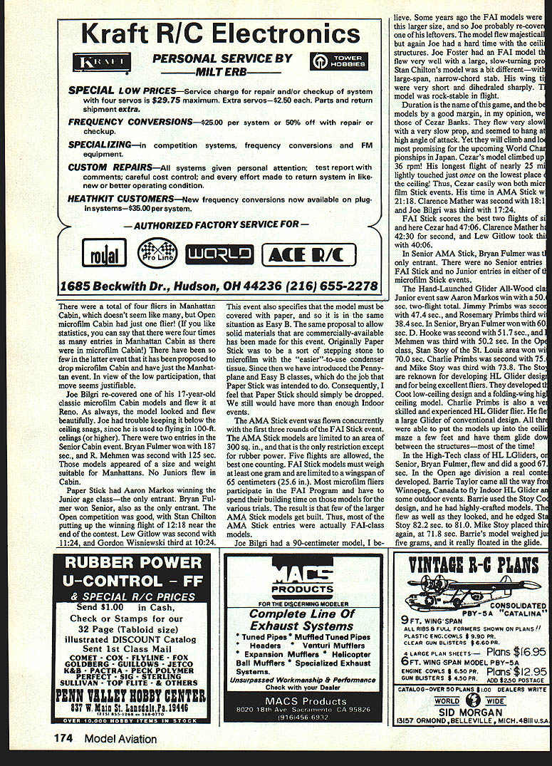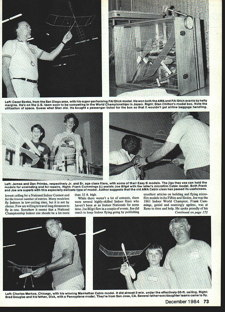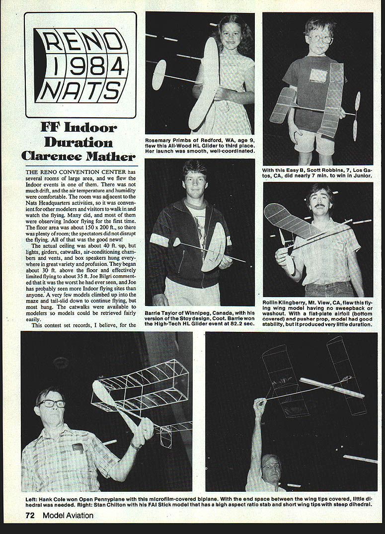 FF Indoor Duration Clarence Mather THE RENO CONVENTION CENTER has several rooms large area flew Indoor events much drift air temperature humidity comfortable room adjacent Nats Headquarters activities conven ient other modelers visitors walk watch flying did observing Indoor flying first time floor area about 150 x 200 ft plenty room spectators did disrupt flying good news actual ceiling about 40 ft -up lights girders catwalks alr-conditioning cham bers vents box speakers hung great variety profusion began about 30 ft above floor effectively limited flying about 35 ft Joe Bilgri comment ed worst ever seen Joe has probably seen Indoor flying sites anyone very few models climbed up maze tall-slid down continue flying hung catwalks available modelers models could retrieved fairly easily contest set records believe Left Hank Cole won Open Pennypiane microfilm-covered bipiane end space between wing tips covered little di hedral needed Right Stan Chilton FAI Stick model has high aspect ratio stab short wing tips steep dihedral 72 Model Aviation 1984 IRTS / Rosemary Primba Redford WA age 9 flew All-Wood HL Glider third place launch smooth well-coordinated Easy B Scott Robblns 7 Los Ga tos CA did nearly 7 mm win Junior Barrie Taylor Winnipeg Canada version Stoy design Coot Barne won High-Tech HL Glider event 822 sec Rollin Klingbernj Mt View CA flew fly ing wing model having no sweepback washout flat-plate airfoil bottom covered pusher prop model good stability butitproducedverylittleduration Left Cezar Banks San Diego area super-performing FAi Stick model won both AMA FAi Stick events hefty margins Hes US team soon competing World Championships Japan Right Stan Chiltons modei box Note utiiizatlon space Guess what Stan did bought passenger ticket box wouidnt get airilne baggage handling Left James Dan Primbs respectiveiy Jr Sr age ciass fiiers some Easy B modeis jigs use can hoid modeis unwinding repairs Right Frank Cummings L assists Joe Biigri atters microfiim Cabin modei Both Frank Joe superb especially delicate type model Author suggests old AMA Cabin ciass has passed its usefulness 35 high werent lot entrants several highly-skilled Indoor fliers havent Indoor Nationals some time Joe Bilgri flew couple events Joe did much keep Indoor flying going publishing lowest ceiling National Indoor Contest lowest number entries modelers fly Indoors low-ceiling sites choice Few willingto travel longdistancesto fly Somehow seems National Championship Indoor site should lot Left Charles Markos Chicago winning Manhattan Cabin model did almost 5 mm under effectively-35-ft ceiling Right Brad Douglas father Dick Pennyplane model Theyre San Jose CA Several fatherson/daughterteams came fly December 1984 73 excellent articles building flying micro film models Fifties Sixties Joe 1961 Indoor World Champion Frank Cum mings genial seemingly ageless Reno time help spoke proudly Continued page 172 KNIGHTS II PILOT BUSTS AND FULL FIGURES Scale Realism R/ C Aircraft Lightweight flexible super detailed t figures Nats FF Indoor ScalelWarner Continued page 71 ubiquitous Lacey M-1O carried off lions share gold first Junior Aaron Markos Senior Brian Fulmer seconds Junior Open Melinda Anderson Keith Fulmer respectively Conspicuously absent numbers biplanes Carlo Godel caine Nats five Italian airplanes superb 1918 Pomiio Bros Scout garnered 965 100 static scale points Lonnie Copes Fleet Biplane about Lonnie Currie Wot supersonic must have made Mach 9 its first flight bit less rubber foilowing attempts made much scalelike promenades Darryl Stevens Mission Viejo CA flew very nice Gossamer Mojave Condor Peanut Purists cling 13-in maximum span Peanuts may find hard see something twice span can considered Peanut new rules have pretty much changed things Condor under 9 fuselage now Peanut Also new Peanut rules time 1 0-sec ROG bonusor conversely 10-sec penalty choosing hand h CIVILIAN BUSTS NOW AVAILABLE 1/3 1/4 $695 1/5 $2OO shipping bust OUR HOBBY SHOP launch requirement have scale rulers part documentation though threeview required use ruler stipulation models flight points could exceed its static scale points modeler noted worst thing ever happened Peanut event get AMA rule book What would Nats some thing get people excited pleasure going Nats meeting people youve read about written etc over years such encounter Sherman Gillespie San Jose CA Nats since 1949 Master Glenny Henderson Sherman recently retired chosen profession teaching now has bit time well seeing great work soon enthusiastic fliers Brian Nelitz 15 never contest before though building models nine years wilds Ontario airplanes well-built flew great Ty Slade Reno nice Fokker D-8 showed promise Junior bit heavy side Special mention should also given fine models Frank John Godel Senior Johns Farman 451 real museum piece Franks Bleriot 7 flew realistically Lacey rivalry developed between Aaron kos took first Junior Peanut Melii Anderson took second Melinda came b outdoor event reverse order Ne get lady mad Aaron Open fearless Dick Baxters featherlij Old Ironsides what name waltzed off Wi laurels Harvey Lantz bit trouble Luton Minor Charlie c nard Roth never got board 1 courageous Bleriot tail-firster Competition keen Peanut seci action Clarence Mather havi gotten some pointers Brian Nelitz took fl easily l-oz Vee-Witt Keith Fuhnei fine Lacey M-10 grabbed second just ahead two old Flightmasters West duellists Chu Conovers Cougar Baxters Letov Bumbi bee Gossamer Condor took fifth follow lovely J-3 Cub flown Fred Anderso Sherman Gillespies vintage Gadfly Warne Curtiss-Reid parasol monoplane Carlo Gode SIA-76-1 bipe Copes speedy two-winger Te Koprivas nicely-built Bristol Mi-B Bill Gas son two superb White monoplanes 1 Don Block LaVon Armstrong V/hi monoplanes featured pilots flew amoi best models Summing up would have nice entries higher ceiling b all-in-all great meet hope didnt take advantage flying tli great Nats event will next time bail Nats FF md DuratlonlMathei Cont