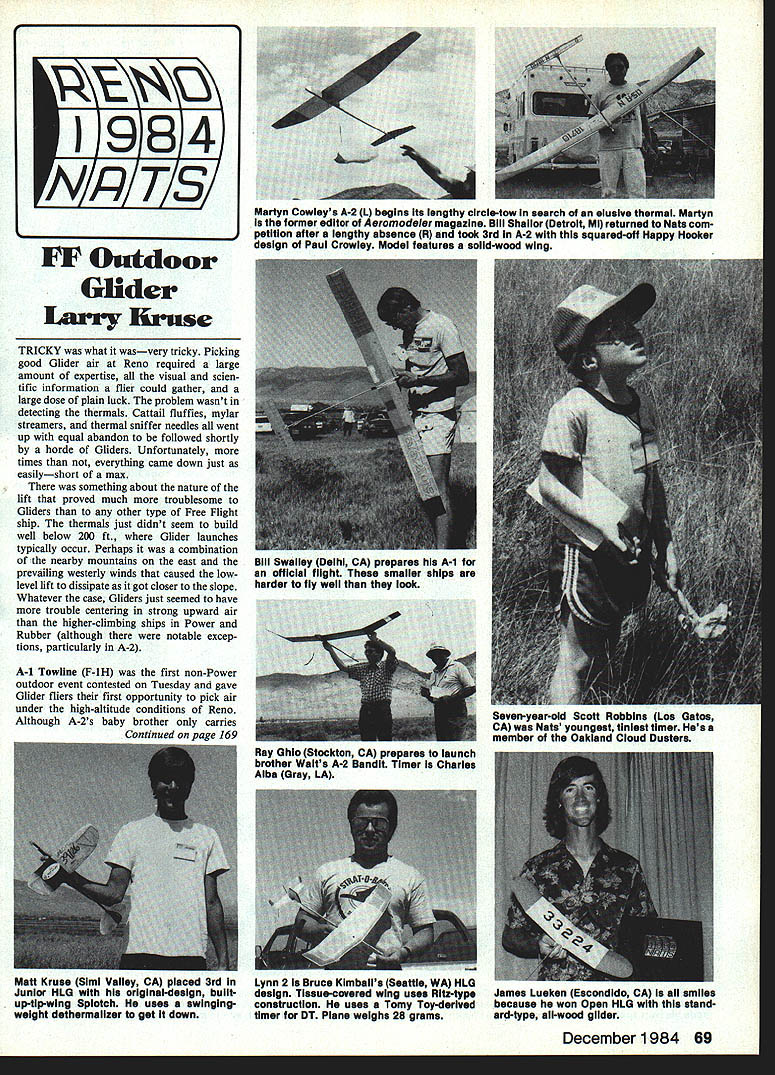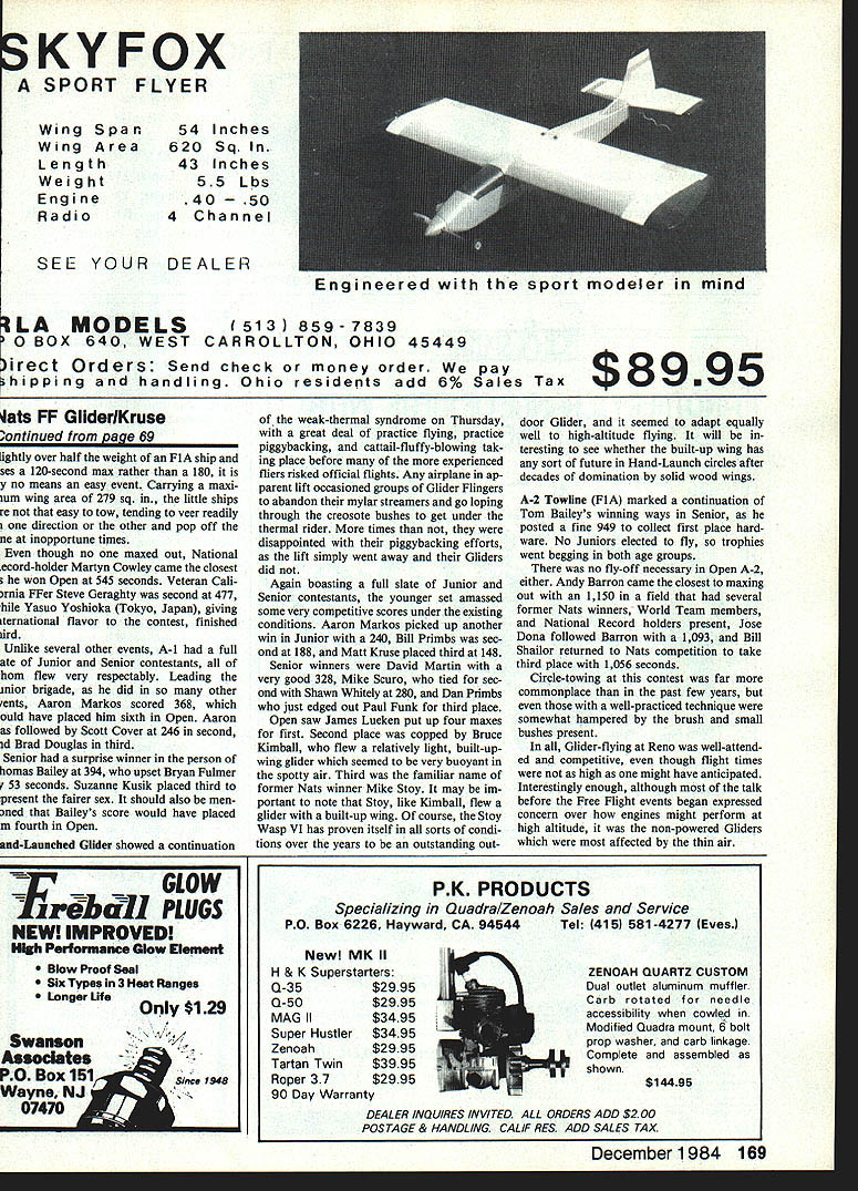 FF Outdoor Glider Larry Kruse TRICKY what wasvery tricky Picking good Glider air Rena required large amount expertise visual scien tific information flier could gather large dose plain luck problem wasnt detecting thermals Cattail fluffies mylar streamers thermal sniffer needles went up equal abandon followed shortly horde Gliders Unfortunately times everything came down just easilyshort max something about nature lift proved much troublesome Gliders other type Free Flight ship thermals just didnt seem build well below 200 ft Glider launches typically occur Perhaps combination nearby mountains east prevailing westerly winds caused lowlevel lift dissipate got closer slope Whatever case Gliders just seemed have trouble centering strong upward air higher-climbing ships Power Rubber although notable excep tions particularly A-2 A-i Towline F-lH first non-Power outdoor event contested Tuesday gave Glider fliers first opportunity pick air under high-altitude conditions Reno Although A-2s baby brother carries Continued ~gp 160 Martyn Cowisys A-2 L begins its lengthy circle-tow search siusive thermai Martyn former editor Aeromadeler magazine Biii Shaiior Detroit Mi returned Nets com petition after lengthy absence R took 3rd A-2 squared-off Happy Hooker design Paul Crowley Model features solid-wood wing December 1984 69 1984 NPTS Bill Swailey Delhi CA prepares A-i official flight smaller ships harder fly well look Ray Ghio Stockton CA prepares launch brother Waits A-2 Bandit Timer Charles Aiba Gray LA Seven-year-old Scott Robbins Los Gatos CA Nats youngest tinIest timer Hes member Oakland Cloud Dusters Matt Kruse Simi Valley CA placed 3rd Junior HLG originai-design bulit up-tip-wing Spiotch uses swingingweight dethermalizer get down Lynn 2 Bruce Kimballs Seattle WA HLQ design Tissue-covered wing uses Ritz-type construction uses Tomy Toy-derived timer DT Plane weighs 28 grams James Lueken Escondido CA smiles because won Open HLG stand ard-type all-wood gilder S KY FOX SPORT FLYER Wing Span Wing Area Length Weight Engine Radio SEE YOUR 54 Inches 620 Sq 43 Inches 55 Lbs 4050 4 Channel DEALER LA MODELS513 859-7839 0 BOX 640 WEST CAR ROLLTON OHIO 45449 irect Orders Send check money order pay hippi ng handling Ohio residents add 6% Sales Tax $8995 4ats FF GllderlKruse Thntinu4d aae 69 ightly over half weight FIA ship ses 120-second max rather 180 y no means easy event Carrying maxi jum wing area 279 sq little ships re easy tow tending veer readily direction other pop off ne inopportune times though no maxed out National ecord-holder Martyn Cowley came closest won Open 545 seconds Veteran Cali rnia FFer Steve Geraghty second 477 hile Yasuo Yoshioka Tokyo Japan giving ternational flavor contest finished iird Unlike several other events A-i full ate Junior Senior contestants hom flew very respectably Leading inior brigade did other vents Aaron Markos scored 368 ould have placed him sixth Open Aaron followed Scott Cover 246 second nd Brad Douglas third Senior surprise winner person homas Bailey 394 upset Bryan Fulmer y 53 seconds Suzanne Kusik placed third present fairer sex should also men oned Baileys score would have placed im fourth Open aad-Lauuclned Glider showed continuation weak-thermal syndrome Thursday great deal practice flying practice piggybacking cattail-fluffy-blowing tak ing place before experienced fliers risked official flights Any airplane ap parent lift occasioned groups Glider Flingers abandon mylar streamers go loping through creosote bushes get under thermal rider times disappointed piggybacking efforts lift simply went away Gliders did Again boasting full slate Junior Senior contestants younger set amassed some very competitive scores under existing conditions Aaron Markos picked up another win Junior 240 Bill Primbs sec ond 188 Matt Kruse placed third 148 Senior winners David Martin very good 328 Mike Scuro tied sec ond Shawn Whitely 280 Dan Primbs just edged out Paul Funk third place Open saw James Lueken put up four maxes first Second place copped Bruce Kimball flew relatively light built-upwing glider seemed very buoyant spotty air Third familiar name former Nats winner Mike Stoy may im portant note Stoy like Kimball flew glider built-up wing course Stoy Wasp VI has proven itself sorts condi tions over years outstanding outdoor Glider seemed adapt equally well high-altitude flying will teresting see whether built-up wing has sort future Hand-Launch circles after decades domination solid wood wings A-2 Towhee FlA marked continuation Tom Baileys winning ways Senior posted fine 949 collect first place hard ware No Juniors elected fly trophies went begging both age groups no fly-off necessary Open A-2 either Andy Barron came closest maxing Out 1150 field several former Nats winners World Team members National Record holders present Jose Dona followed Barron 1093 Bill Shailor returned Nats competition take third place 1056 seconds Circle-towing contest far commonplace past few years well-practiced technique somewhat hampered brush small bushes present Glider-flying Reno well-attend ed competitive though flight times high might have anticipated Interestingly enough although talk before Free Flight events began expressed concern over engines might perform high altitude non-powered Gliders affected thin air GLOW iirb@11 PLUGS NEWI IMPROVEDI HIgh Pgrfonnrnce Glow Element Blow Proof Seal Six Types 3 Heat Ranges Longer Life Only $129 Swanso~ PO Box 151Since 1948 Wayne N 07470 NewI MK II H & K Superstarters 0-35$2995 0-50$2995 MAG II$3495 Super Hustler$3495 Zenoah$2995 Tartan Twin$3995 Roper 37$2995 90 Day Warranty ZENOAH QUARTZ CUSTOM Dual outlet aluminum muffler Carb rotated needle accessibility cowled Modified Quadra mount 6 bolt prop washer carb linkage Complete assembled shown $14495 DEALER INQUIRES IN V/TED ALL ORDERS ADD $200 POSTAGE & HANDLING CALIF RES ADD SALES TAX December 1984 169 Engineered sport moocler mind PK PRODUCTS Specializing Quadra/Zenob Sales Service PO Box 6226 Haywa