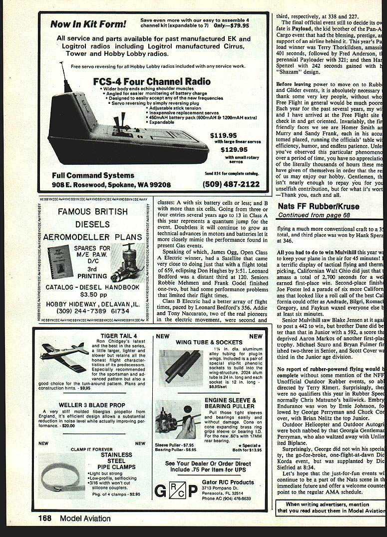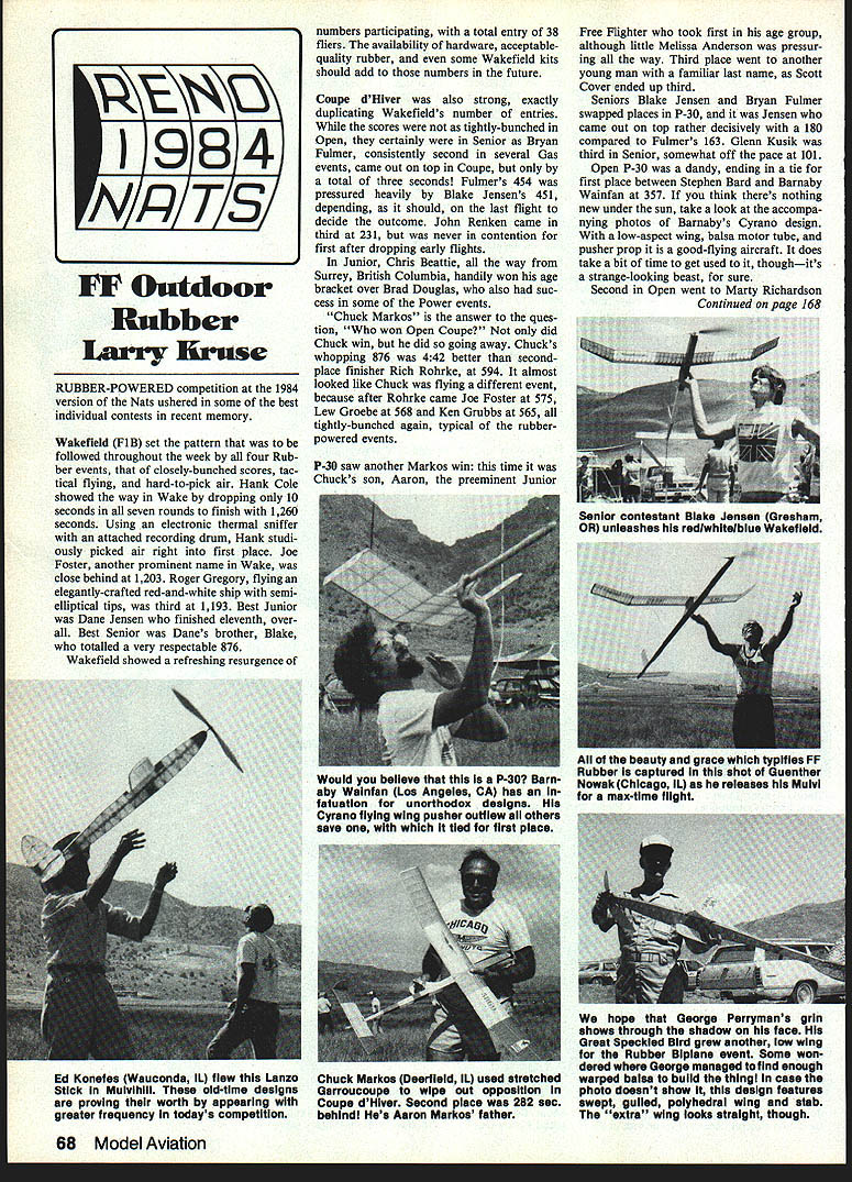 FF Outdoor Rubber Larry Bruise RUBBER-POWERED competition 1984 version Nats ushered some best individual contests recent memory Wakefield FIB set pattern followed throughout week four Rub ber events closely-bunched scores tac tical flying hard-to-pick air Hank Cole showed way Wake dropping 10 seconds seven rounds finish 1260 seconds Using electronic thermal sniffer attached recording drum Hank studi ously picked air right first place Joe Foster another prominent name Wake close behind 1203 Roger Gregory flying elegantly-crafted red-and-white ship semielliptical tips third 1193 Best Junior Dane Jensen finished eleventh over Best Senior Danes brother Blake totalled very respectable 876 Wakefield showed refreshing resurgence numbers participating total entry 38 fliers avallability hardware acceptablequality rubber some Wakefield kits should add numbers future Coupe dHlver also strong exactly duplicating Wakefields number entries scores tightly-bunched Open certainly Senior Bryan Fulmer consistently second several Gas events came out top Coupe total three seconds Fulmers 454 pressured heavily Blake Jensens 451 depending should last flight decide outcome John Renken came third 231 never contention first after dropping early flights Junior Chris Beattie way Surrey British Columbia handily won age bracket over Brad Douglas also suc cess some Power events Chuck Markos answer ques tion won Open Coupe did Chuck win did going away Chucks whopping 876 442 better secondplace finisher Rich Rohrke 594 almost looked like Chuck flying different event because after Rohrke came Joe Foster 575 Lew Groebe 568 Ken Grubbs 565 tightly-bunched again typical rubberpowered events P-30 saw another Markos win time Chucks son Aaron preeminent Junior Free Flighter took first age group although little Melissa Anderson pressur ing way Third place went another young man familiar last name Scott Cover ended up third Seniors Blake Jensen Bryan Fulmer swapped places P-30 Jensen came out top rather decisively 180 compared Fulmers 163 Glenn Kusik third Senior somewhat off pace 101 Open P-30 dandy ending tie first place between Stephen Bard Barnaby Wainfan 357 think theres nothing new under sun take look accompa nying photos Barnabys Cyrano design low-aspect wing balsa motor tube pusher prop good-flying aircraft does take bit time get used thoughits strange-looking beast sure Second Open went Marty Richardson Continued page 168 h 68 Model Aviation 1984 11PT3 Senior contestant Blake Jensen Gresham OR unleashes redlwhitelbiue Wakefisid Wouid beiieve P-30 Barn aby Wsinfan Los Angeiss CA has fatuation unorthodox designs Cyrano fiying wing pusher outfiew ali others save tied first piace Au beauty grace typifies FF Rubber captured shot Guenther Nowak Chicago ii reieases Muivi max-time fiight Ed Konef Wauconda ii flew Lanzo Stick Mulvihili old-time designs proving worth appearing greater frequency todays competition Chuck Markos Deerfield iL used stretched Garroucoupe wipe out opposition Coupe dHiver Second place 282 sec behindi Hes Aaron Markos father hope George Perrymans grin shows through shadow face Great Speckled Bird grew another low wing Rubber Biplane event Some won dered George managed find enough warped balsa build thingl case photo doesnt show design features swept gulied polyhedral wing stab extra wing looks straight though Now Kit Form HO5S vii Itt SWAYIIO teYN lDr AWAYHO 55Th IDS AWAYNO StYli IDE AWAY FAMOUS BRITISH DIESELS AEROMODELLER PLANS ES M/E PAw D/C 3rd PRINTING CATALOG -DIESEL HANDBOOK $350 pp HOBBY HIDE WAY DELAVANIL 309 244-7389 61734 YIIISEAWAYHSBSyHIDEAWAYCOBBYI-IIOEAWAYHOSSYIIDEAw TIGER TAIL 4 Chidgeys latest best n sees att e age ghte sowe etana honest f ght cha acte tat cs p edecesso Espec y ecommended sportsman ad vanced pattern also good choice turn-around pattern Plans construction hints -$995 WELLER 3 BLADE PROP very stiff molded fiberglas propelior England Its efficient design shows substantial reduction noise level actually improving per formance $2000 NEW NEW CLAMP IT FOREVER STAINLESS STEEL PIPE CLAMPS Light strong Low-profile selfiocking 3/16 width wont cut silicone couplers Pkg 4 clamps $295 $11995 wIth large lleesr serves $12995 wIth small rotary servos Seed S5 complete cetelo 509 487-2122 classes six battery cells less B six cells Going three four entries several years ago 13 Class year represents quantum jump event Doubtless will continue grow technical advances motors batteries let closely mimic performance found present Gas events Speaking James Ogg Open Class Electric winner Satellite came very close doing just flight total 659 eclipsing Don Hughes 351 Leonard Bedford distant third 120 Seniors Robbie Mehmen Frank Godel finished one-two some performance problems limited flight times Class B Electric better array flight times paced Leonard Bedfords 356 Addie Tony Naccarato two real pioneers electric movement second NEW NEW WING TUBE & SOCKETS 1 dia aluminum alloy tubing plug-in wings Included pair special slip-fit phenolic sockets build wing-structure 2024 alum tube 24 long socket 12 long $8O5lset ENGINE SLEEVE & BEARING PULLER Pull tight sleeves snd bearings easily damage Cone cone expanding brass ring grips sleeve bearing ID new 60s 17MM rear bearing * Special * Both $1395 See Dealer Order Direct Include 75 Per Item f UPS GP Gator RIC Products 3713 Pompano Dr Pensacola FL 32514 Phone AC 904 476-6639 168 Model Aviation third respectively 338 227 final official event still decide its ov fate Payload kid brother Pan-A Cargo event blessing prestige ai support airline behind years Pa load winner Terry Thorkildsen amassii 401 seconds followed Fred Anderson t perennial Payloader 321 Har Spenzel 242 seconds galned Shazam design Before leavIng power move Rubb Glider events absolutely necessary thank some very key people Free Flight general would much poort year past several years wi have arrived Free Flight site check get oriented Invariably fir friendly faces see Homer Smith Murry Sandy Frank ac