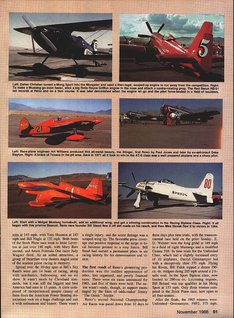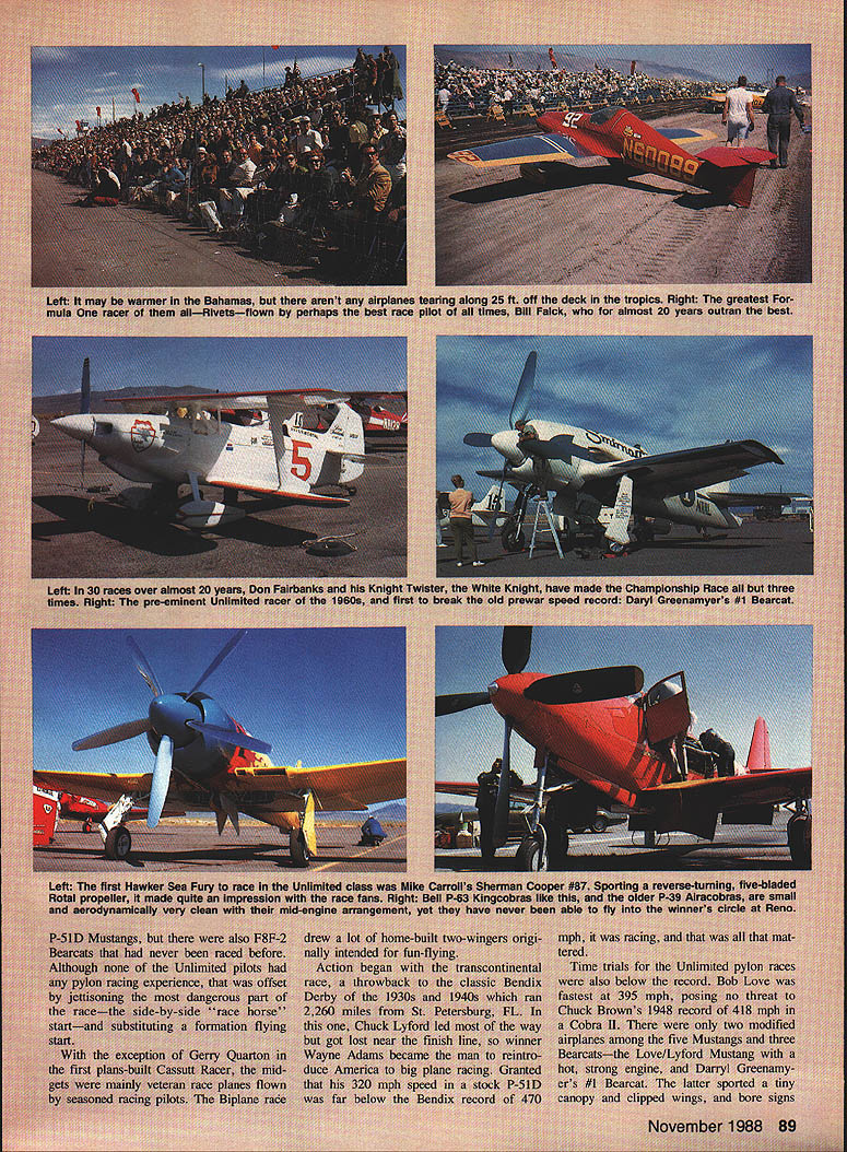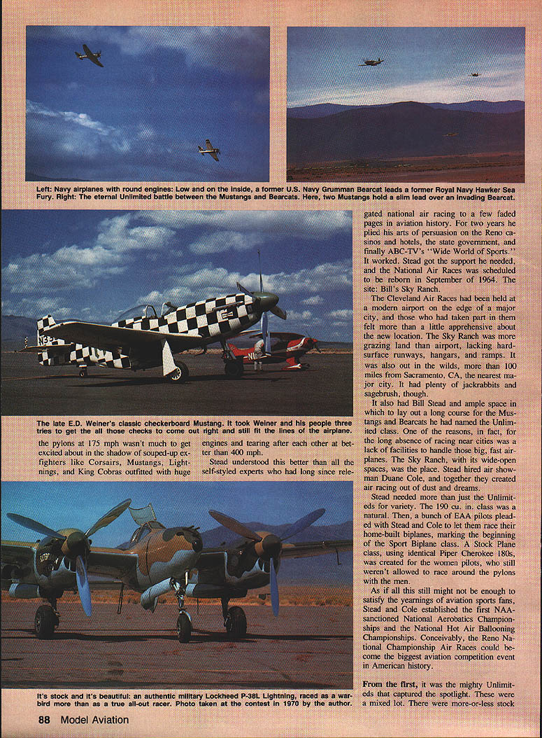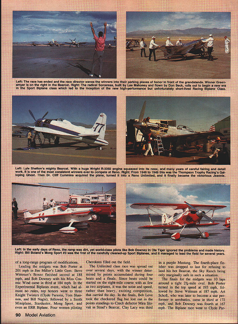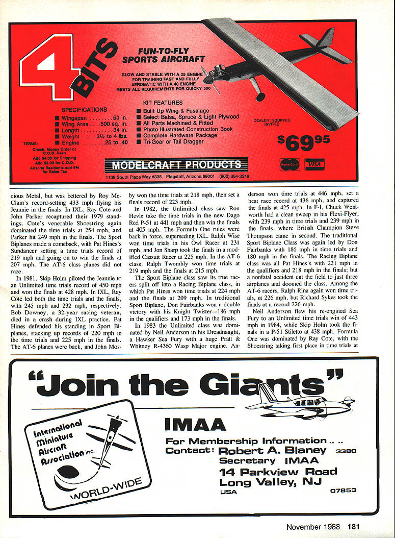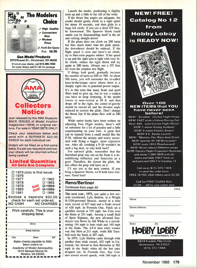 NO OCR TEXT NO OCR TEXT NO OCR TEXT NO OCR TEXT NO OCR TEXT ri cii F U Sten thetranso 92 Model Aviation 418 its wig ev nani inking 39 k time rceth mob ba e old n ms pylor Connie h ompe lass ays winning less un took Un u w caking 19 Ray Cote w finals al mted ag lap mphb initial na mph ntI ufir rnyer Thu finals ean sweep m ig 182 mph finals inther 0mph Haydoi comi finals S OUt tC 220 Sport WOB 1975 July first issue 1976 197701982 197801983 1979-9-4-9641980-9--4-9&5198101986 i0 0 0 i0 Enclose separate $2200 check set ordered NO CASH NO CHARGES I I I I I r Print carefully shipping label II II Name II Street Addresa HStateZIP II Make checks payable AMA Send orders Academy Model Aeronautics 1810 Samuel Morse Dr Reston VA 22090 Linrnrn. urn urn ml Launch model positioning slightly nose up little left wind thrust line angles adequate model should gently climb right spiral about 10 seconds glide large left circle use short DT fuse forewarned Sparrow Hawk could startle disassembling itself air coming straight down plane does climb 200 turns flies much faster glide speed downthrust should reduced flight speed slow theres no climb try find some peppier rubber speed up right turn tight very lit tle climb reduce right thrust try again 200 turns Always use DT fuse simplest test flight things look good gradually increase number turns 650 700 about 500 turns will encounter so-called knee-in-the-torque curve sharply rapid rise potential power output Its zone Scale sport fliers tend give up win contest have keep trimming model zooms near-vertical 50 ft drops off right center-of-gravity should moved aft elevator angle reduced correct glide Dont change thrust line plane flew well 200 turns entire books have written adjusting Free Flight models theres still no substitute lot practice litfie experimenting own great deal can learned small model like P-30 anxiety worry associ ated flying bigger expensive After crashing P-30 wouldnt such big deal hold back optimal glide remember freewheel prop way out front de stabilizing influence functions gyro Therefore slower glide less effect prop will have Ill see next contest bring Sparrow Hawk well both have win ners Good luck Reno/Berliner Continued page 92 next year 1973 saw quite few rec ords overturned Lyle Shelton Wright R-3350-powered Bearcat turned time trials record 427 mph finals record 428 mph Formula Falck set qualifier record 235 mph Cote won finals 231 mph Among small field Sport Biplanes new all-metal Sundancer flown Sid White recordsetting 194 mph time trials 195 mph finals AT-6 time trials winner Jim Mott 211 mph Bill Turnbull took finals 207 mph 1974 Lyle Shelton came through another time trials record 432 mph Un limited bowed Ken Burnstine 382 mph finals hot ones dropped out Formula Ray Cote also scored record speeds 240 mph Name Street Address city State Zip HOBg RNATIONAL iNc November 1988 179 Modelers aioice High Quality Convenient Size Modest Price Jr Kwik Set Epoxy 5 OL $695 Gas Model Products 8773 Russet Dr Cincinnati OH 45239 dealer call 513-385-7398 order direct add *1 50 postage AMA INATONAII CENTENFOR Collectors Notice Just released AMA Museum BACK ISSUES Model Aviation magazinesNEW original car tons sale YEAR SETS ONLY Check selections below send SEPARATE $2200 CHECK individual set Orders will filled first-come basis set request sold out check will returned being cashed Limited Quantities Sets Are Complete L VIA VdUU UM Curtiss Jenny * Quality hand-cut kit complete plans rigging scale control setup wire parts pre-bent special hardware included parts individually indentified packaged Decals Major Decal * Engine sizes 20 40 ES 25 TS * Wing unit removes four screws less 3 minutes flying wires left intact * Superb flight characteristics Introductory Price *13900 VISA erCard y Order Michigan residents add 4% sales tax Add $550 PH US orders $1250 foreign Video Catalog $1250 post mci VHS/Beta $5 rebate return tape kit order Reg catalog sample mini-plan $2 Hand-Cut Quality Affordable Price AERODROME MODELS LTD 2623 S Miller Rd __Saginaw Ml 48603 -517 781-3000 Other Kits Available Aero-Pacer Baby -Pacer Gipsy Moth Rybaby Flybaby Combo Hawker Hurricane Jester --2 certified coecko money ordem accepted Minimum order $tO three packagen 4 Poonerpolen 53 per package httXt shipping handlingl CT reoldeorn add 70% oateh taO Pncen oubject change mithouf notice DEALER INQUIRIES INVIThO further jnformatioo deu n p con send SASE Boniness Card SERMOS RIC SNAP CONNECTORS Corlar Comets Station Box 16787 Stamford 0106906 203322-6294 Three sizes available Small Medium Large WINDOW FLANGE 1iIft $295 Price 150 inch 250 350 Fourmost Window Flange flexible black Vinyl strip preformed make perfect flange As well securing window place Fourmost Window Flange provides realistic black outline inconvenience tape Fourmost Window Flange easy install rectangular well contoured windows just razor blade CA adhesive FOURMOST PRODUCTS 4040 24TH AVEFOREST GROVE OR 97116 time trials 235 mph finals al though some doubts raised about legality engine Sid White again ruled Sport Biplane event records 199 mph time trials 198 mph finals Being more-or-less stock AT-6s slower flying Roy McClain won time trials 212 mph Pat Palmers 211 mph cap tured finals Nineteen seventy-five exciting year Greenamyer back mighty Bearcat setting Unlimited dine trials rec ord 436 mph Sheltons 430 mph also record won finals Formula dominated Ray Cote record 242 mph qualifiers win fi nals 228 mph Sport Biplane class Sid White broke 200-mph barrier Sundancer 205 mph time trials Don Beck hit 199 mph Sorceress set finals record AT-6 class saw Pat Palmer take time trials 213 mph fi nals 207 mph 1976 Unlimited time trials record broken again time Don Whit tington 439 mph P-S 1 Lefty Gard ner doing 380 mph near-stock P-S 1 took finals really fast ones failed finish F-I Judy Wagner came first woman winner time trials 232 mph Shoestring Vince De Luca won finals 229 mph Owl Racer Don Becks Sorceress dominated Sport Biplanes r