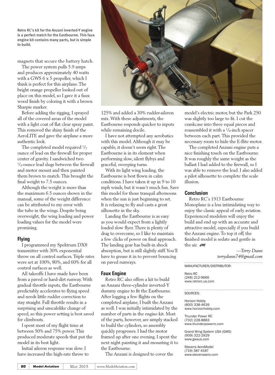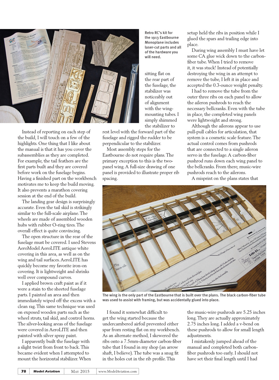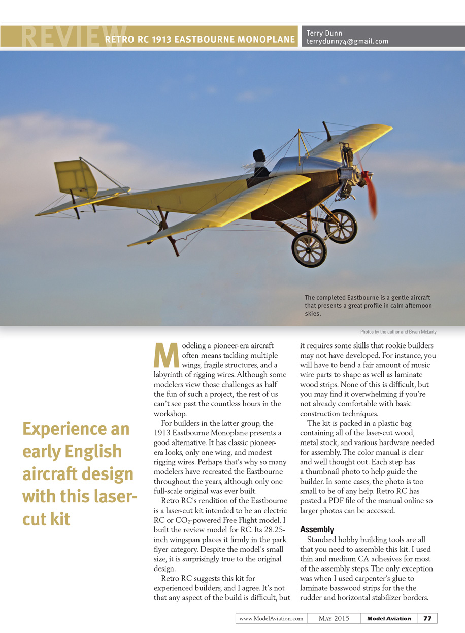 Retro RC’s 1913 Eastbourne Monoplane is a less intimidating way to enjoy the classic appeal of early aviation. Experienced modelers will enjoy the build and end up with an accurate and attractive model, especially if you build the Anzani engine. To top it off, the finished model is sedate and gentle in the air.