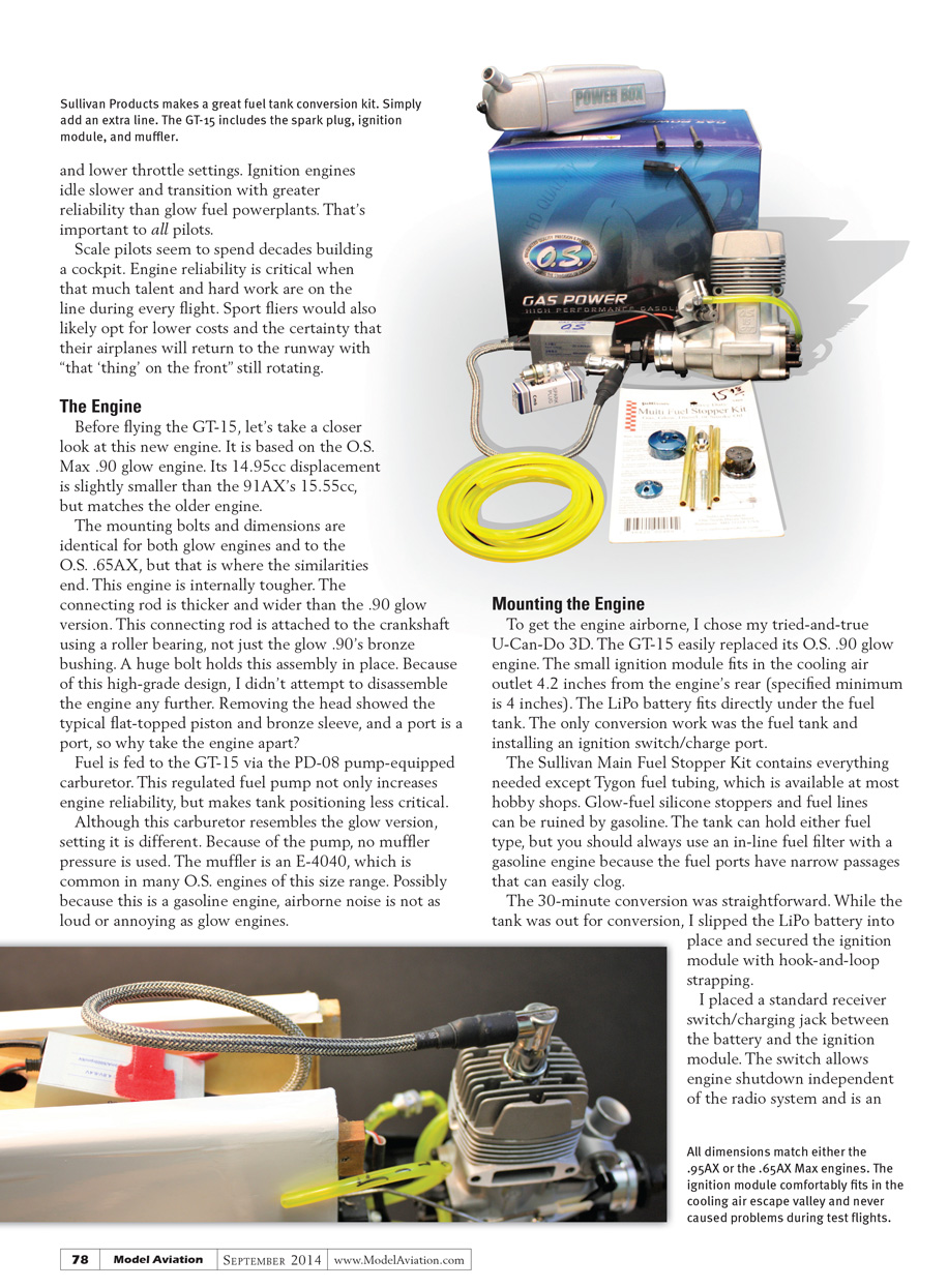 To get the engine airborne, I chose my tried-and-true U-Can-Do 3D. The GT-15 easily replaced its O.S. .90 glow engine. The small ignition module fits in the cooling air outlet 4.2 inches from the engine’s rear (specified minimum is 4 inches). The LiPo battery fits directly under the fuel tank. The only conversion work was the fuel tank and installing an ignition switch/charge port.