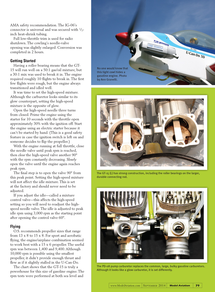 Having a roller bearing means that the GT-15 will run well on a 50:1 gas/oil mixture, but a 30:1 mix was used to break it in. The engine required roughly 10 flights to break in. The first few flights were a rough, but the engine always transitioned and idled well.