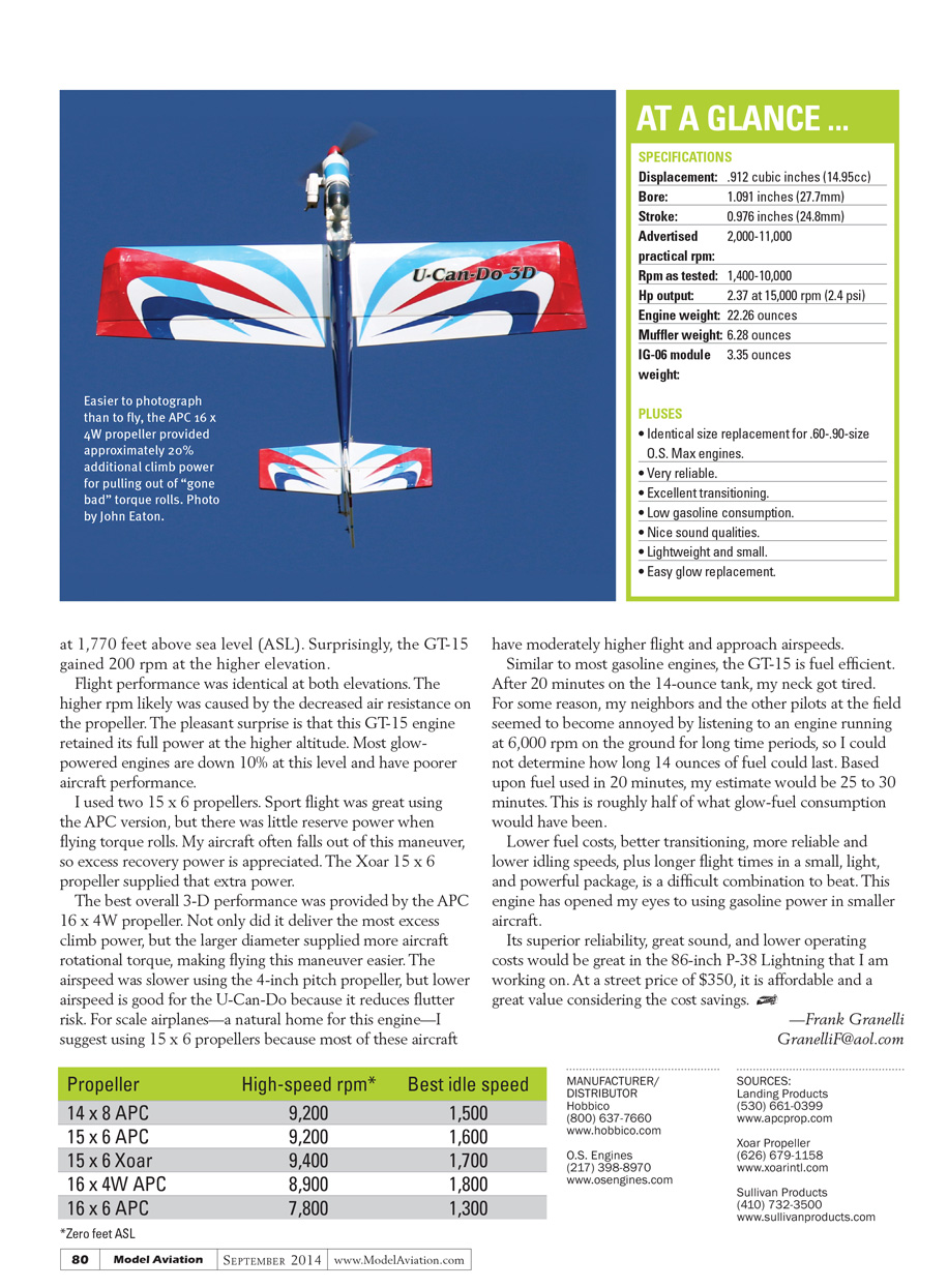 Flight performance was identical at both elevations. The higher rpm likely was caused by the decreased air resistance on the propeller. The pleasant surprise is that this GT-15 engine retained its full power at the higher altitude. Most glow-powered engines are down 10% at this field and have poorer aircraft performance.