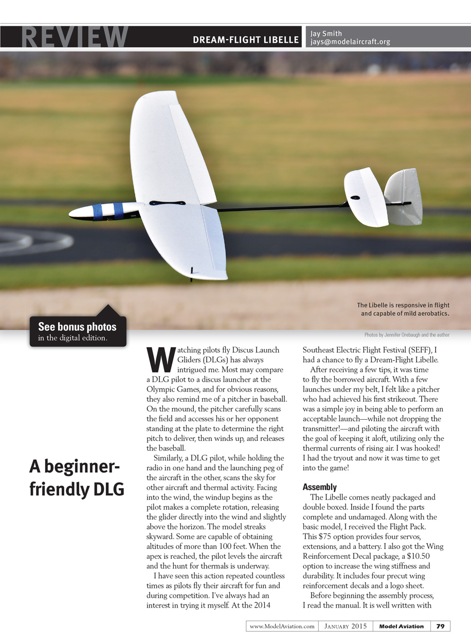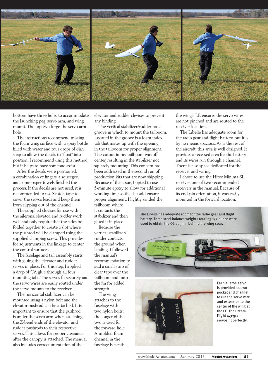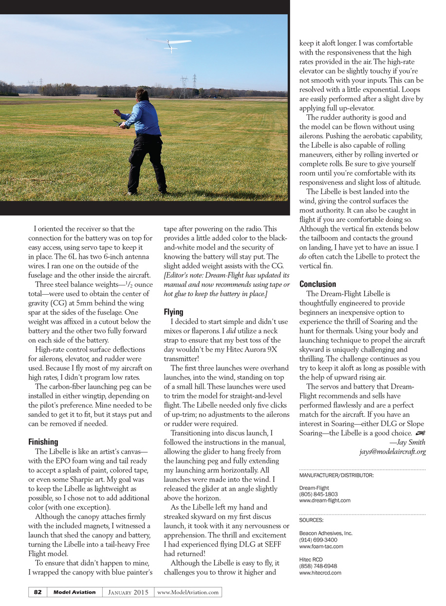The servos and battery that Dream-Flight recommends and sells have performed flawlessly and is a perfect match for aircraft. If you have an interest in soaring, either discus launch or slope, the Libelle is certainly a good choice.