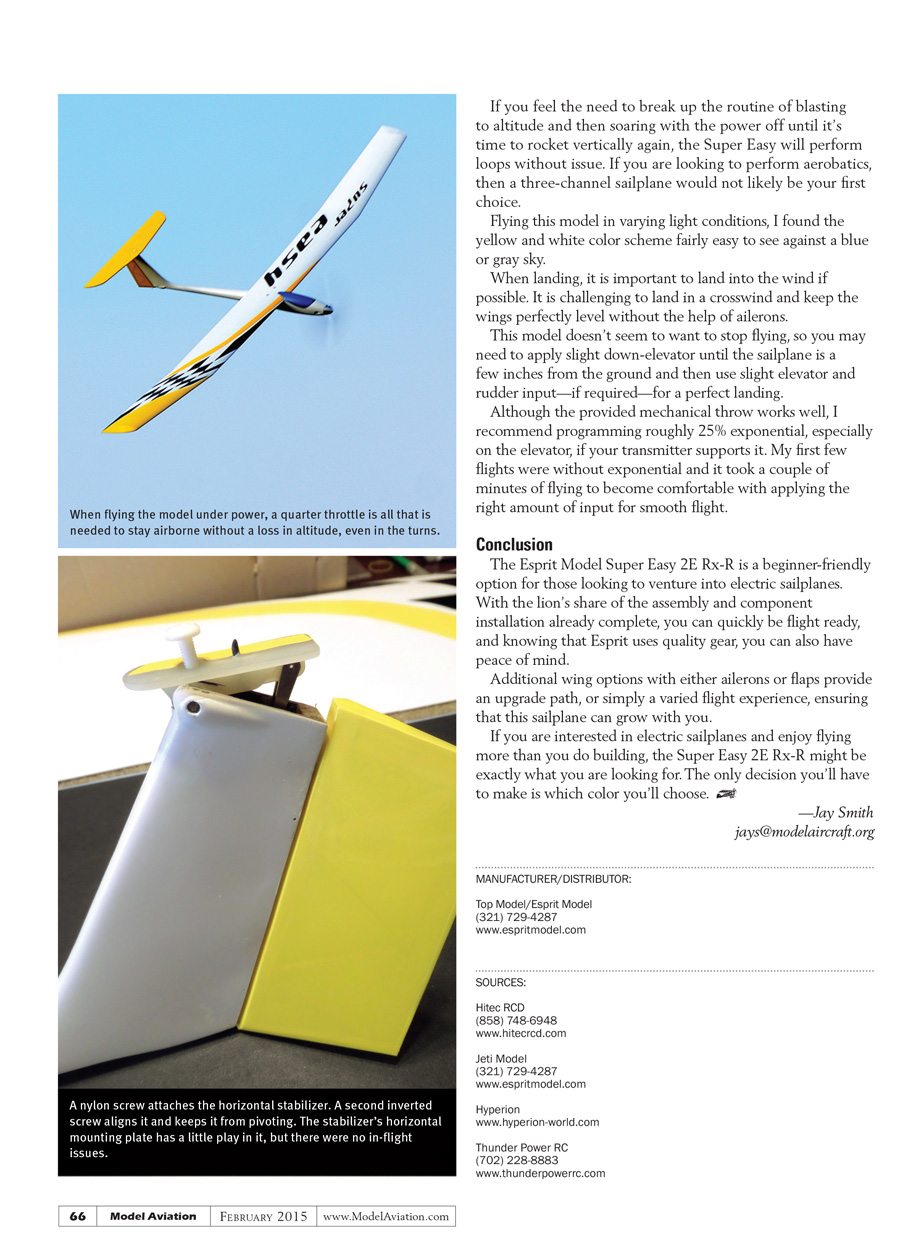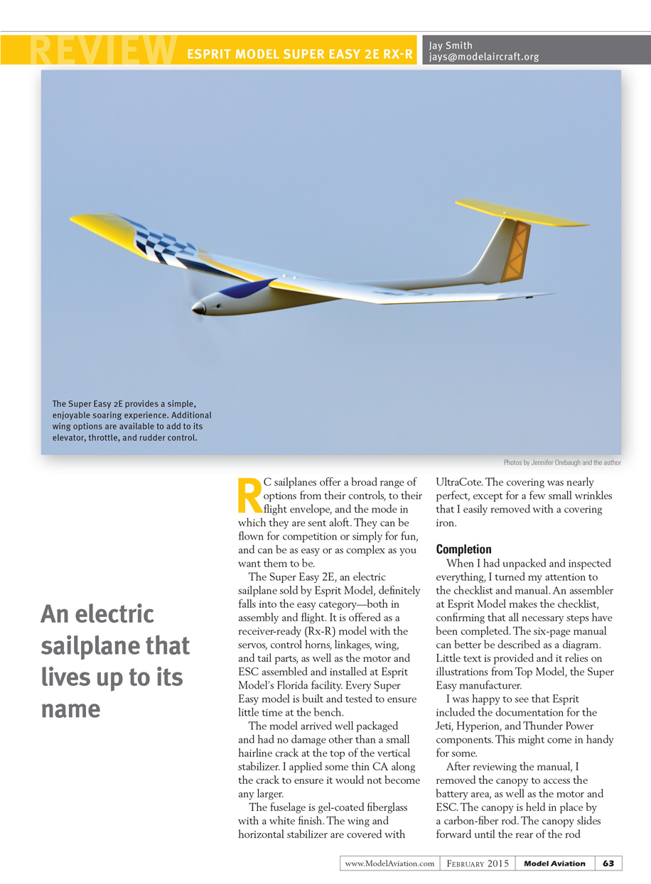 The Super Easy 2E, an electric sailplane sold by Esprit Model, definitely falls into the easy category both in assembly and flight. It is offered as a receiver-ready (Rx-R) model with the servos, control horns, linkages, wing, and tail parts, as well as the motor and ESC assembled and installed at Esprit Model’s Florida facility. Every Super Easy model is built and tested to ensure little time at the bench.