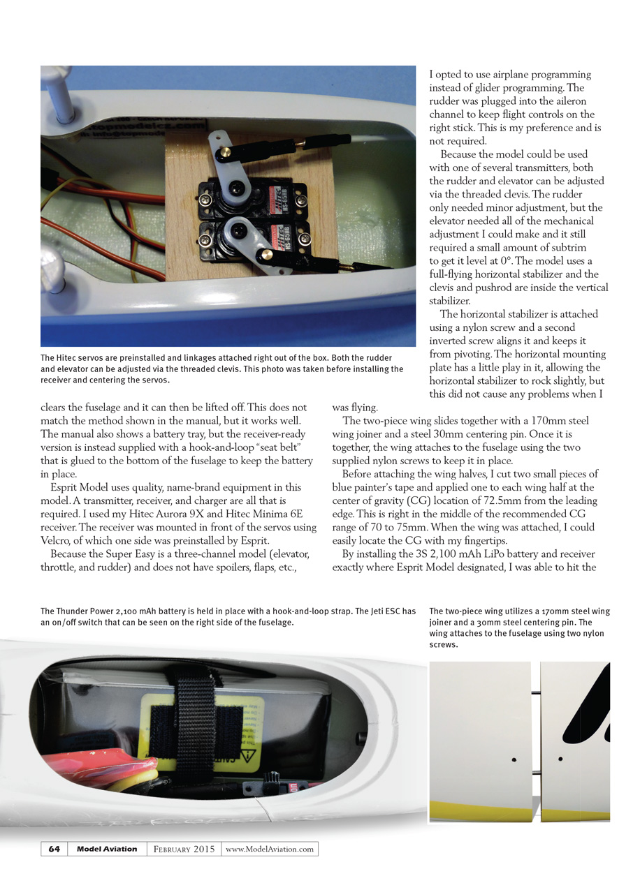 By installing the 3S 2,100 mAh battery and receiver exactly where Esprit Model designated, I was able to hit the recommended CG without any adjustments. I did notice that the aircraft was not quite laterally balanced and would drop the right wing. This was probably because the ESC is mounted on the right side of the fuselage.
