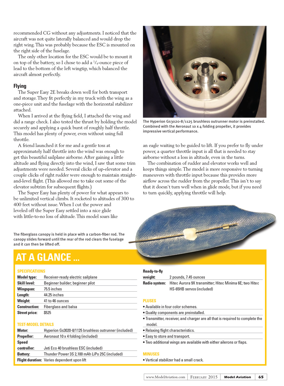 If you are interested in electric sailplanes and enjoy flying more than you do building, the Super Easy 2E might be exactly what you are looking for. The only decision you’ll have to make is which color you’ll choose.[dingbat]