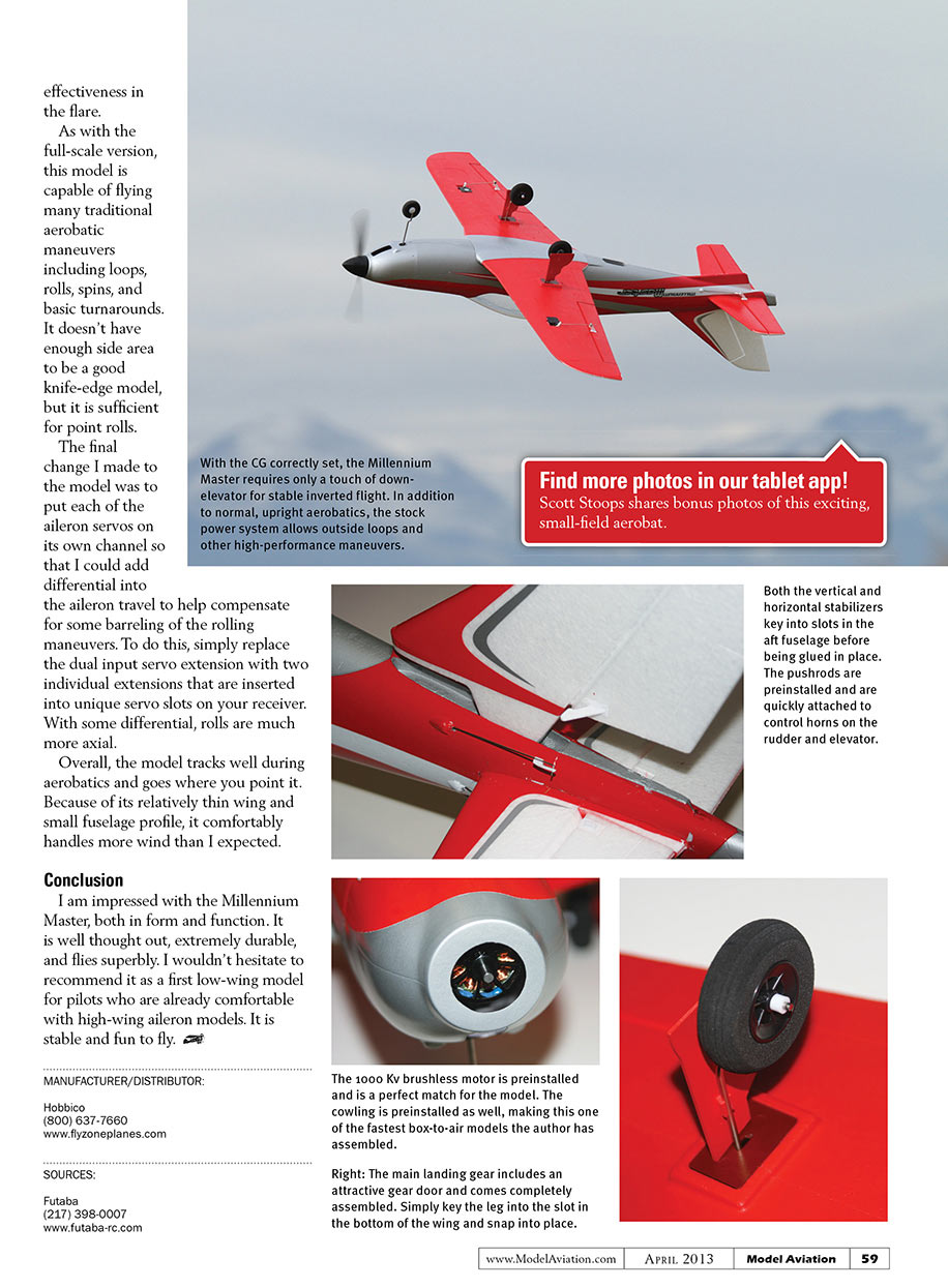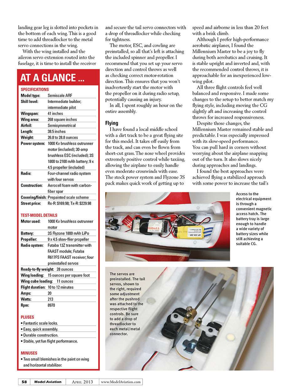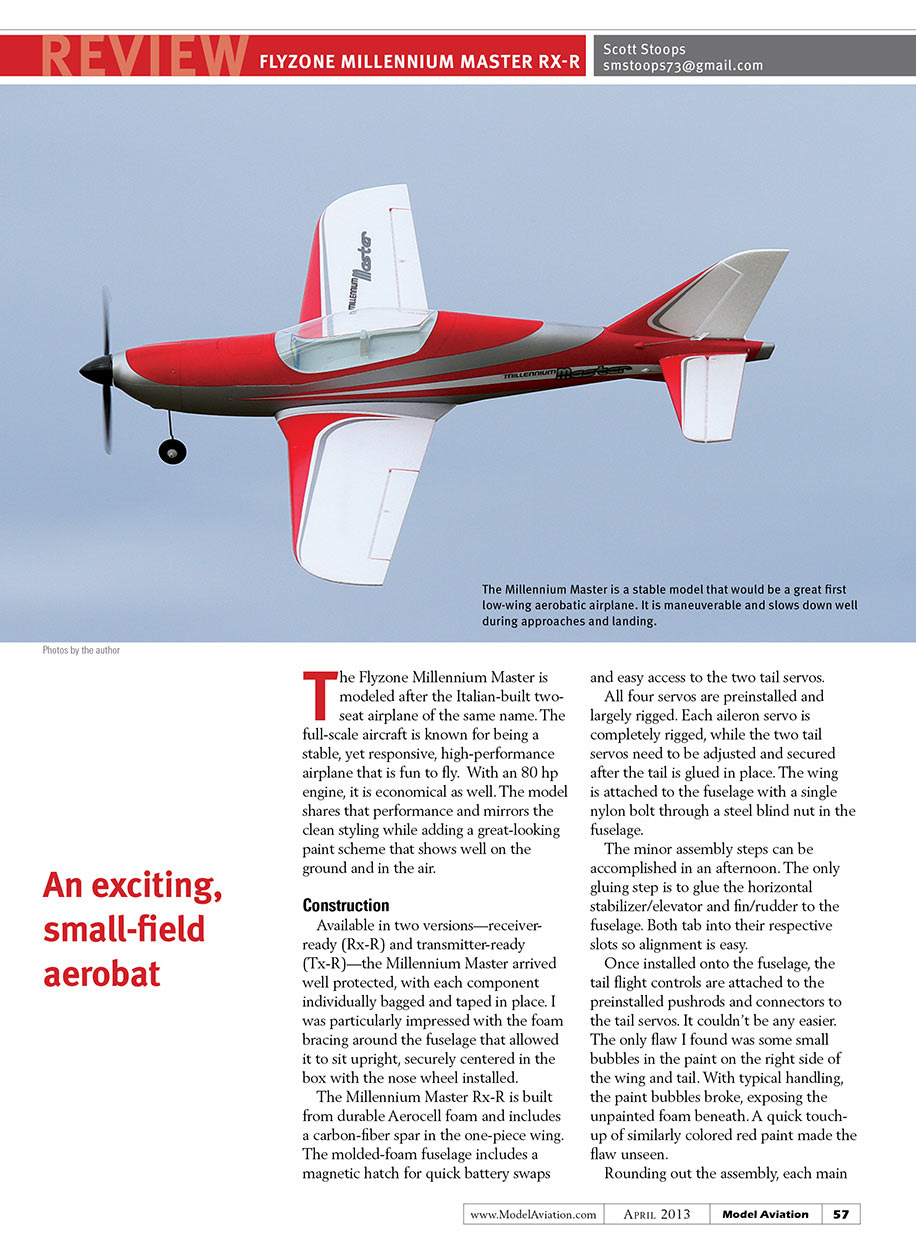 Available in two versions—receiver-ready (Rx-R) and transmitter-ready (Tx-R)—the Millennium Master arrived well protected, with each component individually bagged and taped in place. I was particularly impressed with the foam bracing around the fuselage that allowed it to sit upright, securely centered in the box with the nose wheel installed.
