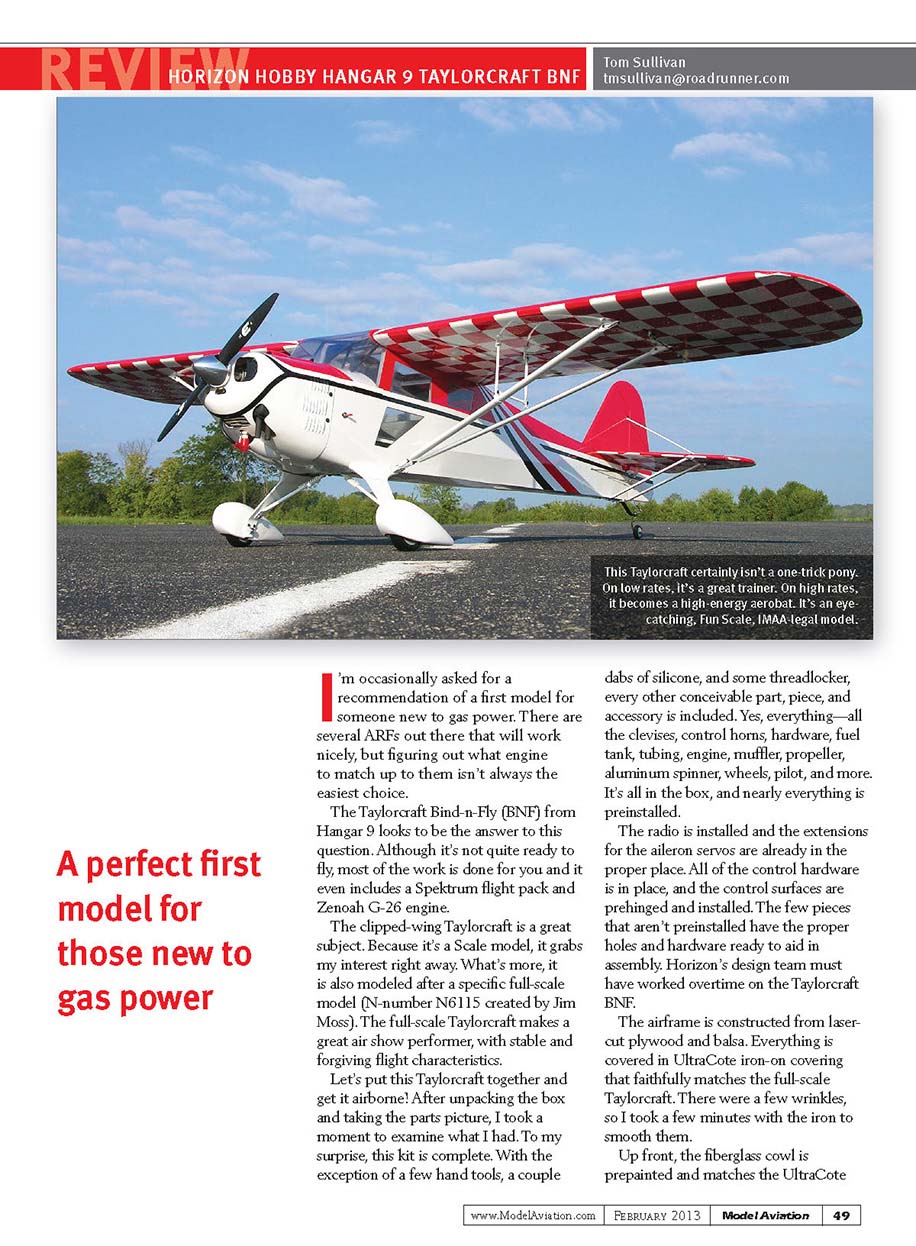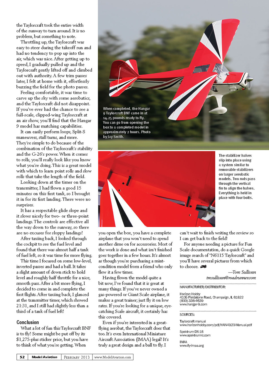 the Taylorcraft took the entire width of the runway to turn around. It is no problem, but something to note. Throttling up, the Taylorcraft was easy to steer during the takeoff run and had no tendency to pop up into the air, which was nice. After getting up to speed, I gradually pulled up and the Taylorcraft gently lifted off and climbed out with authority. A few trim passes later, I felt at home with it, effortlessly buzzing the field for the photo passes. Feeling comfortable, it was time to carve up the sky with some aerobatics, and the Taylorcraft did not disappoint. If you’ve ever had the chance to see a full-scale, clipped-wing Taylorcraft at an air show, you’ll find that the Hangar 9 model has matching capabilities. It can easily perform loops, Split-S maneuvers, stall turns, and more. They’re simple to do because of the combination of the Taylorcraft’s stability and the G-26’s power. When it comes to rolls, you’ll really look like you know what you’re doing. This is a great model with which to learn point rolls and slow rolls that take the length of the field. Looking down at the timer on the transmitter, I had flown a good 15 minutes on this first tank, so I brought it in for its first landing. There were no surprises. It has a respectable glide slope and it slows nicely for two- or three-point landings. The controls are effective all the way down to the runway, so there are no excuses for sloppy landings! After taxiing back, I looked through the cockpit to see the fuel level and found that there was almost half a tank of fuel left, so it was time for more flying. This time I focused on some low-level, inverted passes and had a ball. It takes a slight amount of down stick to hold level and roughly half throttle for a nice, smooth pass. After a bit more flying, I decided to come in and complete the first flights. After taxiing back, I glanced at the transmitter timer, which showed 21:31, and I still had slightly less than a third of a tank of fuel left! Conclusion What a lot of fun this Taylorcraft BNF is to fly! Some might be put off by its $1,275-plus sticker price, but you have to think of what you’re getting. When you open the box, you have a complete airplane that you won’t need to spend another dime on for accessories. Most of the work is done and what isn’t finished goes together in a few hours. It’s almost as though you’re purchasing a mint-condition model from a friend who only flew it a few times. Having flown the model quite a bit now, I’ve found that it is great at many things. If you’ve never owned a gas-powered or Giant Scale airplane, it makes a great trainer; just fly it on low rates. If you’re looking for a unique, eye-catching Scale aircraft, it certainly has this covered. Even if you’re interested in a great-flying aerobat, the Taylorcraft does that too. It’s even International Miniature Aircraft Association (IMAA) legal! It’s truly a great design and a ball to fly. I can’t wait to finish writing the review so I can get back to the field! For anyone needing a picture for Fun Scale documentation, do a quick Google image search of “N6115 Taylorcraft” and you’ll have several pictures from which to choose. —Tom Sullivantmsullivan@roadrunner.com MANUFACTURER/DISTRIBUTOR: Horizon Hobby4105 Fieldstone Road, Champaign, IL 61822(800) 338-4639www.hangar-9.com SOURCES: Taylorcraft manualwww.horizonhobby.com/pdf/HAN4920-Manual.pdf Spektrum DX-18www.spektrumrc.com IMAAwww.fly-imaa.orgWhen completed, the Hangar 9 Taylorcraft BNF came in at 14.25 pounds ready to fly. You can go from opening the box to a completed model in approximately 2 hours. Photo by Jay Smith.The stabilizer halves slip into place using a system similar to removable stabilizers on larger aerobatic models. Two rods pass through the vertical fin to align the halves. Everything is held in place with four bolts.52Model Aviation February 2013www.ModelAviation.com049