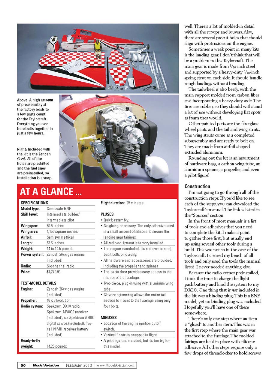 well. There’s a lot of molded-in detail with all the scoops and louvers. Also, there are several precut holes that should align with protrusions on the engine. Sometimes a weak point in many kits is the landing gear. I don’t think that will be a problem in this Taylorcraft. The main gear is made from 3/16-inch steel and supported by a heavy-duty 5/16-inch spring strut on each side. It should handle rough landings without bending. The tailwheel is also beefy, with the main support molded from carbon fiber and incorporating a heavy-duty axle. The tires are rubber, so they should withstand a lot of use without developing flat spots as foam tires would. Other painted parts are the fiberglass wheel pants and the tail and wing struts. The wing struts come as a completed subassembly and are ready to bolt on. They are made from airfoil-shaped extruded aluminum. Rounding out the kit is an assortment of hardware bags, a carbon wing tube, an aluminum spinner, a propeller, and even a pilot figure! Construction I’m not going to go through all of the construction steps. If you’d like to see each of the steps, you can download the Taylorcraft’s manual. The link is listed in the “Sources” section. In the front of most manuals is a list of tools and adhesives that you need to complete the kit. I make a point to gather those first, but usually end up using several other tools during a build. This was not so in the case of the Taylorcraft. I cleared my bench of all tools and only used the tools the manual listed. I never needed anything else. Because the radio comes preinstalled, I took the time to charge the flight pack battery and bind the system to my DX18. One thing that is not included in the kit was a binding plug. This is a BNF model, yet no binding plug was included. Hopefully you’ll have one of these somewhere. There’s only one step where an item is “glued” to another item. This was in the first step where the main gear was attached to the fuselage. The molded fairings are held in place with silicone adhesive. All other steps require only a few drops of threadlocker to hold screws SPECIFICATIONSModel type: Semiscale BNFSkill level: Intermediate builder/intermediate pilotWingspan: 80.5 inchesWing area: 1,150 square inchesAirfoil: SemisymmetricalLength: 63.6 inchesWeight: 14 to 14.5 poundsPower system: Zenoah 26cc gas engine (included)Radio: Six-channel radioPrice: $1,279.99 TEST-MODEL DETAILSEngine: Zenoah 26cc gas engine (included)Propeller: 16 x 6 Evolution Radio system: Spektrum DX18 radio, Spektrum AR8000 receiver (included), six Spektrum A6000 digital servos (included), five-cell NiMH receiver battery (included)Ready-to-fly weight: 14.25 poundsFlight duration: 25 minutesPLUSES• Quick assembly.• No gluing necessary. The only adhesive used is a small amount of silicone to secure the landing gear fairings.• All radio equipment is factory installed.• The engine is included. It’s not premounted, but it bolts on quickly.• All hardware and accessories are provided, including the propeller and spinner.• The cabin door provides easy access to the interior of the fuselage.• Two-piece, plug-in wing with aluminum wing tube.• Clever engineering allows the entire tail section to mount to the fuselage using only four bolts.MINUSES• Location of the engine ignition cutoff switch.• Vertical fin struts snapped in flight.• A pilot figure is included, but it’s too big for this model.AT A GLANCE ...Above: A high amount of preassembly at the factory leads to a low parts count for the Taylorcraft. Everything you see here bolts together in just a few hours.Right: Included with the kit is the Zenoah G-26. All of the holes are predrilled and the fuel lines are preinstalled, so installation is a snap.50Model Aviation February 2013www.ModelAviation.com049