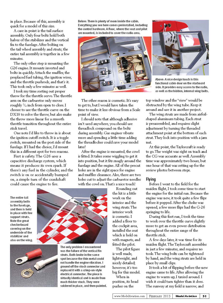 place. Because of this, assembly is quick for a model of this size. A case in point is the tail surface assembly. Only four bolts hold both halves of the stabilizer and the vertical fin to the fuselage. After bolting on the tail wheel assembly and struts, the entire tail assembly is together in a few minutes. The only other step is mounting the G26 engine. It mounts inverted and bolts in quickly. Attach the muffler, the preplaced fuel tubing, the ignition wires, and the throttle pushrods, and that’s it. This took only a few minutes as well. I took my time sorting out proper throw for the throttle servo. The throttle arm on the carburetor only moves roughly 1/4 inch from open to close. I choose to use the throttle curve on the DX18 to solve the throw, but also make the throw more linear for a smooth throttle transition throughout the entire stick travel. One note I’d like to throw in is about the ignition cutoff switch. It is a toggle switch, mounted on the port side of the fuselage. If I had the choice, I’d mount this in a different spot for two reasons. First is safety. The G26 uses a capacitive discharge system, which means it produces its own spark. If there’s any fuel in the cylinder, and the switch is on or accidentally bumped on, a simple turn of the crankshaft could cause the engine to fire. The other reason is cosmetic. It’s easy to get to, but I would have taken the time to make it less obvious from a Scale point of view. I should note that although adhesive isn’t used anywhere, you should use threadlock compound on the bolts during assembly. Gas engines vibrate more and spending a little time adding the threadlocker could save your model later! After the engine is mounted, the cowl is fitted. It takes some wiggling to get it into position, but it fits snugly around the fuselage and the engine. All of the precut holes are in the right space for engine and muffler clearance. Also, there are two holes cut to adjust the carburetor needles with the cowl on. That’s a nice touch! Rounding out the kit is a little work on the interior and the wing struts. The interior work is cosmetic. I added a floor to the cockpit area, installed the seat which is held on with magnets, and fitted the pilot. The pilot figure is well made, lightweight, and nicely detailed; however, it’s too big for this model. When in position, its head pushes on the top window and the “view” would be obstructed by the wing tube. Keep it around and use it in another project. The wing struts are made from airfoil-shaped aluminum tubing. Each strut is preassembled, and requires slight adjustment by turning the threaded attachment point at the bottom of each strut. They lock into position with a jam nut. At this point, the Taylorcraft is ready to go. The weight was right on track and the CG was accurate as well. Assembly time was approximately two hours, but one hour of that was setting up for the review photos between steps. Flying Before I went to the field for the maiden flight, I took some time to start the engine for the initial run. Because the engine was new, it took quite a few flips before it popped. After the choke was opened, a few more flips had the G-26 springing to life. During this first run, I took the time to work over the throttle curve slightly more to get an even power distribution throughout the entire range of the throttle stick. A few days later, it was time for its maiden flight. The Taylorcraft assembles in just a few minutes, and requires no tools. The wing bolts can be tightened by hand, and the wing struts are held in place by small clips. It took a bit of flipping before the new engine came to life. After allowing the engine to warm up, I taxied around. I wish it could turn tighter than it does. The runway at my field is narrow, and The only problem I encountered was the failure of the vertical fin struts. Both broke in the same spot because the thin metal could not handle the engine vibration. I ground off the stock connector and replaced it with a crimp-on-style electrical connector. The piece is virtually identical and is made from much thicker stock. They were soldered in place, and then painted.Above: A nice design touch is this functional cabin door on the starboard side. It provides easy access to the radio, as well as the hidden, internal wing bolts.Below: There is plenty of room inside the cabin. Everything you see here comes preinstalled, including the control hardware. A floor, where the seat and pilot are mounted, is included to cover the radio area. The entire tail assembly bolts to the fuselage, and then is held in place with few support struts. Note the great checkerboard covering on the underside of the stabilizer and also on the wing.51Model Aviation February 2013www.ModelAviation.com049