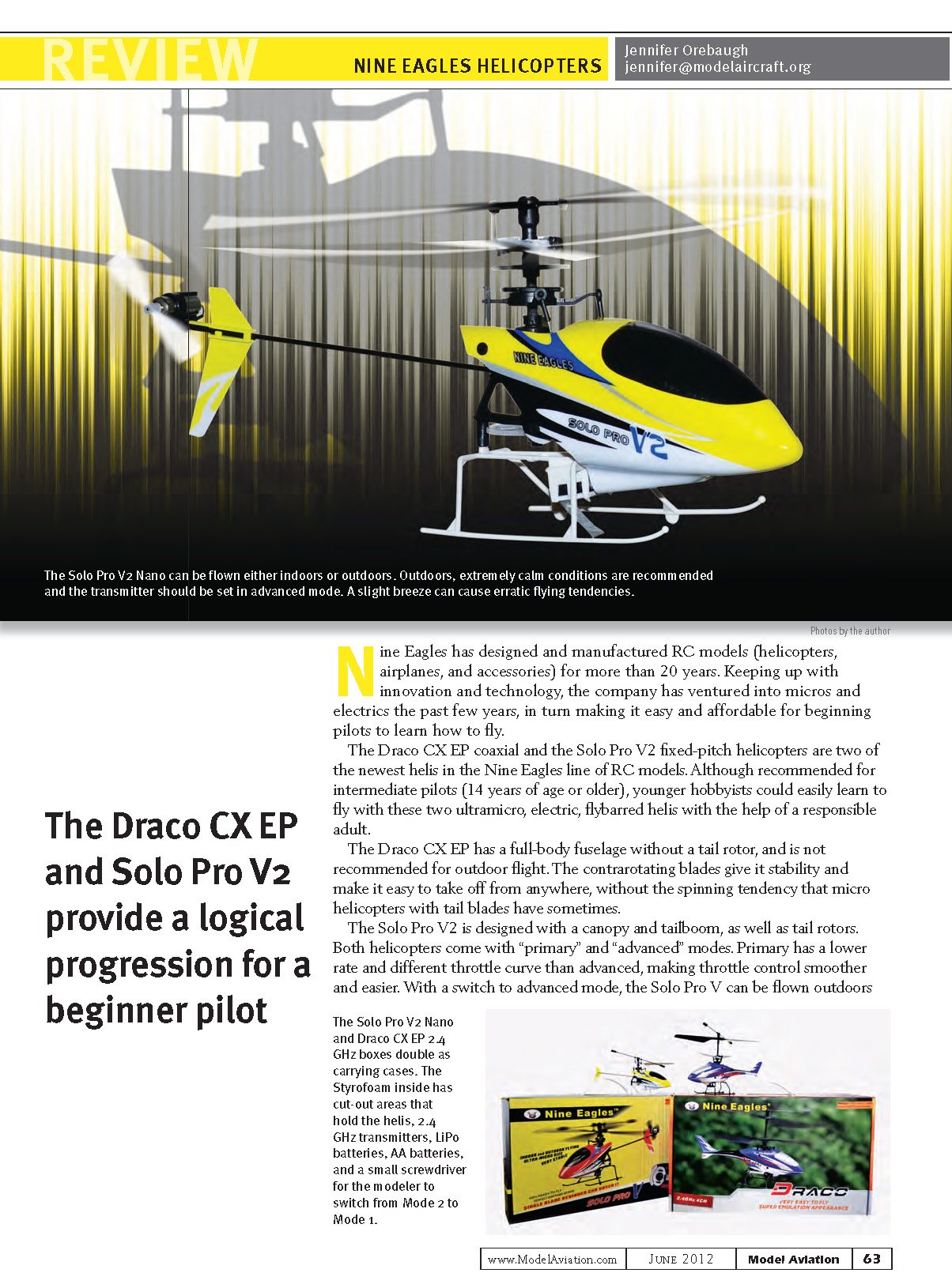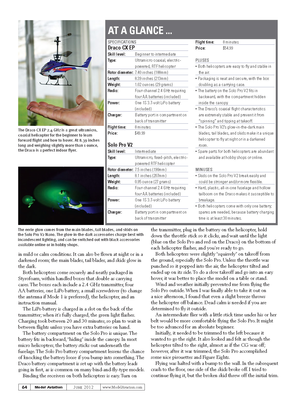 The Draco CX EP coaxial and the Solo Pro V2 xed-pitch helicopters are two of