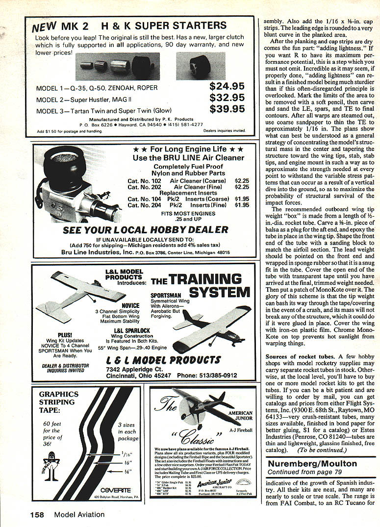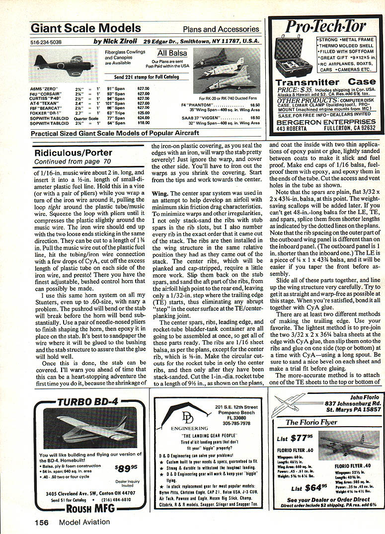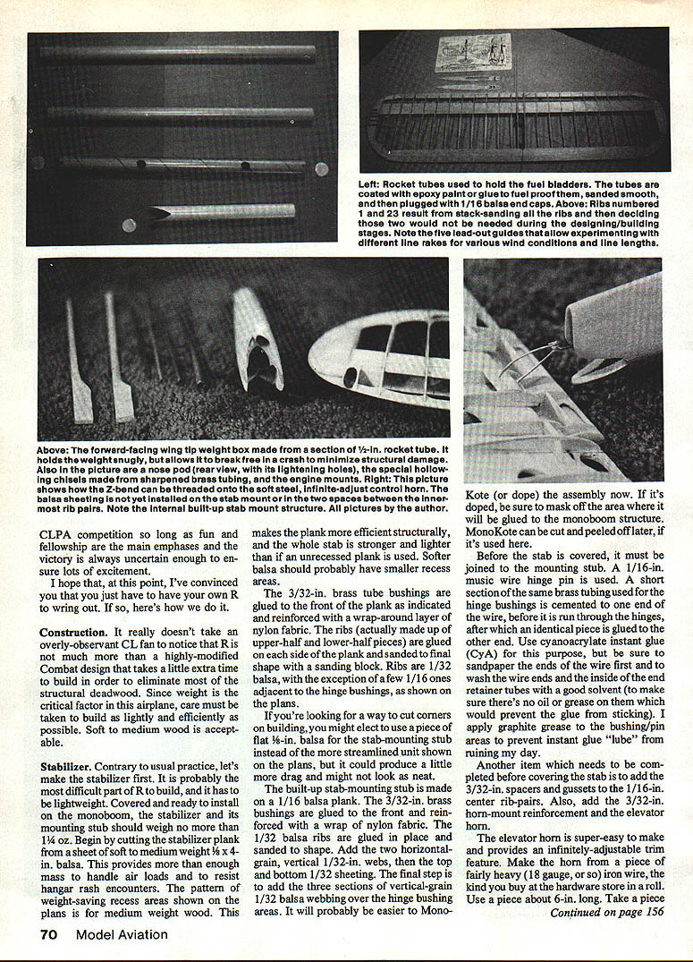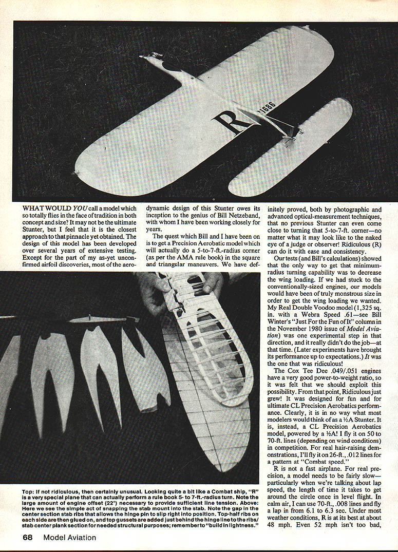 WHAT WOULD YOUcall amodeiwbich totally flies face tradition both concept size may ultimate Stunter feel closest approach pinnacle yet obtained design model has developed over several years extensive testing Except part as-yet uncon firmed airfoil discoveries aero dynamic design Stunter owes its inception genius Bill Netzeband have working closely years quest Bill have get Precision Aerobatic model will actually 5-to-7-ft-radius corner per AMA rule book square triangular maneuvers have def initely proved both photographic advanced optical-measurement techniques no previous Stunter can come close turning 5-to-7-ft cornerno matter what may look like naked eye judge observer Ridiculous R can ease consistency Ourtests Bills calculations showed way get minimumradius turning capability decrease wing loading stuck conventionally-sized engines models would haye truly monstrous size order get wing loading wanted Real Double Voodoo model 1325 sq Webra Speed 61see Bill Winters Just Fun column November 1980 issue Model via tion experimental step direction really didnt jobat time Later experiments have brought its performance up expectations was ridiculous Cox Tee Dee 049/051 engines have very good power-to-weight ratio felt should exploit possibility point Ridiculous just grew designed fun ultimate CL Precision Aerobatics perform ance Clearly no way what modelers would think Stunter instead CL Precision Aerobatics model powered fly 50 70-ft lines depending wind conditions competition real hair-raising dem onstrations Ill fly 26-ft 012 lines pattern Combat speed R fast airplane real pre cision model needs fairly slow particularly talking about lap speed length time takes get around circle once level flight calm air can use 70-ft 008 lines fly lap 61 63 sec Under weather conditions R its best about 48 mph 52 mph isnt too bad 68 Model Aviation Top if ridiculous certainly unusual Looking quite bit like Combat ship R very special plane can actually perform rule book 5-to 7-It-radius turn Note large amount engine offset 220 necessary provide sufficient line tension Above see simple act snapping stab mount stab Note gap center section stab ribs allows hinge pin slip right position Top-half ribs sidearethen glued andtop gussets added just behind hinge ilnetothe ribs/ stab center plank section needed structural purposes rememberto build lightness especially longer lines get kind performance out 049 dragging 555 sq wing aweight about 20 oz SOft lines weve got work engine hard Ive done lot experimenting fuels props engine setups have own personal preferences line flier just wants build Rand have ball flying maybe winning some Stunt contests suggest using stock engine slightly modified needle valve infinite adjustment bored-out venturi 15% nitro fuel Cox black nylon 5-3 prop should turn about 22200 23500 rpm air 46-52 mph can check engine rpm use technique given Musical Tach article January 1981 issue Model Aviation Airplane trim weather conditions affect air speed rain model can slow down 5 mph keep little engine running steadily through maneuvers youll need super fuel-supply system use pressure bladder system two bladders fuel filter fuel shutoff attain maximum consisten cy Ill describe fully later article Line tension can quite light very precise elevator control needed Due factors use very large bellcrank give plenty muscle handle surface air loadsand custom-fitted fingers-only control handle Ill describe fully later dont intend try precise flying Ron long lines can use ordinary large commericial bellcrank will have experiment line-spread dimension control handle harmonize bellcrank Dont think about trying put exotic aesthetically-pleasing glass finishes R would make model too heavy its thing R youve got add lots lightness its parts Use MonoKote covering maybe little dope fuselage negative aspect Rs light wing loading sharp-turning ability factors can allow appear bob around unacceptably turbulent air phenomenon lightweight ships long lines can influence some judges seem prefer flight characteristics resemble some sort flying forest bombing run giving otherwisesuperior-flying airplane low maneuver scores moral either get too precise about literal rule-book perform ance flying capability competition learn enjoy agony defeat ever really fun thing continue flail away competition such machinery enjoy challenge trying accomplish impossible Sometimes superior flying performance can actually wipe out formidable force imposed very impressive-looking/sounding ar senals conventional Stunt heavy weaponry rate everybody really enjoys Left top section stabliator complete point ready installation stab mount top halves ribs gussets will installed afterthe stab mount has snapped place Right uniquely-shaped ribs used wing July1985 69 CLPA competition long fun fellowship main emphases victory always uncertain enough en sure lots excitement hope point Ive convinced you just have have own R wring out heres Construction really doesnt take overly-observant CL fan notice R much highly-modified Combat design takes little extra time build order eliminate structural deadwood Since weight critical factor airplane care must taken build lightly efficiently possible Soft medium wood accept able Stabilizer Contrary usual practice lets make stabilizer first probably difficult part Rto build has lightweight Covered ready install monoboom stabilizer its mounting stub should weigh no 1 oz Begin cutting stabilizer plank sheet soft medium weight n balsa provides enough mass handle air loads resist hangar rash encounters pattern weight-saving recess areas shown plans medium weight wood makes plank efficient structurally whole stab stronger lighter unrecessed plank used Softer balsa should probably have smaller recess areas 3/32-in brass tube bushings glued front plank indicated reinforced wrap-around layer nylon fabric ribs actually made up upper-half lower-half pieces glued side plank sanded final shape sanding block Ribs 1/32 balsa exception f