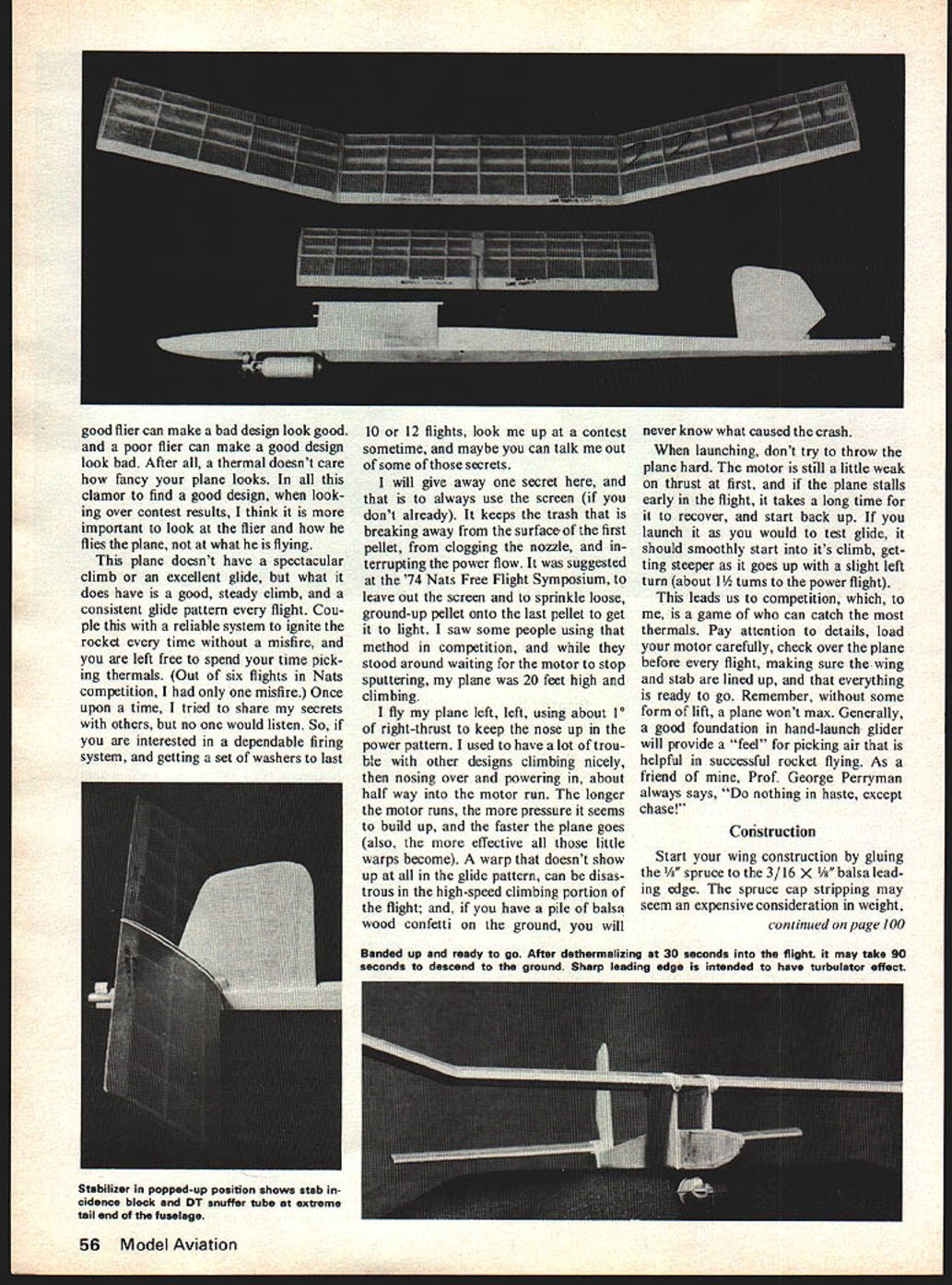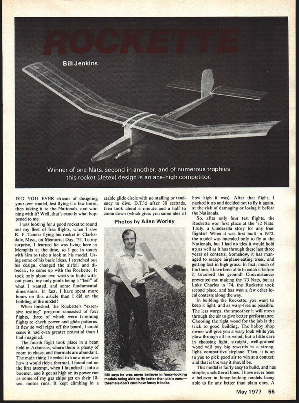 DID YOU EVER dream designing own model test flying few times taking Nationals win ning Well thats exactly what hap pened looking good rocket round out fleet free flights saw R F Tanner flying rocket Clarks dale Miss Memorial Day 72 surprise learned living Memphis time got touch him take look model Us ing some basic ideas stretched out design changed airfoil di edral come up Rockette took about two weeks build out plans guide being feel what wanted some fundamental dimensions fact have spent hours article did building model finished Rockettes exten sive testing program consisted four flights three trimming flights cheek power glide patterns flew well right off board could sense greater potential imagined fourth flight took place bean field Arkansas plenty room chase thermals abundant main thing needed know now would ride thermal found out first attempt launched boomer got high its power run some gas ships get 10sec motor runs kept climbing stable glide circle no stalling tend ency dive DTd after 30 seconds took about minute half come down gives some idea high After flight packed up decided fly again risk damaging losing before Nationals So after four test flights Rockette won first place 72 Nats Truly Cinderella story free fighter first built 1972 model intended fly Nationals no idea would hold up well has through last three years contests Somehow has man aged escape airplane-eating trees getting lost high grass fact much time have able catch before touched ground Circumstances prevented making 73 Nats Lake Charles 74 Rockette took second place has won few other lo cal contests along way building Rockette want keep light warp-free possible less warps smoother will move through air give better performance Choosing right wood job trick good building hobby shop owner will give wary look plow through wood little care choosing light straight well-grained wood will pay big rewards strong light competitive airplane up pick good air win contest way should model fairly easy build has simple uncluttered lines have never believer fancy-looking models being able fly better plain ones May1977 55 Photos Allen Worley Bill says never believer fancy-looking models being eble fly better plain ones thermals dont care fancy looks good flier can make bad design look good poor flier can make good design look bad After thermal doesnt care fancy plane looks clamor find good design look ing over contest results think important look flier flies plane what flying plane doesnt have spectacular climb excellent glide what does have good steady climb consistent glide pattern flight Cou ple reliable system ignite rocket time misfire left free spend time pick ing thermals Out six flights Nats competition misfire Once upon time tried share secrets others no would listen So interested dependable firing system getting set washers last 10 12 flights look up contest sometime maybe can talk out some secrets will give away secret always use screen dont already keeps trash breaking away surface first pellet clogging nozzle terrupting power flow suggested 74 Nats Free Flight Symposium leave out screen sprinkle loose ground-up pellet onto last pellet get light saw some people using method competition stood around waiting motor stop sputtering plane 20 feet high climbing fly plane left left using about 10 right-thrust keep nose up power pattern used have lot trou ble other designs climbing nicely nosing over powering about half way motor run longer motor runs pressure seems build up faster plane goes also effective little warps become warp doesnt show up glide pattern can disas trous high-speed climbing portion flight have pile balsa wood confetti ground will never know what caused crash launching dont try throw plane hard motor still little weak thrust first plane stalls early flight takes long time recover start back up launch would test glide should smoothly start its climb get ting steeper goes up slight left turn about 1 turns power flight leads us competition game can catch thermals Pay attention details load motor carefully check over plane before flight making sure thewing stab lined up everything ready go Remember some form lift plane wont max Generally good foundation hand-launch glider will provide feel picking air helpful successful rocket flying As friend Prof George Perryman always says nothing haste except chase Construction Start wing construction gluing ce 3/16 X /8 balsa lead ing edge spruce cap stripping may seem expensive consideration weight continued page 100 56 Model Aviation Banded up ready go After dethermalizing 30 seconds flight may take 90 seconds descend ground Sharp leading edge intended have turbulator effect Stabilizer popped-up position shows stab cidence block DT snuffer tube extreme tail end fuselage Custom Blended Bill Hager 5214 N Dixie Drive Dayton Ohio 45414 lage propeller nose block should given least three coats dope before assembling Ensure propeller blades properly balanced track properly Finished weight propeller assembly should exceed 24 grams Flight Preparation Make up least two /4 rubber motors 16 strands After washing drying lubing motors break initially using stationary stretch method hammer two large nails securely fence about six motor lengths apart motor stretched over nails left live minutes stretched motors should about 42 long Now assemble completed model insert rubber motor Check align ment wing wash-in incidence thrust correct Also verify CG loca tion prop blades folded Shift posi tion D-T timer necessary ensure CG located precisely shown plan Ready fly weight should equal less 222-gram total itemized plan modeler interested serious un limited rubber competition believe re liable sturdy winder winding stooge musts winding stooge custom de signed own car relatively easy build twin advantages im movable holder winding freedom test fly alone significant Flying Under calm conditions hand glide model add packing under sta bilizer leading trailing edge until GM Fuel Dayton National