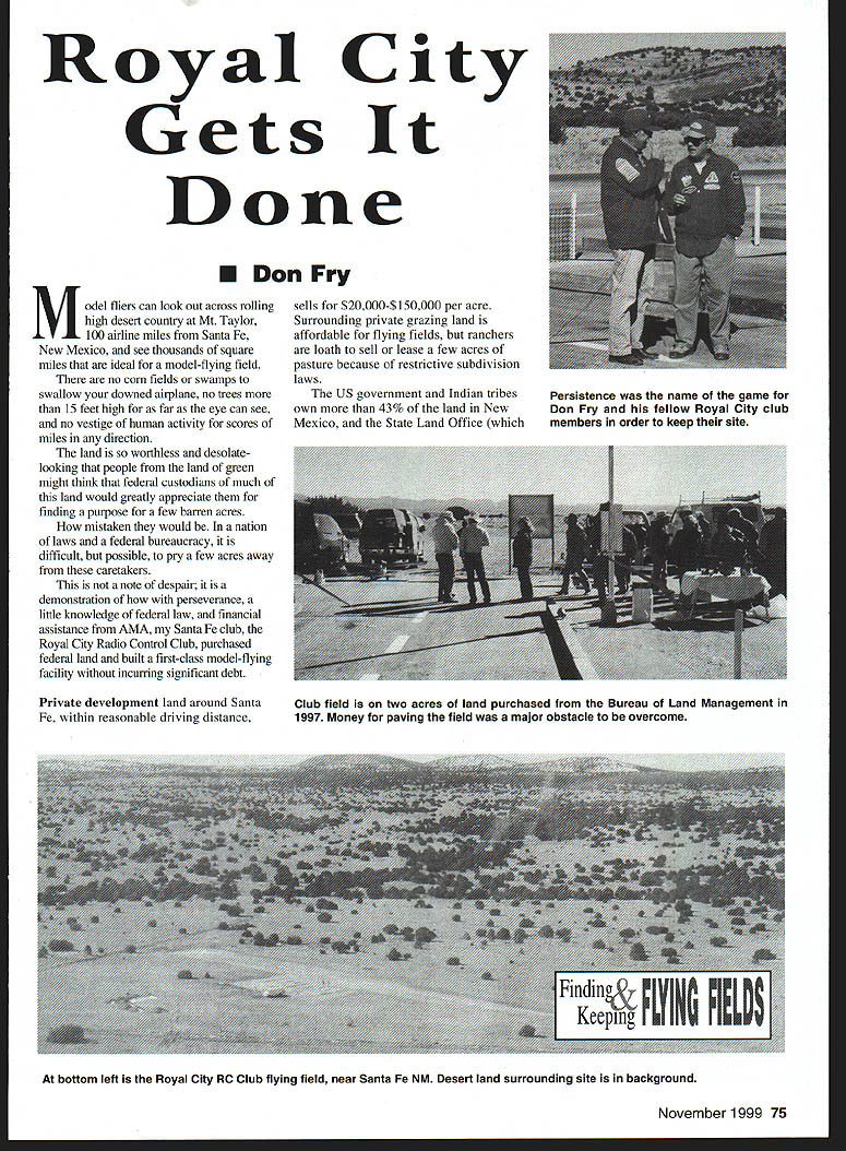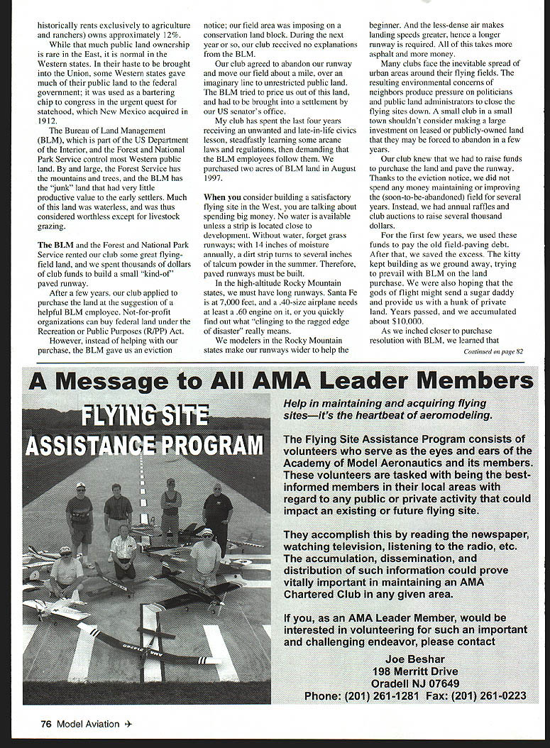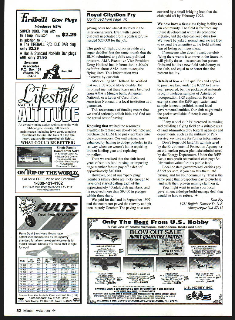 Royal Gets City Done U Don Fry Model fliers can look out across rolling high desert country Mt Taylor 100 airline miles Santa Fe New Mexico see thousands square miles ideal model-flying field no corn fields swamps swallow downed airplane no trees 15 feet high far eye can see no vestige human activity scores miles direction land worthless desolatelooking people land green might think federal custodians much land would greatly appreciate finding purpose few barren acres mistaken would nation laws federal bureaucracy difficult possible pry few acres away caretakers note despair demonstration perseverance little knowledge federal law financial assistance AMA Santa Fe club Royal City Radio Control Club purchased federal land built first-class model-flying facility incurring significant debt Private development land around Santa Fe within reasonable driving distance sells $20000-s 150000 per acre Surrounding private grazing land affordable flying fields ranchers loath sell lease few acres pasture because restrictive subdivision laws US government Indian tribes own 43% land New Mexico State Land Office November 1999 75 Persistence name game Don Fry fellow Royal City club members order keep site Club field two acres land purchased Bureau Land Management 1997 Money paving field major obstacle overcome bottom left Royal City RC Club flying field near Santa Fe NM Desert land surrounding site background historically rents exclusively agriculture ranchers owns approximately 12% much public land ownership rare East normal Western states haste brought Union some Western states gave much public land federal government used bartering chip congress urgent quest statehood New Mexico acquired 1912 Bureau Land Management BLM part US Department Interior Forest National Park Service control Western public land large Forest Service has mountains trees BLM has junk land very little productive value early settlers Much land waterless thus considered worthless except livestock grazing BLM Forest National Park Service rented club some great flyingfield land spent thousands dollars club funds build small kind-of paved runway After few years club applied purchase land suggestion helpful BLM employee Not-for-profit organizations can buy federal land under Recreation Public Purposes RIPP Act However instead helping purchase BLM gave us eviction notice field area imposing conservation land block During next year club received no explanations BLM club agreed abandon runway move field about mile over imaginary line unrestricted public land BLM tried price us out land brought settlement US senators office club has spent last four years receiving unwanted late-in-life civics lesson steadfastly learning some arcane laws regulations demanding BLM employees follow purchased two acres BLM land August 1997 consider building satisfactory flying site West talking about spending big money No water available unless strip located close development Without water forget grass runways 14 inches moisture annually dirt strip turns several inches talcum powder summer Therefore paved runways must built high-altitude Rocky Mountain states must have long runways Santa Fe 7000 feet 40-size airplane needs least 60 engine quickly find out what clinging ragged edge disaster really means modelers Rocky Mountain states make runways wider help beginner less-dense air makes landing speeds greater hence longer runway required takes asphalt money clubs face inevitable spread urban areas around flying fields resulting environmental concerns neighbors produce pressure politicians public land administrators close flying sites down small club small town shouldnt consider making large investment leased publicly-owned land may forced abandon few years club knew raise funds purchase land pave runway Thanks eviction notice did spend money maintaining improving soon-to-be-abandoned field several years Instead annual raffles club auctions raise several thousand dollars first few years used funds pay old field-paving debt After saved excess kitty kept building ground away trying prevail BLM land purchase also hoping gods flight might send sugar daddy provide us hunk private land Years passed accumulated about $10000 As inched closer purchase resolution BLM learned Continued Ofl page 82 76 Model Aviation ward winning active adult community 24-hour gate security full exterior maintenance including lawn care complete recreational facilities likes top rate resort radio controlled air field. WHAT COULD BE BETTER Single Family Homes $70s tn Beautiful Ocala FL Private Golf Courses Maintenance Free 24-Hour Gate Security Spectacular Recreation Facilities OKP OF ThEP1 Call FREE Video Brochure 1-800-421-4162 8447SW 9955 eB Road Ocan F 3448 www e e2o ow corn Royal City/Don Fry Continued page 76 paving costs almost doubled intervening years good discount negotiated contractor needed $20000 job gods flight did provide sugar daddies same month BLM submitted public political pressure AMA Executive Vice President Doug Holland information Model Aviation about AMA loans acquire flying sites information unknown club After calling Mr Holland verified club would likely qualify informed loans may direct AMAs Muncie bank American National Letter Credit American National local institution guarantee reassurance funding meant could seriously solicit bids find out actual cost paving Knowing resources available replace dowdy old field purchase BLM land put vigor back club members enthusiasm enhanced having dodge potholes runway werent home repairing broken landing gear replacing propellers realized club faced years serious fund-raising imposing huge member fees pay off debt approximately $10000 However spark plug members clubs lucky enough have started calling approximately 40 adult club members received $9400 pledges within three days paid land September 1997 contractor paved runway pit area early October paving cost covered small bridging loan club paid off February 1998 now have first-cla