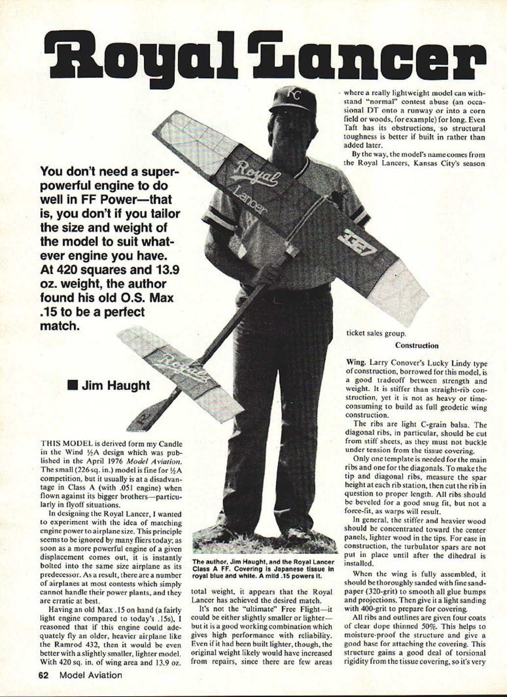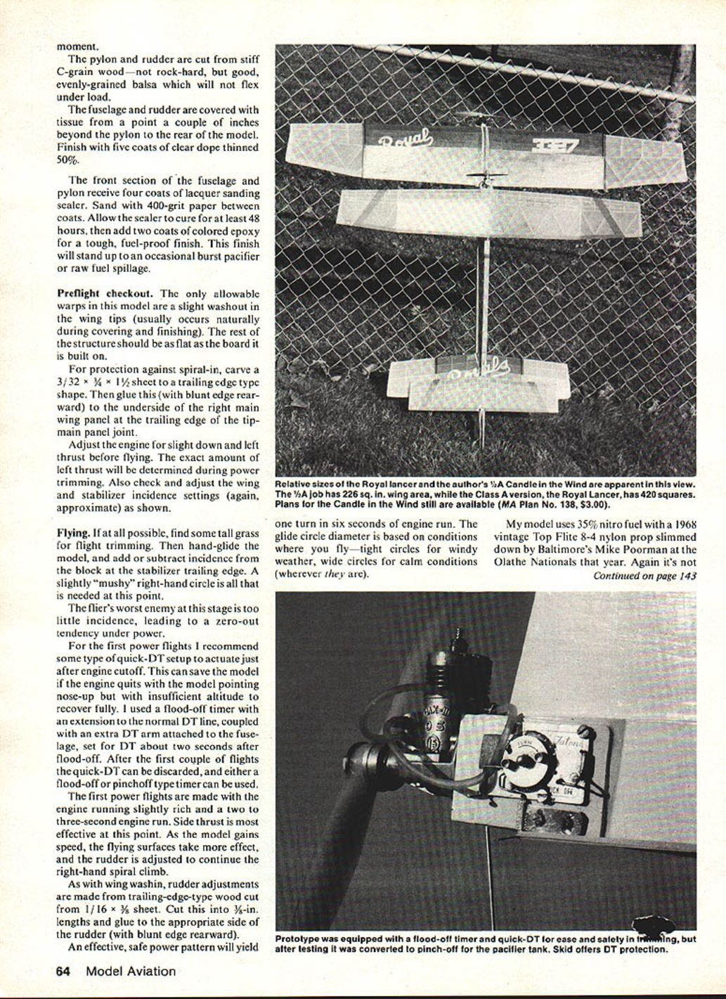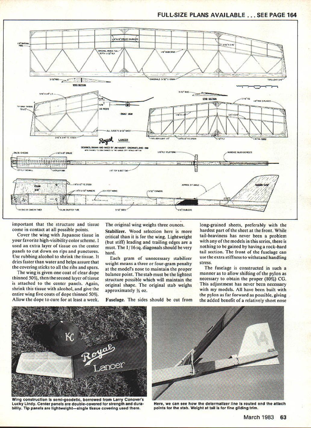 I 9ogul Iuncz dont need superpowerful engine well FF Powerthat dont tailor size weight model suit what ever engine have 420 squares 139 oz weight author found old OS Max 15 perfect match Construction U Jim Haught THIS MODEL derived form Candle Wind design pub lished April 1976 Model Aviation small 226 sq model fine competition usually disadvan tage Class 051 engine flown against its bigger brothersparticu larly flyoff situations designing Royal Lancer wanted experiment idea matching engine power airplane size principle seems ignored fliers today soon powerful engine given displacement comes out instantly bolted same size airplane its predecessor As result number airplanes contests simply cannot handle power plants erratic best Having old Max 15 hand fairly light engine compared todays 1 5s reasoned engine could ade quately fly older heavier airplane like Ramrod 432 would better slightly smaller lighter model 420 sq wing area 139 oz total weight appears Royal Lancer has achieved desired match Its ultimate Free Flight could either slightly smaller lighter good working combination gives high performance reliability built lighter though original weight likely would have increased repairs since few areas Wing Larry Conovers Lucky Lindy type construction borrowed model good tradeoff between strength weight stiffer straight-rib con struction yet heavy timeconsuming build full geodetic wing construction ribs light C-grain balsa diagonal ribs particular should cut stiff sheets must buckle under tension tissue covering Only template needed main ribs diagonals make tip diagonal ribs measure spar height rib station cut rib question proper length ribs should beveled good snug fit force-fit warps will result general stiffer heavier wood should concentrated toward center panels lighter wood tips ease construction turbulator spars put place until after dihedral installed wing fully assembled should thoroughly sanded fine sand paper 320-grit smooth glue bumps projections give light sanding 400-grit prepare covering ribs outlines given four coats clear dope thinned 50% helps moisture-proof structure give good base attaching covering structure gains good deal torsional rigidity tissue covering its very 62 Model Aviation really lightweight model can stand normal contest abuse occa sional DT onto runway corn field woods example long Taft has its obstructions structural toughness better built rather added later way models name comes Royal Lancers Kansas Citys season author Jim Haught Royal Lancer Class FF Covering Japanese tissue royal blue white mild 15 powers SIP SIMS SMAITS bINS FULL-SIZE PLANS AVAILABLE . SEE PAGE 164 [ II 1 S32SSS wrn 332 AlAS nM SECI3IASA ______L8A155 PLACES AS SEAS mis SEWIIAA ICOST ALL SISETS YSSS*ET YIAA S4TE STOCK -- VISSA SAM TWSWISSLQSS C VASLSTESTOCC Nrprp RnyatsA MCQE DRAWN AIIM INKED NT S SNARlS CRICSSINTIOAIA US CTCPLS PLOSPASMEDARKE NXKITSSEOCI VOCALS MC B U OffASO S-S MaEN N 5MAR55-A S C I- ---- -Lit -iY TOSALESS SCIESO TOOdIN SIKEFES TIff530 SNIS VS PLS FISCOASLL VrPLMPTRJ IS SOC AOTSMA important structure tissue come contact possible points Cover wing Japanese tissue favorite high-visibility color scheme used extra layer tissue center panels cut down rips punctures Use rubbing alcohol shrink tissue dries faster water helps assure covering sticks ribs spars wing given coat clear dope thinned 50% second layer tissue attached center panels Again shrink tissue alcohol give entire wing five coats dope thinned 50% Allow dope cure least week original wing weighs three ounces Stabilizer Wood selection critical wing Lightweight stiff leading trailing edges must 1 / 16 sq diagonals should very hard gram unnecessary stabilizer weight means three four-gram penalty models nose maintain proper balance point stab must lightest structure possible will maintain original shape original stab weighs approximately 3/s oz Fuselage sides should cut long-grained sheets preferably hardest part sheet front tail-heaviness has never problem models series nothing gained having rock-hard tail section front fuselage can use extra stiffness withstand handling stress fuselage constructed such manner allow shifting pylon necessary obtain proper 80% CG adjustment has never necessary models have built pylon far forward possible giving added benefit relatively short nose March 1983 63 cunsirucuon sum -gecasuc uorrowea worn Larry tunuver 5 Lucky Lindy Center pane s double-covered strength dura bility Tip panels lightweightsingle tissue covering used nere can see now ins aesermauzer iine romeo ana anacn points stab Weight tall tine gliding trim moment pylon rudder cut stiff C-grain woodnot rock-hard good evenly-grained balsa will flex under load fuselage rudder covered tissue point couple inches beyond pylon rear model Finish five coats clear dope thinned 50% front section fuselage pylon receive four coats lacquer sanding sealer Sand 400-grit paper between coats Allow sealer cure least 48 hours add two coats colored epoxy tough fuel-proof finish finish will stand up occasional burst pacifier raw fuel spillage Preflight checkout allowable warps model slight washout wing tips usually occurs naturally during covering finishing rest structure should flat board built protection against spiral-in carve 3/32 3/4 lA sheet toatrailingedgetype shape glue blunt edge rear ward underside right main wing panel trailing edge tipmain panel joint Adjust engine slight down left thrust before flying exact amount left thrust will determined during power trimming Also check adjust wing stabilizer incidence settings again approximate shown Flying possible find some tall grass flight trimming hand-glide model add subtract incidence block stabilizer trailing edge slightly mushy right-hand circle needed point fliers worst enemy stage too little incidence leading zero-out tendency under power first power flights recommend some type quick-DT setup actuate just after engine cutoff can save model engine quits model pointing nose-up insuffi