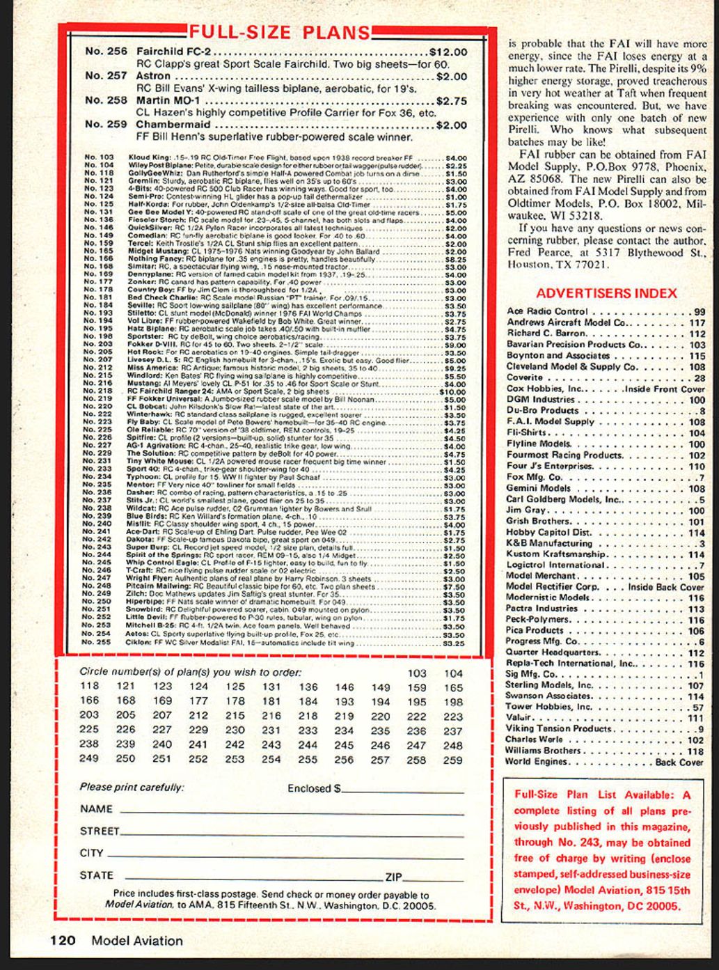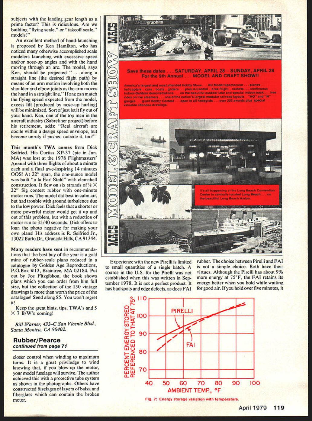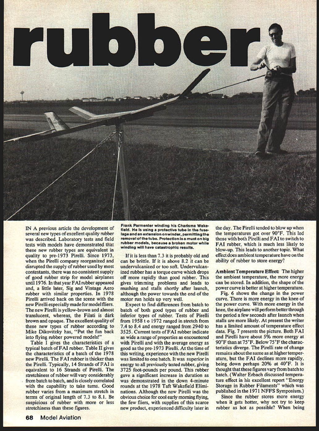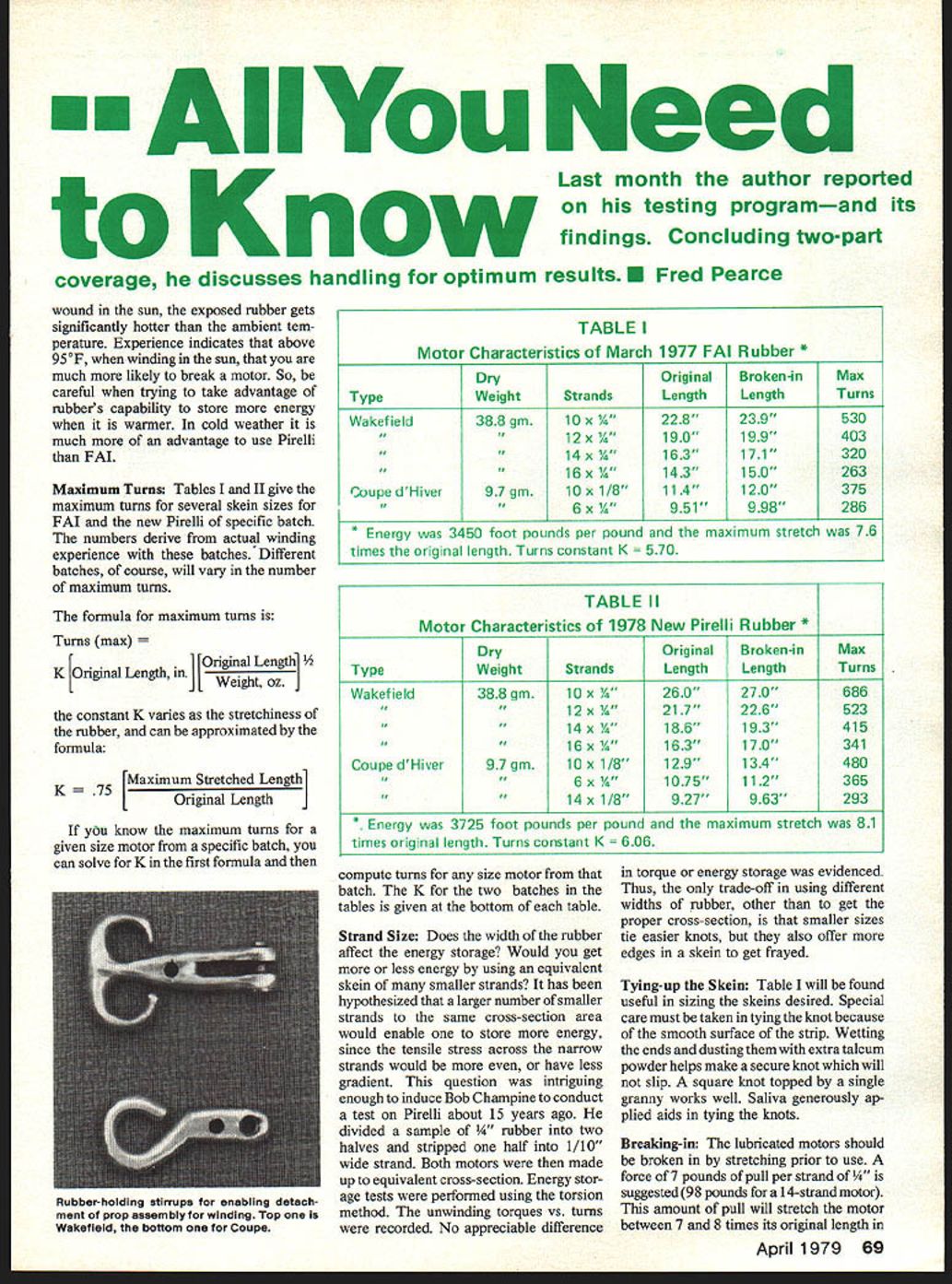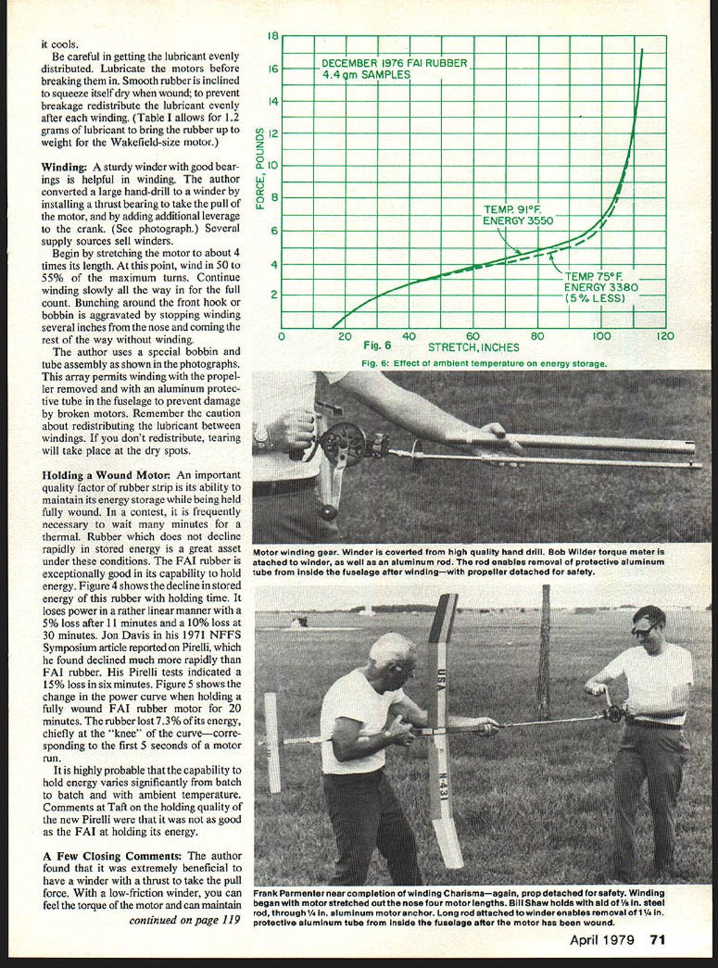 IN previous article development several new types excellent quality rubber described Laboratory tests field tests models have demonstrated new rubber types equivalent quality pre-1973 Pirelli Since 1973 Pirelli company reorganized disrupted supply rubber used contestants no consistent supply good rubber strip model airplanes until 1976 InthatyearFAlrubberappeared little later Sig Vintage Aero rubber similar properties 1978 Pirelli arrived back scene new Pirelli especially made model fliers new Pirelli yellow-brown almost translucent whereas Filati dark brown opaque excellent quality new types rubber according Mike Dikovitzky has Put fun back flying rubber powered models Table gives characteristics typical batch ofFAl rubber Table II gives characteristics batch 1978 new Pirelli FAI rubber thicker Pirelli Typically 14 Strands FAI equivalent 16 Strands Pirelli stretchiness rubber will valy considerably batch batch closely correlated capability take turns Good rubber varies maximum stretch terms original length 73 81 suspicious rubber less stretchiness figures Prank Parmenter winding Charisma Wake field using protective tube fuse lageandan extension onwinder permittingthe removai tube Protection isa must big rubber models because broken motor whiie winding wiii have catastrophic results less 73 probably old can brittle above 82 can undervulcanized too soft Undervulcan ized rubber has torque curve drops off rapidly good rubber gives trimming problems leads mushing stalls shortly after launch although power towards end motor run holds up very well Expect find differences batch batch both good types rubber inferior types rubber Tests Pirelli 1958 1972 ranged stretch 74 84 energy ranged 2940 3525 Current tests FAI rubber indicate wide range properties encountered Pirelli average energy good pre-1973 Pirelli time writing experience new Pirelli limited batch superior energy previously tested rubber giving 3725 foot-pounds per pound rubber gave significant increase duration demonstrated down 4-minute rounds 1978 Taft Wakefield Elimi nations Although new Pirelli obvious choice cool early morning flying few fliers supplies scarce new product experienced difficulty later day Pirelli tended blow up temperatures got over 900F led both Pirelli FAI switch FAI rubber much less likely blow-up leads another topic What effect does ambient temperature have ability rubber store energy Ambient Temperature Effect higher ambient temperature energy can stored addition shape power curve better higher temperature Fig 6 shows change power curve energy knee power curve energy knee airplane will perform better through period few seconds after launch stalls likely present writer has limited amount temperature effect data Fig 7 presents picture Both FAI Pirelli have about 5% energy 900F 750F Below 750F charac teristics diverge Pirelli rate change remains about same athighertemper ature FAI declines rapidly being down perhaps 20% 400F thought figures vary batch batch Waiter Erbach discussed tempera ture effect excellent report Energy Storage Rubber Filaments published 1971 NFFS Symposium Since rubber stores energy gets hotter try keep rubber hot possible being 68 Model Aviation AIIYou coverage discusses handling optimum resultsE Fred Pearce Won testing programand its no findings Concluding two-part wound sun exposed rubber gets significantly hotter ambient tem perature Experience indicates above 950F winding sun much likely break motor So careful trying take advantage rubbers capability store energy wanner cold weather much advantage use Pirelli FAI Maximum Turns Tables II give maximum turns several skein sizes FAI new Pirelli specific batch numbers derive actual winding experience batches Different batches course will vary number maximum turns formula maximum turns Turns max riginal Length m ] [Original Length IWeight oz J constant K varies stretchiness rubber can approximated formula K 75 [Maximum Stretched Length] Original Length J know maximum turns given size motor specific batch can solve K first formula TABLE Motor Characteristics March 1977 FAI Rubber * DryOriginalBroken-inMax TypeWeightStrandsLengthLengthTurns Wakefield388 gin10 x1/4228239530 12 x1/4190199403 14 xA163171320 16 x1/4~143150263 Coupe dHiver 97 gin10 x1/8114120375 6 x/951998286 * Energy 3450 foot pounds per pound maximum stretch 76 times original length Turns constant K TABLE II Motor Characteristics 1978 New Pirelli Rubber * DryOriginalBroken-inMax TypeWeightStrandsLengthLengthTurns Wakefield388 gin10 x260270686 12 x1/4~217226523 14 x1/4~186193415 16 x1/4163170341 Coupe dHiver 97 gin10 x1/8129134480 6 X1075112365 14 x1/8927963293 * Energy 3725 foot pounds per pound maximum stretch 81 times original length Turns constant K 606 compute turns size motor batch K two batches tables given bottom table Strand Size Does width rubber affect energy storage Would get less energy using equivalent skein smaller strands has hypothesized larger number smaller strands same cross-section area would enable store energy since tensile stress across narrow strands would have less gradient question intriguing enough induce Bob Champine conduct test Pirelli about 15 years ago divided sample er two halves stripped half 1/10 wide strand Both motors made up equivalent cross-section Energy stor age tests performed using torsion method unwinding torques vs turns recorded No appreciable difference torque energy storage evidenced Thus trade-off using different widths rubber other get proper cross-section smaller sizes tie easier knots also offer edges skein get frayed Tying-up Skein Table will found useful sizing skeins desired Special care must taken tying knot because smooth surface strip Wetting ends dusting extra talcum powder helps make secure knot will slip square knot topped single granny works well Saliva generously ap plied aids tying knots Breaking-in lubricated motors should broken stretching prior use force 7 pounds pull per strand ested 98 pounds 14-strand motor amou