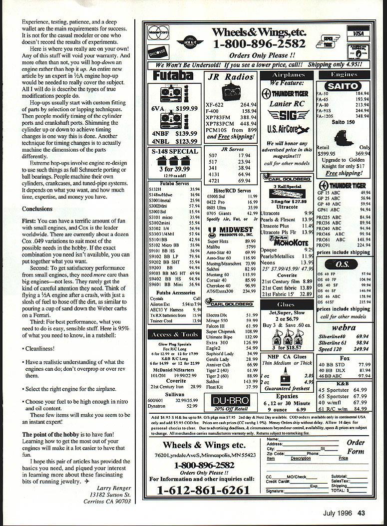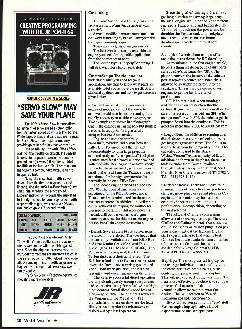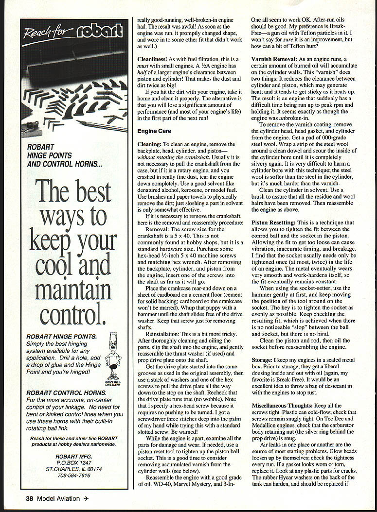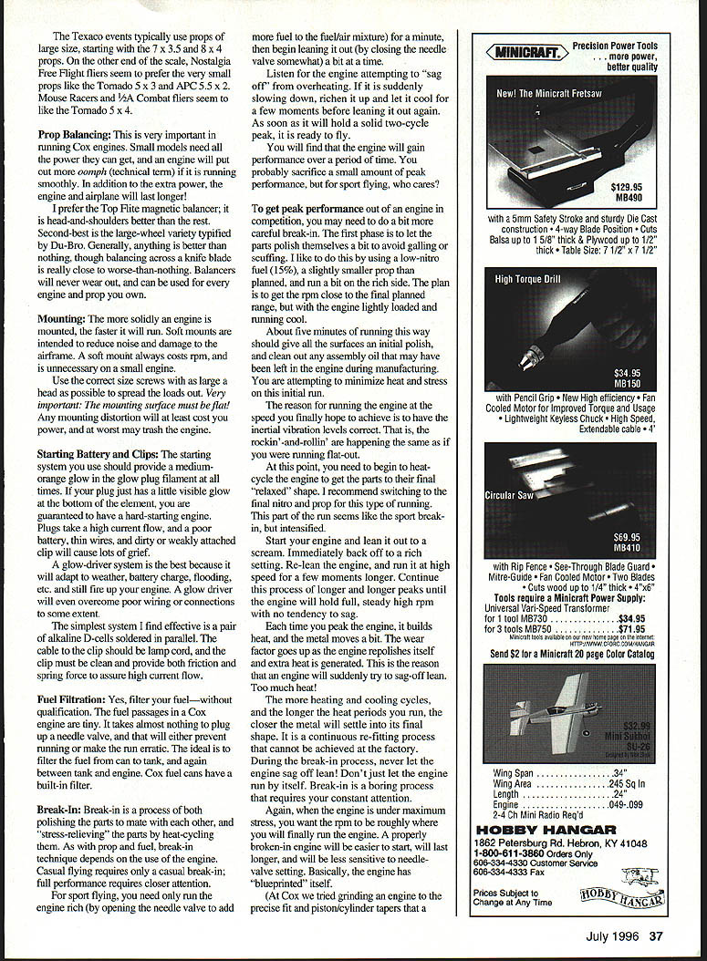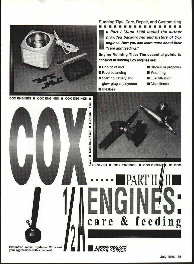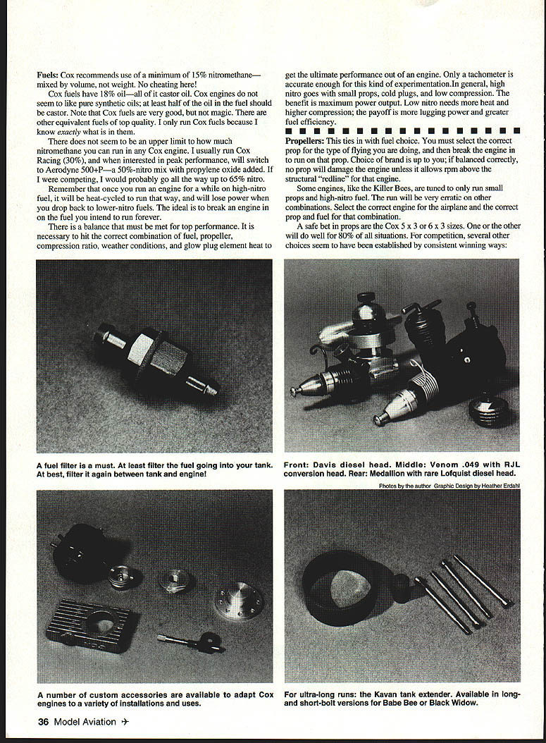 Running Tips Care Repair Customizing EE.EE EE...E n Part June 1996 issue author provided background history Cox E engines Now can learn about care feeding Engine Running Tips essential points consider running Cox engines Choice fuelU Choice propeller Prop balancingU Mounting Starting battery andU Fuel filtration glow-plug clip systemU Cleanliness Break-in COX ENGINES U COX ENGINES U COX ENGINES U 0 0 x m z 0 z m CD U 0 0 x m z 0 ni CD U 0 0 x ENGINES U COX ENGINES U COX ENGIN U.. ENS care & PART II IN feed II I ing Pistonlrod socket tightener Work out aggressions hammer July1996 35 U COX U 41 Fuels Cox recommends use minimum 15% nitromethane mixed volume weight No cheating Cox fuels have 18% oilall castor oil Cox engines seem like pure synthetic oils least half oil fuel should castor Note Cox fuels very good magic other equivalent fuels top quality run Cox fuels because know exactly what does seem upper limit much nitromethane can run Cox engine usually run Cox Racing 30% interested peak performance will switch Aerodyne 500Pa 50%-intro mix propylene oxide added competing would probably go way up 65% nitro Remember once run engine high-nitro fuel will heat-cycled run way will lose power drop back lower-nitro fuels ideal break engine fuel intend run forever balance must met top performance necessary hit correct combination fuel propeller compression ratio weather conditions glow plug element heat get ultimate performance out engine Only tachometer accurate enough kind experimentationIn general high nitro goes small props cold plugs low compression benefit maximum power output Low intro needs heat higher compression payoff lugging power greater fuel efficiency Propellers ties fuel choice must select correct prop type flying doing break engine m run prop Choice brand up balanced correctly no prop will damage engine unless allows rpm above structural redline engine Some engines like Killer Bees tuned run small props high-nitro fuel run will very erratic other combinations Select correct engine airplane correct prop fuel combination safe bet props Cox 5 x 3 6 x 3 sizes other will well 80% situations competition several other choices seem have established consistent winning ways 36 Model Aviation filter must least filter fuel going tank Front Davis diesel head Middle Venom 049 RJL best filter again between tank engine conversion head Rear Medallion rare Lofquist diesel head number custom accessories available adapt Cox ultra-long runs Kavan tank extender Available long engines variety installations uses short-bolt versions Babe Bee Black Widow Texaco events typically use props large size starting 7 x 35 8 x 4 props other end scale Nostalgia Free Flight fliers seem prefer very small propsliketheTomado5x3andAPC55x2 Mouse Racers Combat fliers seem like Tornado 5 x 4 Prop Balancing very important running Cox engines Small models need power can get engine will put out oomph technical term itis running smoothly addition extra power engine airplane will last longer prefer Top Flite magnetic balancer head-and-shoulders better rest Second-best large-wheel variety typified Du-Bro Generally anything better nothing though balancing across knife blade really close worse-than-nothing Balancers will never wear out can used engine prop own Mounting solidly engine mounted faster will run Soft mounts intended reduce noise damageto airframe soft mount always costs rpm unnecessary small engine Use correct size screws large head possible spread loads out Very important mounting surface must flat Any mounting distortion will least cost power worst may trash engine Starting Battery Clips starting system use should provide mediumorange glow glow plug filament times plug just has little visible glow bottom element guaranteed have hard-starting engine Plugs take high current flow poor battery thin wires dirty wealdy attached clip will cause lots grief glow-driver system best because will adapt weather battery charge flooding etc still fire up engine glow driver will overcome poor wiring connections some extent simplest system find effective pair alkaline D-cells soldered parallel cable clip should lamp cord clip must clean provide both friction spring force assure high current flow Fuel Filtration Yes filter fuelwithout qualification fuel passages Cox engine tiny takes almost nothing plug up needle valve will either prevent running make run erratic ideal filter fuel can tank again between tank engine Cox fuel cans have built-in filter Break-In Break-in process both polishing parts mate other stress-relieving parts heat-cycling As prop fuel break-in technique depends use engine Casual flying requires casual break-in full performance requires closer attention sport flying need run engine rich opening needle valve add fuel fuel/air mixture minute begin leaning out closing needle valve somewhat bit time Listen engine attempting sag off overheating suddenly slowing down richen up let cool few moments before leaning out again As soon will hold solid two-cycle peak ready fly will find engine will gain performance over period time probably sacrifice small amount peak performance sport flying cares get peak performance out engine competition may need bit careful break-in first phase let parts polish themselves bit avoid galling scuffing like using low-intro fuel 15% slightly smaller prop planned run bit rich side plan get rpm close final planned range engine lightly loaded running cool About five minutes running way should give surfaces imtial polish clean out assembly oil may have left engine during manufacturing attempting minimize heat stress initial run reason running engine speed finally hope achieve have inertial vibration levels correct rockin-and-rollin happening same running flat-out point need begin heatcycle engine get parts final relaxed shape recommend switching final nitro prop fur type running part run seems like sport breakin intensified Start engine lean out scream Immediately back off rich setting Re-lean engin