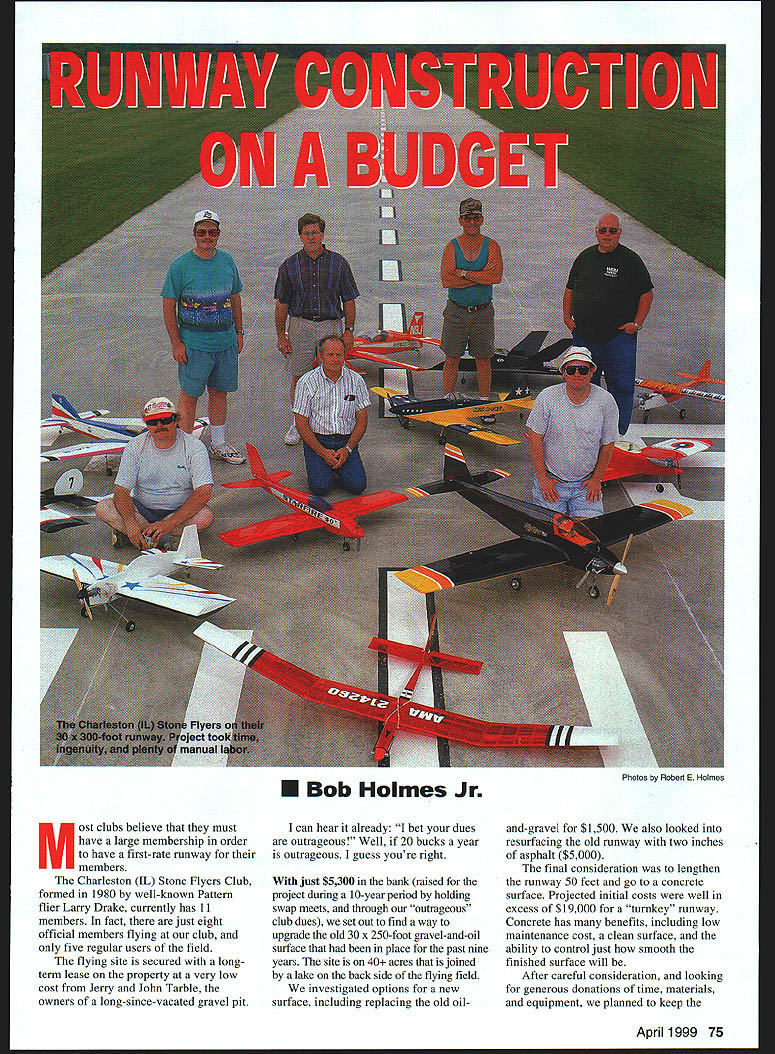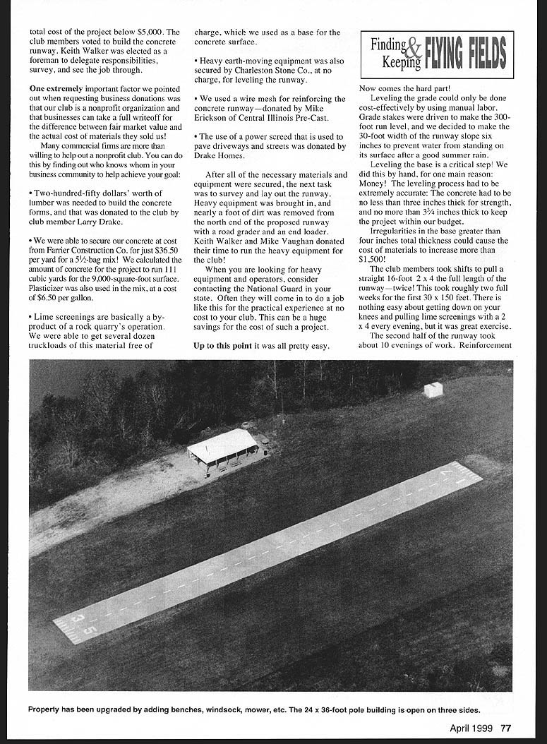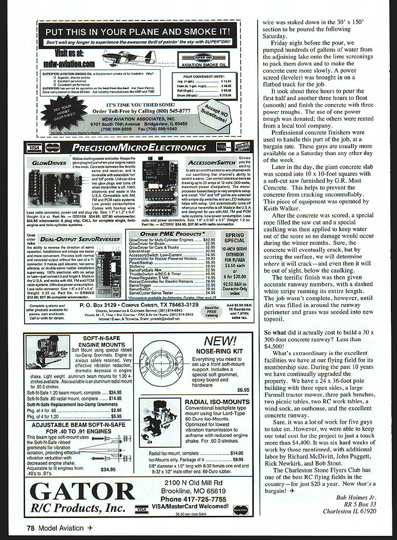 rtrtu U Bob Holmes Jr Photos Robert E Holmes Most clubs believe must have large membership order have first-rate runway members Charleston IL Stone Flyers Club formed 1980 well-known Pattern flier Larry Drake currently has 11 members fact just eight official members flying club five regular users field flying site secured longterm lease property very low cost Jerry John Tarble owners long-since-vacated gravel pit can hear already bet dues outrageous Well 20 bucks year outrageous guess youre right just $5300 bank raised project during 10-year period holding swap meets through outrageous club dues set out find way upgrade old 30 x 250-foot gravel-and-oil surface place past nine years site 40 acres joined lake back side flying field investigated options new surface including replacing old oiland-gravel $1500 also looked resurfacing old runway two inches asphalt $5000 final consideration lengthen runway 50 feet go concrete surface Projected initial costs well excess $19000 turnkey runway Concrete has benefits including low maintenance cost clean surface ability control just smooth finished surface will After careful consideration looking generous donations time materials equipment planned keep April 1999 75 total cost project below $5000 club members voted build concrete runway Keith Walker elected foreman delegate responsibilities survey see job through extremely important factor pointed out requesting business donations club nonprofit organization businesses can take full writeoff difference between fair market value actual cost materials sold us commercial firms willing help out nonprofit club can finding out knows business community help achieve goal Two-hundred-fifty dollars worth lumber needed build concrete forms donated club club member Larry Drake able secure concrete cost Farrier Construction Co just $3650 per yard 5-bag mix calculated amount concrete project run ill cubic yards 9000-square-foot surface Plasticizer also used mix cost $650 per gallon Lime screenings basically product rock quarrys operation able get several dozen truckloads material free charge used base concrete surface Heavy earth-moving equipment also secured Charleston Stone Co no charge leveling runway used wire mesh reinforcing concrete runwaydonated Mike Erickson Central Illinois Pre-Cast use power screed used pave driveways streets donated Drake Homes After necessary materials equipment secured next task survey lay out runway Heavy equipment brought nearly foot dirt removed north end proposed runway road grader end loader Keith Walker Mike Vaughan donated time run heavy equipment club looking heavy equipment operators consider contacting National Guard state Often will come job like practical experience no cost club can huge savings cost such project Up point pretty easy Findin RYIN FIEhN Keepin Now comes hard part Leveling grade could done cost-effectively using manual labor Grade stakes driven make 300foot run level decided make 30-foot width runway slope six inches prevent water standing its surface after good summer rain Leveling base critical step did hand main reason Money leveling process extremely accurate concrete no less three inches thick strength no 33A inches thick keep project within budget Irregularities base greater four inches total thickness could cause cost materials increase $1500 club members took shifts pull straight 16-foot 2 x 4 full length runwaytwice took roughly two full weeks first 30 x 150 feet nothing easy about getting down knees pulling lime screenings 2 x 4 evening great exercise second half runway took about 10 evenings work Reinforcement April 1999 77 Property has upgraded adding benches windsock mower etc 24 x 36-foot pole building open three sides I4A3S I Don wait longer experience awesome thrill paintin sky SUPER0DRII fl 5UPSRORI AVIATION SMOIOE OIL rite premicet 5155Cc oIl ecotelets AOtv f rlol Otenso eteckeflFOUR CONVENIENT UNITS awsteesoI Jag t1-oall .. $ 1200 5UPEOOftt5esaamad0nrepntaton ea S nave 00044 I-gal J55I..... $000 flaw neeSleeker Ask irdusOy manctadurern Ike AMP sort TMSj PCI tth$all $0000 $ 27500 Ii iTS TIME YOU TRIED SOME Order7 _I Gives ACCESSORYS WITCH ability add Ce eec/oS tuectevo aeychaeeel out sacriticieg chaneels ability cuettol aervo Cue control electrical devices drawieg 5 IS 25 aeu 12 veho 300 waCo maximum power disuipatise micro peeceasor baaed desige isoety aimple setup notaed install Os aed oIl puiets aelected siela dip switches Ce LEO indicator Low power consumptioehelps 5e54 Ueit automatically lutes off Comes hookup wirewhee trasamioer off Made itt USA Less redic coseactor power cell plug clip Size 17 0 12 o 54aed designed lot use AM FM PCM Weight 04 Part No OA 53495 $2750 wlconsectarradic systems Low power coesumptioo Less $4405 wlesssector & plug clip CALL complete aingla Imle-radic power coneectom Size 100 095 S 00 Weight 12 02 esgise twle-cylleder cyatamaPart No OU $3495 $3700 radio connector ONCe older DUAL-OUTPUT SEN yORE VERSWf woo ubility reveme direction ol Bmw oparuticn lnutallaticna settee am easie neera convesient Pmvides both nerma renamed output use 01 5 Y connector I- nlevator semt ailenoes orrudder isatallutict soper-easy tusai us USA arm edema wm radio systened Uhee-low pe. Less radio coneeclor Size Weight 025 01 Part N. $2495 $2750 complete wlcossectar Complete oystems other productS avadable Sir planes cars Cod Souls Cull weif S Sir defailo GlowDriver tot Multi-Cylinder Engines$4095 GlowDriver Boats3295 GlowDriver Curs & Trucks3295 ElevonMicer3095 AccessorySwitch Low-Current2495 IgnitionUnit Rocket Powerod Models3995 PowerBackup3695 SbServo2895 ServopuilSufs flow2295 ThrottloSmitch w/BEC & Timer4095 PowarRegulator 5 Volt1495 RetractController Eleotnc Rotracts2995 SetvoTrigger2295 ServoSwitch2995 ServoCycler Servo Tester2495 Connectors available fotAlrlronics Fotaba Nitac ill R 0 Box 3129 CORPUS CHRISTI TX 78463-31 29 AIlIl $5 00 SEN Ococes lsroeuutos & Cooncane Snezcr 361 814-6843 FREE add 7875% Hones M F lies Crennot FAX 