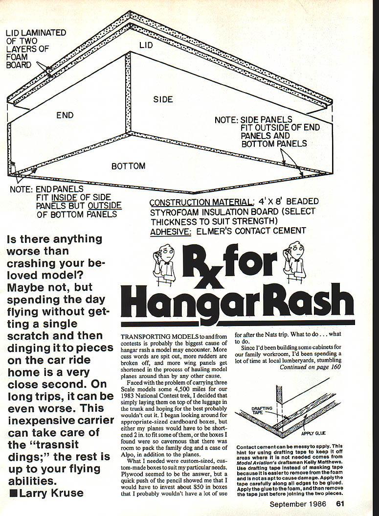 LID LAMINATED OF TWO FOAM BOARD NOTE SIDE PANELS FIT OUTSIDE OF END PANELS AND BOTTOM PANELS BOTTOM NOTE END PANELS FIT INSIDE OF SIDE PANELS BUT OUTSIDE OF BOTTOM PANELS CONSTRUCTION MATERIAL 4 X 8 BEADED STYROFOAM INSULATiON BOARD SELECT THICKNESS TO SUIT STRENGTH ADHESIVE ELMERS CONTACT CEMENT worse crashing Rfor loved model Maybe spending day nangor Rash flying getting single scratch dinging itto pieces car ride home very close second long trips can worse inexpensive carrier can take care trasnsit dings rest up flying abilities U Larry Kruse TRANSPORTING MODELS contests probably biggest cause hangar rash model may encounter cuss words spit out rudders broken off wing panels get shortened process hauling model planes around other cause Faced problem carrying three Scale models some 4500 miles 1983 National Contest trek decided simply laying top luggage trunk hoping best probably wouldnt cut began looking around appropriate-sized cardboard boxes either planes would have short ened 2 fit some boxes found cavernous room pack family dog case Alpo addition planes What needed custom-sized cus tom-made boxes suit particular needs Plywood seemed answer quick push pencil showed would have invest about $50 boxes probably wouldnt have lot use after Nats trip What t Since Id building some cabinets family workroom Id spending lot time local lumberyards stumbling Continued page 160 Contact cement can messyto apply hint using drafting tape keep off areas needed comes ModelAviations draftsman Keiiy Matthews Use drafting tape instead masking tape because easierto remove foam apt cause damage Appiythe tape carefuiiy along edges glued Applythe glue tothe foam andthen remove tape just before joining two pieces September 1986 61 anything V Box 1063 Lorain Ohio 44055 282-8354 PEANUT SCALE Piper Vagabond Outdoor kits each. 3650 LightIndoorkitseach.3695 OUTDOOR PEANUT SuperScale. 3695 SPORT SCALE PC-6 Porter q Taylor Crall Stinson Voyager Rubber CO2 Power PC-S PorterKits each. 3750 fIPORT MODELS n Embryo Model lb l8 Span gned win beginners experts. 3750 HARD-TO-FIND ITEMS Early Bird Tissue Antique Aircraft 3595 True Olde Japanese Tissue 10 3 colors 95 Japanese Tissue 12 6 colors 3395 Microlite ham3325 Silver$395 Microfilm 3375 Glue Solvent Condenser Paper 3 sheets 3315 Plan Service over 17 Scale Sport Scale & Peanut Scale Rubber Strip 020 thirs 085each 3175 3132 thirs 5/32each 3105 Winder 61 395 Mark 1161 105 Complete Line Brown CO2 Motors Balsa Wood Outdoor & Indoor Sheets & Strips Add 10% Postage mum Postage 3150 COMPLETE CATALOG 3150 close switch also use two-pin connector interface radio beacon can easily change radios have problem part battery nine-volt alkaline transistor radio battery can fly weekend months single battery radio bea cons avallable have advertised NFFS Digest Model Builder over last year Some addresses write further infor mation Bradley Model Products 1337 Pine Sap Ct Orlando FL 32817 Gil Morris 2810 Brackley Rd Columbus OH 43220 Jim Wal ston Retrieval Systems 725 Cooper Lake Rd SE Smyrna GA 30080 Lost models have accepted us being price must pay enjoying Free Flight modeling Well about change think retrieval systems will common Free Flights future DTs today Bill Hartill 7513 Sausalito Ave Canoga Park CA 91307 FF Old-Timers/Haught Continued page 60 may beneficial sand inside mating portions left right tail post pieces good contact joined Glue together well making sure two sides evenly bent whole structure symmetrical viewed above Add remaining cross pieces between jig-area tail post glue dry remove cardboardjigby cutting parts needed get out Pull nose fuselage together required install remaining cross pieces Any tension needed keep nose pieces pulled together can supplied rublerbands clamps Finish up structure adding formers stringers other parts required Some Old-Timer fuselages built using crutch method essentially consists building sturdy frame top view fuselagethe so-called crutch crutch instill pinned building board top bottom case may members added usually consist formers stringers although may simply built-up truss stick structure Alignment important agaln use cardboard jigs fixtures can valuable aid struc ture completely dry removed plan completed midalr Alterations modifications original design features Old-Timers intended used SAM O-T competition discouraged simply allowed example sheet balsa cannot substituted built-up structures although struc tural changes can added improve strength Beef up built-ups approved prac tice An example necessary strengthening use larger wing spars absorb landing shockloads incurred dethermalizing process Another example adding extra fill-sheeting between structural members nose area aid handling model particularly engine running use laminated tips wings tall sections popular old method joining sections cut sheet balsa led weak struc tures warpage covering Laminated tips can quickly built up form cut corrugated cardboard Wax edges form crayon prevent glue adhering form Cut laminations sheet stock place water approxi mately 15 minutes Pull bend first strip around form Secure rubberbands Add glue pull second strip around form adjusting rubberbands keep strips place Continue process until laminations installed Allow assembly dry thoroughly may speed up &ying time baking whole works oven low heat Some modelers prefer use CyA glues laminating wood must dry set sharp bends required prefer wet method Built-up models work pride accomplishment greater nothing quite like sight sunlight shining through open structure model soars quietly overhead Clarence Haught 3226 Honeysuckle Dr Coeur dAlene ID 83814 Rx Rash/Kruse Continued page 61 around trying find everything needed course weekend stum bles fell stack beaded Styrofoam panels intended insulation purposes available 4 x 8-ft sheets various thicknesses ally neat thing about Styrofoam sheet under $5 answer problemif could fmd some way stick stuff together Because wanted put boxes together minimum mess labor o