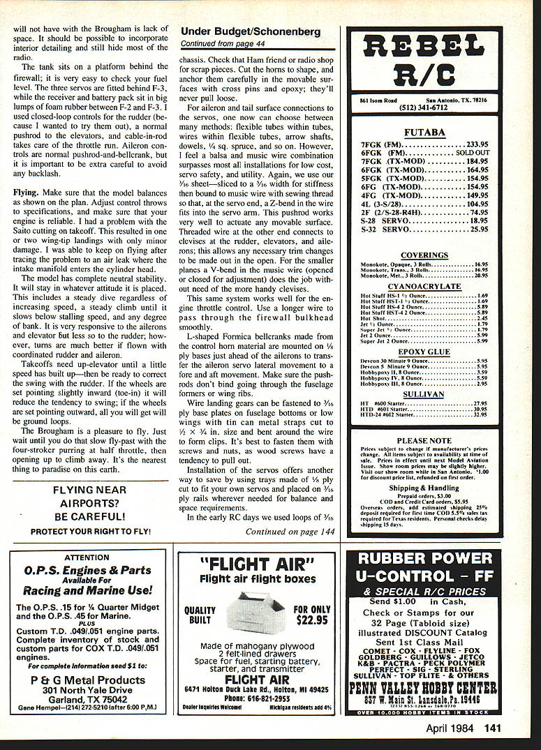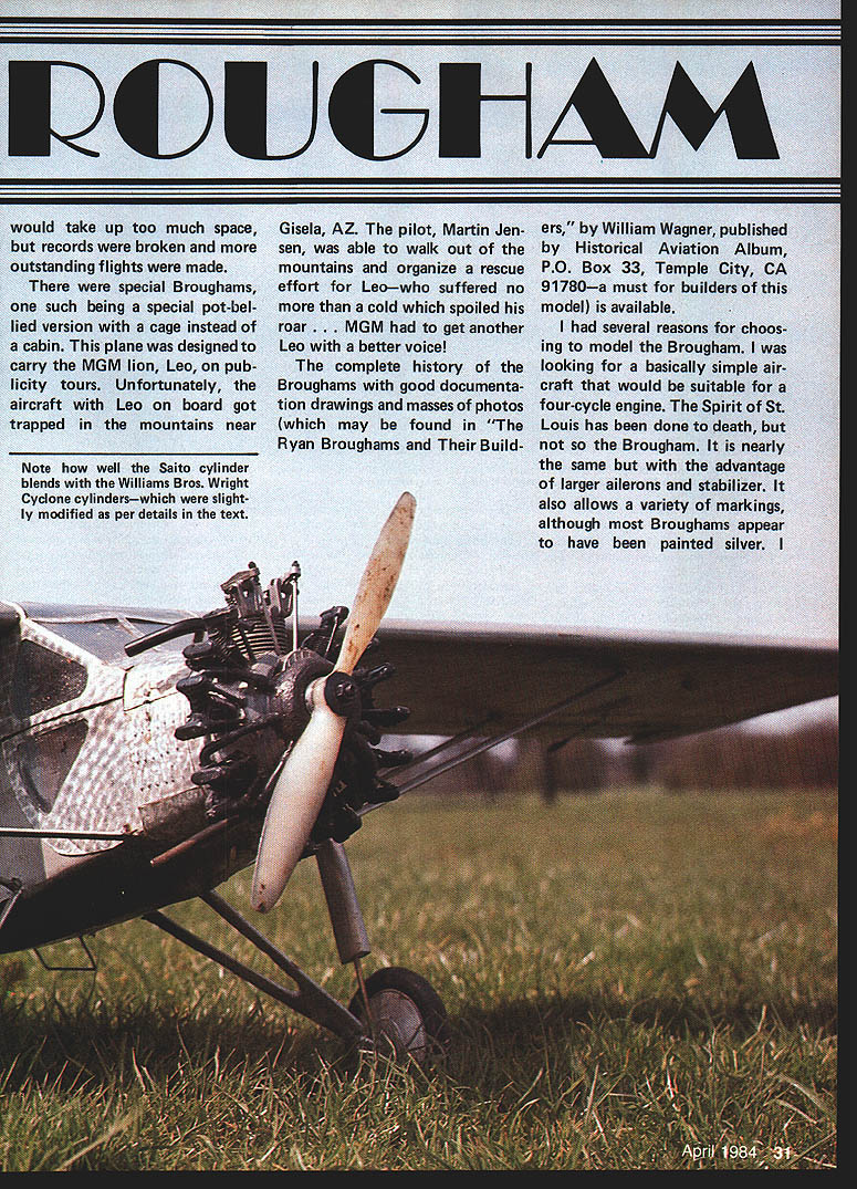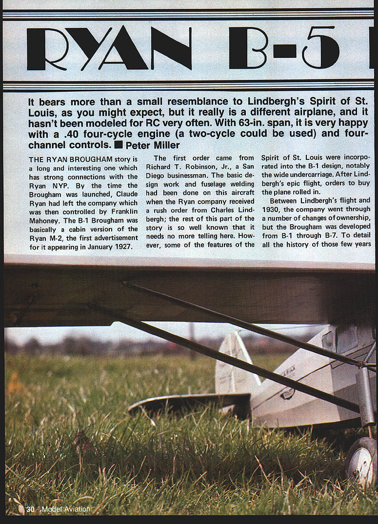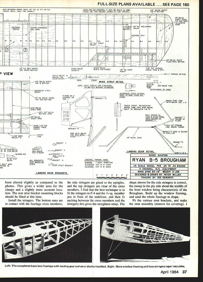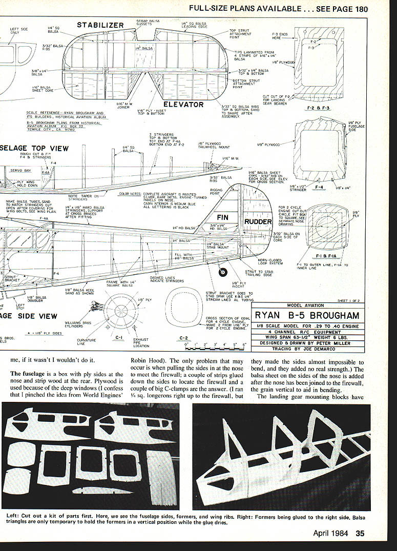 THE RYAN BROUGHAM story long interesting has strong connections Ryan NYP time Brougham launched Claude Ryan left company controlled Franklin Mahoney B-i Brougham basically cabin version Ryan M-2 first advertisement appearing January 1927 first order came Richard T Robinson Jr San Diego businessman basic de sign work fuselage welding done aircraft Ryan company received rush order Charles Lind bergh rest part story well known needs no telling ever some features Spirit St Louis incorpo rated B-i design notably wide undercarriage After Lind berghs epic flight orders buy plane rolled Between Lindberghs flight 1930 company went through number changes ownership Brougham developed B-i through B-7 detail history few years / rs small resemblance Lindberghs Spirit St Louis might expect really different airplane hasnt modeled RC very often 63-in span very happy 40 four-cycle engine two-cycle could used fourchannel controls U Peter Miller would take up too much space records broken outstanding flights made special Broughams such being special pot-bel lied version cage instead cabin plane designed carry MGM lion Leo pub licity tours Unfortunately aircraft Leo board got trapped mountains near Note well Saito cylinder blends Williams Bros Wright Cyclone cylinderswhich slight ly modified per details text C 1 Gisela AZ pilot Martin Jen sen able walk out mountains organize rescue effort Leowho suffered no cold spoiled roar. MGM get another Leo better voice complete history Broughams good documenta tion drawings masses photos may found Ryan Broughams Build4 ers William Wagner published Historical Aviation Album PO Box 33 Temple City CA 91780a must builders model available several reasons choos ing model Brougham looking basically simple air craft would suitable four-cycle engine Spirit St Louis has done death Brougham nearly same advantage larger ailerons stabilizer also allows variety markings although Broughams appear have painted silver Lack dihedral small tail surfaces give model neutral stability axes means its model rank beginner shouldnt problem anyone has mastered flight aileron trainer didnt mind because wanted engine-turned panels cowling area mentioned wanted something suit able four-cycle engine Some Scale subjects best four-cycle others need two-cycle engine Illustrating point Tiger Moth Enya 35 4C flew strip full-size based owner fullsize Tiggy said some neighbors commented flying Sunday ger hangar day stabilizer removed other hand tried fly Pitts Special four-cycle engine just did look feel sound right two-cycle engine transformed real Pitts Brougham right fourcycle will course fly well normal two-cycle engine Saito 40 just about perfect Saito 45 would give power have felt need try Any other four-cycle 40s would although Saito blends scale Wright Whirlwind almost perfectly case anyone hasnt guessed am four-cycle nut Construction pretty simple basic box stringers plank wing about will explain build some less-conventional parts compare photos plan will notice some variations because found some minor points unnecessaryothers made things difficult plan repre sents latest thinking Two points before get down nitty-gritty building First dont frightened struts around land ing gear LG conventional rest mostly show take tension loads wing struts Likewise metal paneling looks good easy Believe Its basically simple model build struts stringers mice seem though its complicated really view gives impression Brougham sitting airfield Thirties Realism vivid model flying WWW U FlOE Er -r CHUCL WE IOTAITS tVUA LmTLECERTIFICA1ONTJD LITTLE PLOTWELL -Y@IJRE UP ONZf7 LETEQ POM 7145PILOT WHATW4A%E YOU IS MJNGFIRST THE MARINE CORPS FRIENDLY THERSMANWEROFHUMAi4READING ThERE CONTIUENTALAJQNOW THE GOV-GU ISHE-SH 4E-R PETE SAKE SPACE-- FLIGHTYLJR LITTLE 4AAII $FLUNJEO SHESIJUJECTTOLETS SEETE T---CERTIFCHII5OJ THIS IS YOUCEWTIFICA11ON# THATA SHORT ESSE mess ccurrDP_TO Q7 OUT OP S-a I/4SQ POSTANOL E3/32 FILL LE V4BLOCK 1/16 SHEET CORE 3/32 RIBS EH SIDE MW JOINER SAME ASRUIXIEF I/16SHEET TOP ONLY 1/4 PLY SRR WEB THRUC/S 1/8 X I/4STRtIGERS K 3/8 X SIRS I/16X 1/4 LMWflONS U7/8WHEL ON MW1/4 SL ALUM TUeNG I/8BALSA KEEL FULL LENGTH TO F 2 I/4SO BALSA FRAMING I/S X 1/4 FAIRLEADS VB PLY BOTH SIDES VB PLY CiS FILLER KRAFT 40 MOUNT SAITO 40 4 STROKE L/32 LY 1 AILERON HORN- BELLCRANK -10 7SERV IN WING 3/8 50 LE AlL -a- 7 -I/8X ITE ALL WING ROBARIS BALSA BLOCKING COWL AND EXIjUST WILUAMS BROS CYLINDERS 18 C 2 I/BPLY SLiUBE V4BALSA / V8 MW6EAR TO MAPLE MOUNTS / BALSA FAIRINGS TTINGS SEC DELS BRASSlUBE WITH BALSA F1JRNG -a \ 1/4 X HAROWOOD CLEVIS-ENDED ROOS FROM 3/16SQ NBRASSlUBE D TELESCNG TUBING TO WORK UPAND DOWN3/32 SQI 1A4SQ LE P1BRASS ROD 3 3/4 WILUAMS BROS GOLDEN AGE /1 V8 SHEET ji TIP FORMS 1/16 SlEEl LETOPA BOTTOM IAS0SR4RS lOPANO BOlTOM -a-a PANELS AND DOORS ARE LITHO PLATES PAINTED SILVERF LONGA BOLTS- 7 PANELS IN LI IfA PLY SOS FORENGINE TURN 2 CYCLE ENGINEOF THIS LINE MOTOR MOUNT ADJUST TO SUIT ENGINE MOUNT B CABIN DETAIL MAPLI BLOCII / ENGINE TURNING IS DONE WITH RUBBER PAD ON ELECTRIC MOTOR WITH AUTO VALVE GRIMJING PASTE F-I SF-IAF-2N ERAPT B 02 FUEL TANK HARDWOOD BOCE HARDWOOD- ATTACH COWL HOLD DOWNCO SIDES S F-I FIT AFTER JOINING SIDES LA B USE ERAFT ORI SAITO 40ESS 40 MOUNT ENGINE SHOWN COWL HOLD \DOWN /Al 1/F -I II C-IC-2-- LG ~ 2 GJMMY-II EXHAUST-PIPESF-IAII II USE B WILLIAMS BROS I-1f2 II SCALE WRIGHT WHIRLWIND CYLINDERS-OMIT TOP ONE FOR ENGINEI COVER FUSELAGE SIDES WITH VB BALSA SHEET BETWEEN F-I AND F-S BLEND TOSHAE AT F-I R TO NOTHING AT F-2 Left Rudder control via scalelike closed-loop cables Turnbuckles workable Tail wheel fixed Lettering rub-off type art supply store Right Landing gear actually simple two-wire system dummy shock struts Remaining struts take tension loads 34 Model Aviation close relationship between Ryan Brougham Lindberghs Ryan NYP Spirit St Louis obvious view Its readily apparent NYP features went Broughams FULL-SIZE PLANS AVAILABLE . SEE PAGE 180 SCRAP BALSA LEFT SIDE/ STABILIZERGUSSETSiA SO