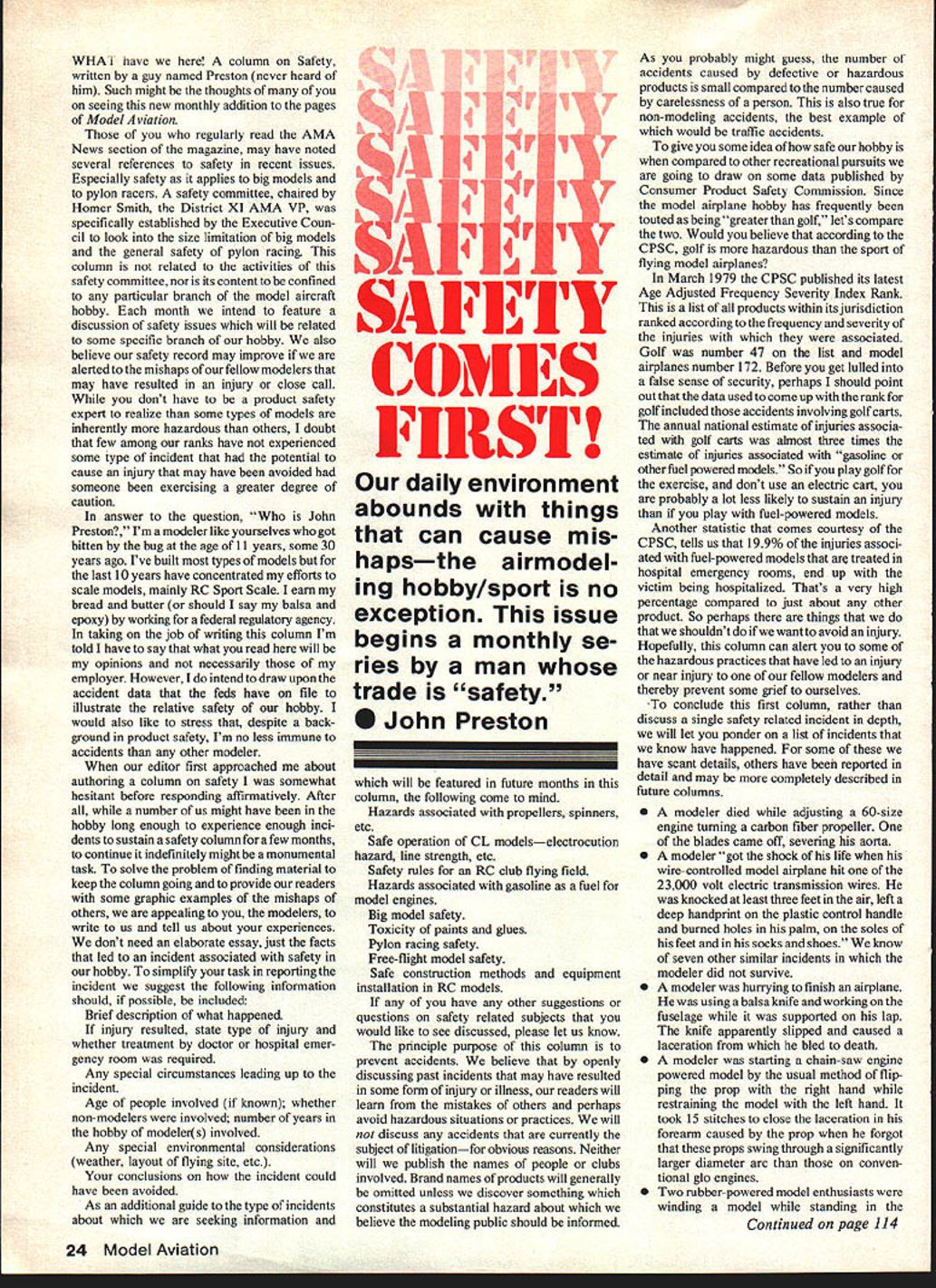 WHA1 have column Safety written guy named Preston never heard him Such might thoughts of seeing new monthly addition pages Model Aviation regularly read AMA News section magazine may have noted several references safety recent issues Especially safety applies big models pylon racers safety committee chaired Homer Smith District XI AMA VP specifically established Executive Coun cil look size limitation big models general safety pylon racing column related activities safety committee nor its content confined particular branch model aircraft hobby month intend feature discussion safety issues will related some specific branch hobby also believe safety record may improve alerted mishaps fellow modelers may have resulted injury close call dont have product safety expert realize some types models inherently hazardous others doubt few among ranks have experienced some iype incident potential cause injury may have avoided someone exercising greater degree caution answer question John Preston Im modeler like yourselves got bitten bug age 11 years some 30 years ago Ive built types models last 10 years have concentrated efforts scale models mainly RC Sport Scale earn bread butter should say balsa epoxy working federal regulatory agency taking job writing column Im told have say what read will opinions necessarily employer However intend draw upon accident data feds have file illustrate relative safety hobby would also like stress despite back ground product safety Im no less immune accidents other modeler editor first approached about authoring column safety somewhat hesitant before responding affirmatively After number us might have hobby long enough experience enough inci dents sustain safety column few months continue indefinitely might monumental task solve problem finding material keep column going provide readers some graphic examples mishaps others appealing modelers write us tell us about experiences dont need elaborate essay just facts led incident associated safety hobby simpli task reporting incident suggest following information should possible included Brief description what happened injury resulted state type injury whether treatment doctor hospital emer gency room required Any special circumstances leading up incident Age people involved known whether non-modelers involved number years hobby modelers involved Any special environmental considerations weather layout flying site etc conclusions incident could have avoided As additional guide type incidents about seeking information SAFEIIT COMES FIRST daily environment abounds things can cause mis hapsthe airmodel ing hobby/sport no exception issue begins monthly se ries man trade safety John Preston will featured future months column following come mind Hazards associated propellers spinners etc Safe operation CL modelselectrocution hazard line strength etc Safety rules RC club flying field Hazards associated gasoline fuel model engines Big model safety Toxicity paints glues Pylon racing safety Free-flight model safety Safe construction methods equipment installation RC models have other suggestions questions safety related subjects would like see discussed please let us know principle purpose column prevent accidents believe openly discussing past incidents may have resulted some form injury illness readers will learn mistakes others perhaps avoid hazardous situations practices will discuss accidents currently subject litigationfor obvious reasons Neither will publish names people clubs involved Brand names products will generally omitted unless discover something constitutes substantial hazard about believe modeling public should informed As probably might guess number accidents caused defective hazardous products small compared number caused carelessness person also true non-modeling accidents best example would traffic accidents give some idea safe hobby compared other recreational pursuits going draw some data published Consumer Product Safety Commission Since model airplane hobby has frequently touted being greater golf lets compare two Would believe according CPSC golf hazardous sport flying model airplanes March 1979 CPSC published its latest Age Adjusted Frequency Severity Index Rank list products within its jurisdiction ranked according frequency severity injuries associated Golf number 47 list model airplanes number 172 Before get lulled false sense security perhaps should point out data used come up rank golf included accidents involving golf carts annual national estimate injuries associa ted golf carts almost three times estimate injuries associated gasoline otherfuel powered models So play golf exercise dont use electric cart probably lot less likely sustain injury play fuel-powered models Another statistic comes courtesy CPSC tells us 199% injuries associ ated fuel-powered models treated hospital emergency rooms end up victim being hospitalized Thats very high percentage compared just about other product So perhaps things we shouldnt want avoid injury Hopefully column can alert some hazardous practices have led injury near injury fellow modelers thereby prevent some grief ourselves conclude first column rather discuss single safety related incident depth will let ponder list incidents know have happened some have scant details others have beeh reported detail may completely described future columns modeler died adjusting 60-size engine turning carbon fiber propeller blades came off severing aorta modeler got shock life wire-controlled model airplane hit 23000 volt electric transmission wires knocked least three feet air left deep handprint plastic control handle burned holes palm soles feet socks shoes know seven other similar incidents modeler did survive modeler hurrying finish airplane using balsa knife working fuselage supported lap knife apparently slipped caused laceration bled death modeler starting chain-saw engine powered model usual method flip ping prop right hand restraining model left hand took 15 stitches 