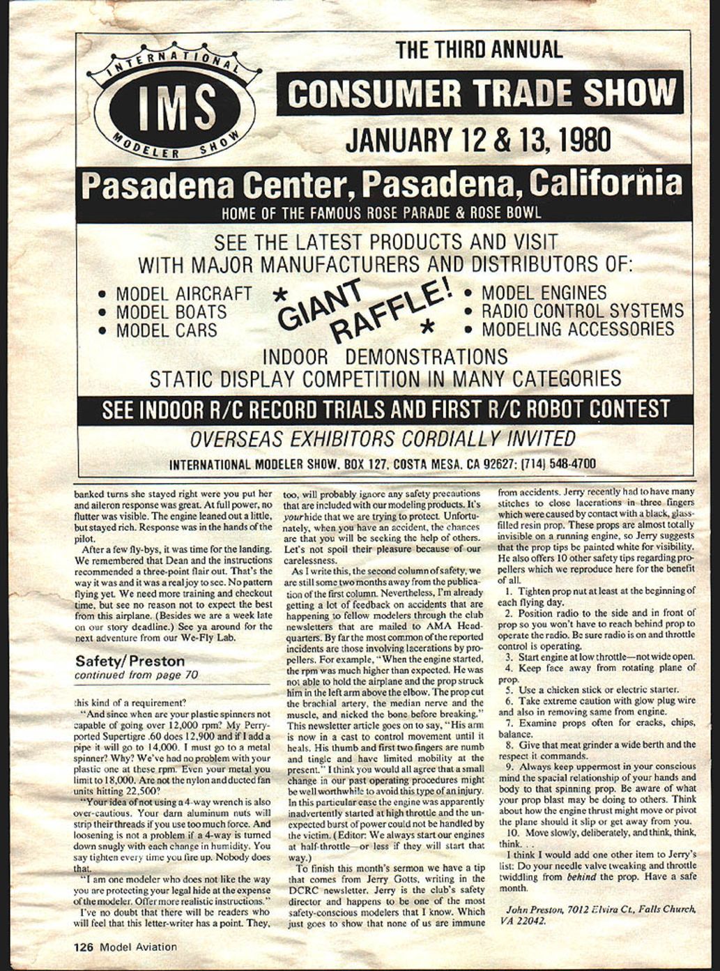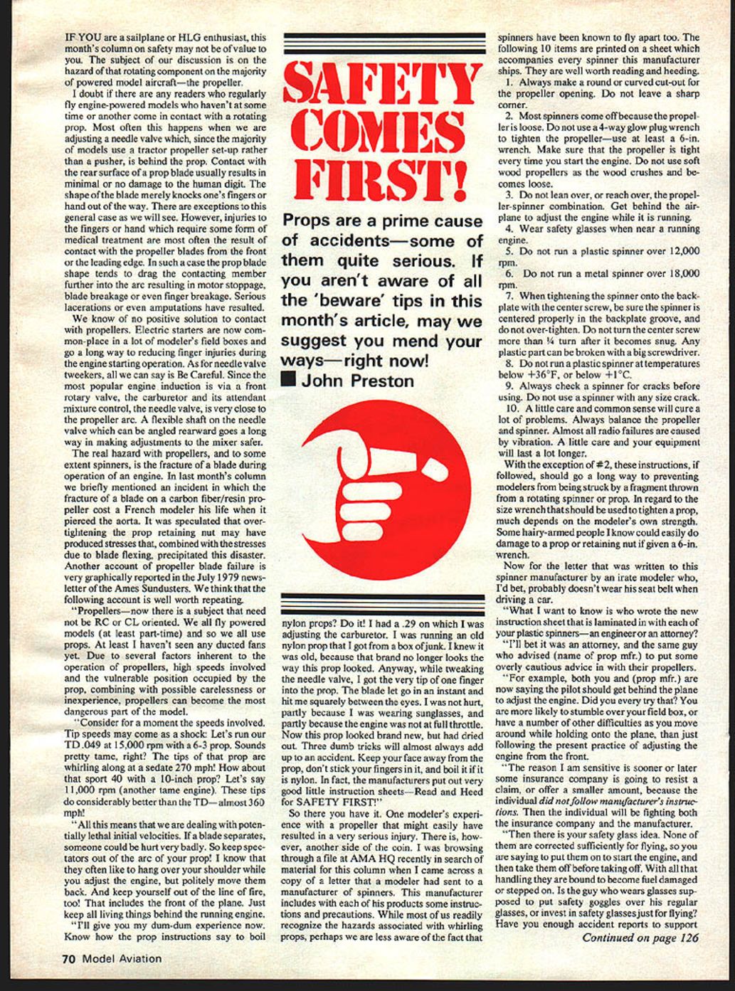 IF YOU sailplane HLG enthusiast months column safety may value subject discussion hazard rotating component majority powered model aircraftthe propeller doubt readers regularly fly engine-powered models havent some time another come contact rotating prop Most often happens adjusting needle valve since majority models use tractor propeller set-up rather pusher behind prop Contact rear surface prop blade usually results minimal no damage human digit shape blade merely knocks ones fingers hand out way exceptions general case will see However injuries fingers hand require some form medical treatment often result contact propeller blades front leading edge such case prop blade shape tends drag contacting member further arc resulting motor stoppage blade breakage finger breakage Serious lacerations amputations have resulted know no positive solution contact propellers Electric starters now com mon-place lot modelers field boxes go long way reducing finger injuries during engine starting operation As needle valve tweekers can say Careful Since popular engine induction via front rotary valve carburetor its attendant mixture control needle valve very close propeller arc flexible shaft needle valve can angled rearward goes long way making adjustments mixer safer real hazard propellers some extent spinners fracture blade during operation engine last months column briefly mentioned incident fracture blade carbon fiber/resin pro peller cost French modeler life pierced aorta speculated over tightening prop retaining nut may have produced stresses combined stresses due blade flexing precipitated disaster Another account propeller blade failure very graphically reported July 1979 news letter Ames Sundusters think following account well worth repeating Propellersnow subject need RC CL oriented fly powered models least part-time use props least havent seen ducted fans yet Due several factors inherent operation propellers high speeds involved vulnerable position occupied prop combining possible carelessness inexperience propellers can become dangerous part model Consider moment speeds involved Tip speeds may come shock Lets run TD 049 15000 rpm 6-3 prop Sounds pretty tame right tips prop whirling along sedate 270 mph about sport 40 10-inch prop Lets say 11000 rpm another tame engine tips considerably better TD almost 360 mph means dealing poten tially lethal initial velocities blade separates someone could hurt very badly So keep spec tators out arc prop know often like hang over shoulder adjust engine politely move back keep yourself out line fire too includes front plane Just keep living things behind running engine Ill give dum-dum experience now Know prop instructions say boil QAUUi rv 7AIId AK COMES FIRST Props prime cause accidentssome quite serious arent aware beware tips months article may suggest mend waysright now U John Preston nylon props 29 adjusting carburetor running old nylon prop got box ofjunk knew old because brand no longer looks way prop looked Anyway tweaking needle valve got very tip finger prop blade let go instant hit squarely between eyes hurt partly because wearing sungiasses partly because engine full throttle Now prop looked brand new dried out Three dumb tricks will almost always add up accident Keep face away prop dont stick fingers boil it nylon fact manufacturers put out very good little instruction sheetsRead Heed SAFETY FIRST So have modelers experi ence propeller might easily have resulted very serious injury ever another side coin browsing through file AMA HQ recently search material column came across copy letter modeler sent manufacturer spinners manufacturer includes products some instruc tions precautions us readily recognize hazards associated whirling props perhaps less aware fact spinners have known fly apart too following 10 items printed sheet accompanies spinner manufacturer ships well worth reading heeding 1 Always make round curved cut-out propeller opening leave sharp corner 2 Most spinners come off because propel ler loose use 4-way glow plug wrench tighten propelleruse least 6-in wrench Make sure propeller tight time start engine use soft wood propellers wood crushes comes loose 3 Do lean over reach over propel ler-spinner combination Get behind air plane adjust engine running 4 Wear safety giasses near running engine 5 Do run plastic spinner over 12000 rpm 6 Do run metal spinner over 18000 rpm 7 When tightening spinner onto backplate center screw sure spinner centered properly backplate groove over-tighten turn center screw after becomes snug Any plastic part can broken big screwdriver 8 Do run plastic spinner temperatures below 360F below 1 0C 9 Always check spinner cracks before using use spinner size crack 10 little care common sense will cure lot problems Always balance propeller spinner Almost radio failures caused vibration little care equipment will last lot longer exception #2 instructions followed should go long way preventing modelers being struck fragment thrown rotating spinner prop regard size wrench should used tighten prop much depends modelers own strength Some hairy-armed people know could easily damage prop retalning nut given 6-in wrench Now letter written spinner manufacturer irate modeler Id bet probably doesnt wear seat belt driving car What want know wrote new instruction sheet laminated plastic spinnersan engineer attorney Ill bet attorney same guy advised name prop mfr put some overly cautious advice propellers example both prop mfr now saying pilot should get behind plane adjust engine Did try likely stumble over field box have number other difficulties move around holding onto plane just following present practice adjusting engine front reason am sensitive sooner later some insurance company going resist claim offer smaller amount because individual did follow manufacturers instruc tions individual will fighting both insurance company manufacturer safety glass idea None corrected sufficiently flying saying put start engine take