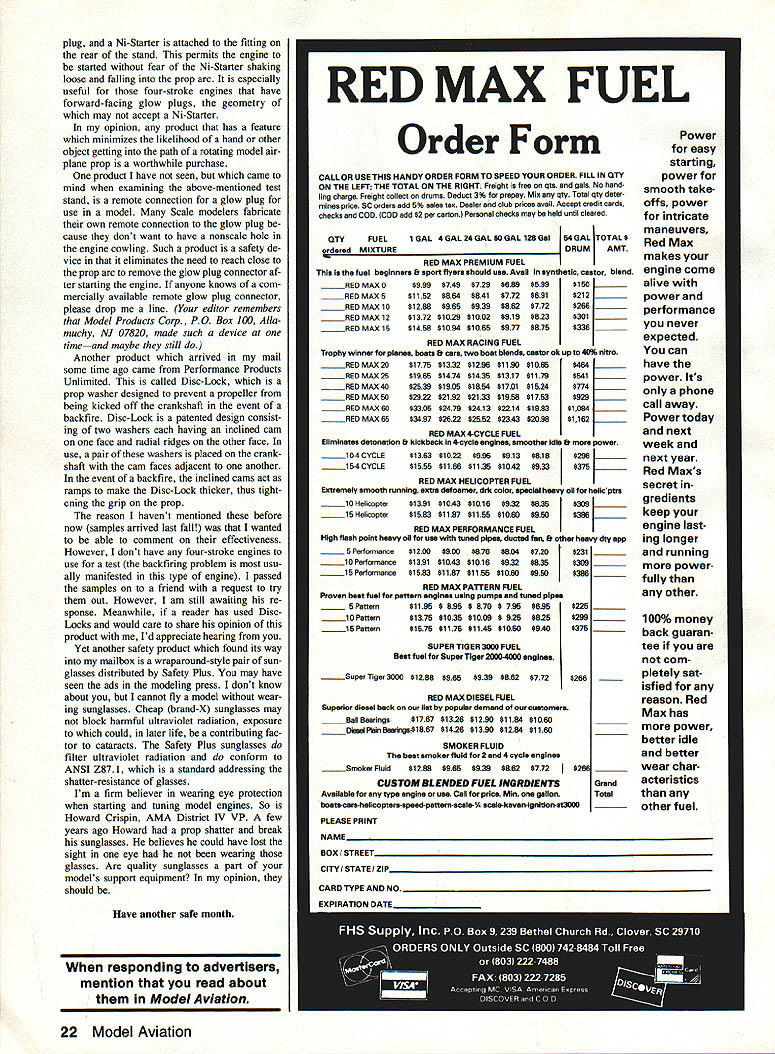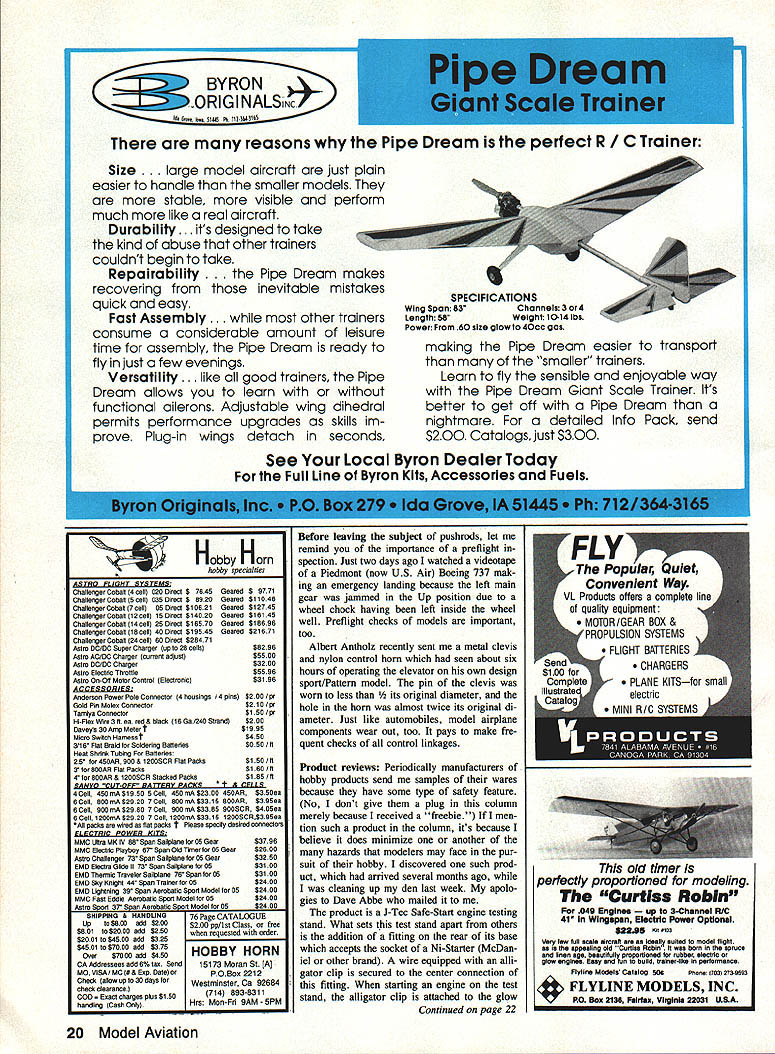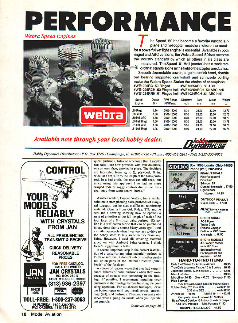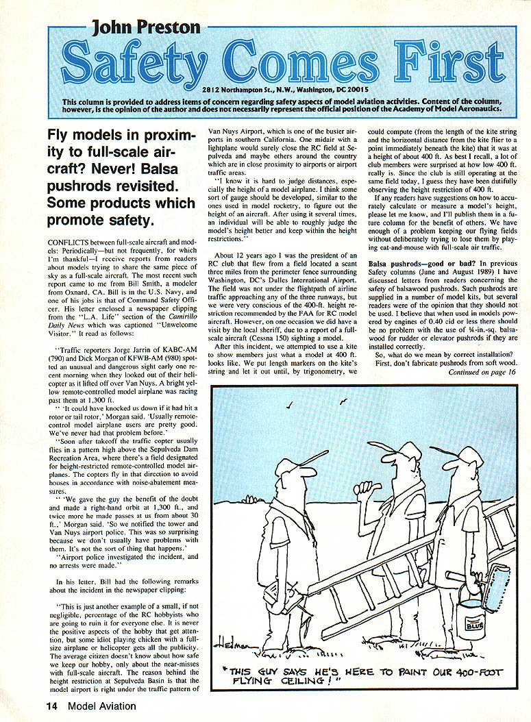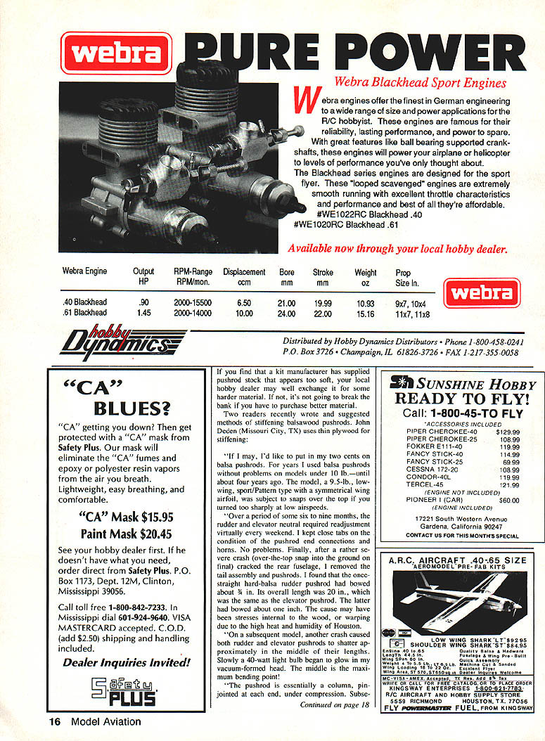 John Preston Safety512 Comes First Northampton St NW WashIngton DC 20015 column provided address Items concern regarding safety aspects model aviation activIties Content column however opInIon author does necessarily represent offidal position tie Academy Model Aeronautics Fly models proxim ity full-scale air craft Never Balsa pushrods revisited Some products promote safety CONFLICTS between full-scale aircraft mod els Periodicallybut frequently Im thankfulI receive reports readers about models trying share same piece sky full-scale aircraft recent such report came Bill Smith modeler Oxnard CA Bill US Navy jobs Command Safety Offi cer letter enclosed newspaper clipping LA Life section Camirillo Daily News captioned Unwelcome Visitor' read follows Traffic reporters Jorge Jarrin KABC-AM 790 Dick Morgan KFWB-AM 980 spot ted unusual dangerous sight early re cent morning looked out heli copter lifted off over Van Nuys bright yel low remote-controlled model airplane racing past 1300 ft could have knocked us down hit rotor tail rotor Morgan said Usually remotecontrol model airplane users pretty good Weve never problem before Soon after takeoff traffic copter usually flies pattern high above Sepulveda Dam Recreation Area theres field designated height-restricted remote-controlled model air planes copters fly direction avoid houses accordance noise-abatement mea sures gave guy benefit doubt made right-hand orbit 1300 ft twice made passes us about 30 ft Morgan said So notified tower Van Nuys airport police surprising because dont usually have problems Its sort thing happens Airport police investigated incident no arrests made letter Bill following remarks about incident newspaper clipping just another example small negligible percentage RC hobbyists going ruin everyone else never positive aspects hobby get atten tion some idiot playing chicken fullsize airplane helicopter gets publicity average citizen doesnt know about safe keep hobby about near-misses full-scale aircraft reason behind height restriction Sepulveda Basin model airport right under traffic pattern Van Nuys Airport busier air ports southern California midair lightplane would surely close RC field Se pulveda maybe others around country close proximity airports airport traffic areas know hard judge distances espe cially height model airplane think some sort gauge should developed similar ones used model rocketry figure Out height aircraft After using several times individual will able roughly judge models height better keep within height restrictions' About 12 years ago president RC club flew field located scant three miles perimeter fence surrounding Washington DCs Dulles International Airport field under flightpath airline traffic approaching three runways very conscious 400-ft height re striction recommended FAA RC model aircraft However occasion did have visit local sheriff due report fullscale aircraft Cessna 150 sighting model After incident attempted use kite show members just what model 400 ft looks like put length markers kites string let out until trigonometry could compute length kite string horizontal distance kite flier point immediately beneath kite height about 400 ft As best recall lot club members surprised low 400 ft really Since club still operating same field today guess have dutifully observing height restriction 400 ft readers have suggestions accu rately calculate measure models height please let know Ill publish fu ture column benefit others have enough problem keeping flying fields deliberately trying lose play ing cat-and-mouse full-scale air traffic Balsa pushrodsgood bad previous Safety columns June August 1989 1 have discussed letters readers concerning safety balsawood pushrods Such pushrods supplied number model kits several readers opinion should used believe used models pow ered engines 040 cid less should no problem use -in-sq balsawood rudder elevator pushrods installed correctly So what mean correct installation First dont fabricate pushrods soft wood Continued page 16 14 Model Aviation 1 t ThIS UY S&r UE WERE T OU 4o0-FOYr FLYINEr CEIL1N E POWER bra Blackhead Sport Engines lhlebra engines offer finest German engineering WV awide range size powerapplicationsforthe R/O hobbyist engines famous reliability lasting performance power spare great features like ball bearing supported crankshafts engines will power airplane helicopter levels performance youve thought about Blackhead series engines designed sport flyer looped scavenged engines extremely smooth running excellent throttle characteristics performance best theyre affordable #WE1O22RC Blackhead 40 #WE1O2ORC Blackhead 61 Available now through local hobby dealer Webra EngineOutputRPM-RangeDisplacement HPRPM/mon BoreStrokeWeightProp mmmmozSize 902000-15500 1452000-14000 6502100199910939x7 10x4 100024002200151611x711x8 Distributed Hobby Dynamics Distributors e 1-800-458-0241 PO Box 3726 Champaign IL 61826-3726 FAX 1-217-355-0058 AL BLUES CA getting down get protected CA mask Safety Plus mask will eliminate CA fumes epoxy polyester resin vapors air breath Lightweight easy breathing comfortable CA Mask $1595 Paint Mask $2045 See hobby dealer first doesnt have what need order direct Safety Plus PO Box 1173 Dept 12M Clinton Mississippi 39056 Call toll free 1-800-842-7233 Mississippi dial 601-924-9640 VISA MASTERCARD accepted COD add $250 shipping handling included Dealer Inquiries Invited find kit manufacturer has supplied pushrod stock appears too soft local hobby dealer may well exchange some harder material its going break bank have purchase better material Two readers recently wrote suggested methods stiffening balsawood pushrods John Deden Missouri City TX uses thin plywood stiffening may Id like put two cents balsa pushrods years used balsa pushrods problems models under 10 lbuntil about four years ago model 95-lb lowwing sport/Pattern type symmetrical wing airfoil subject snaps over top turned too sharply low airspeeds Over period some six nine mon