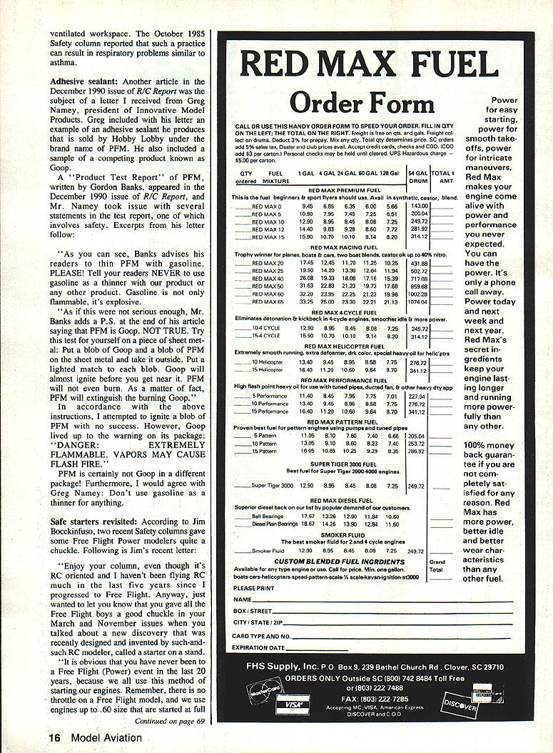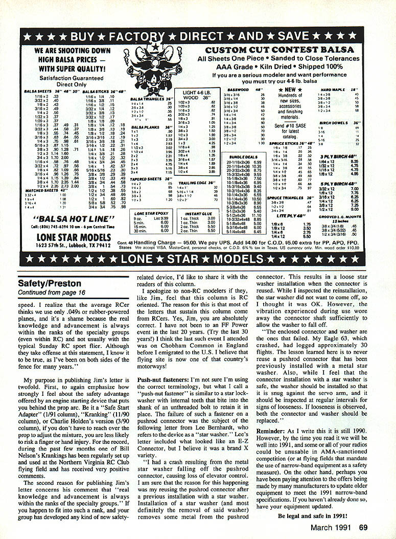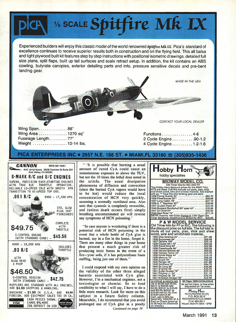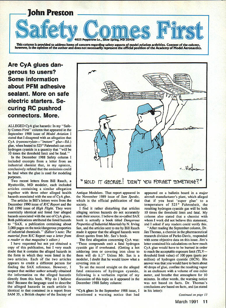 John Preston KiafetyVoes First d Are CyA glues dan gerous users Some information about PFM adhesive sealant safe electric starters Se curing RC pushrod connectors ALLEGED CyA glue hazards Safe ty Comes First column appeared September 1988 issue Model Aviation stated disagreed allegation CyA cyanoacrylate instant glueEd glue heated 525 Fahrenheit can emit hydrogen cyanide quantity will 10 times threshold limit fatal December 1988 Safety column included excerpts letter industrial chemist opinion conclusively refuted emissions could fatal glue used modeling purposes Two recent letters Bill Rauch Hyattsville MD modeler included articles containing similar allegation together three other alleged health hazards associated use CyA glue articles Bills letters December 1990 issue RIC Report Fall 1990 issue High Flight essentially identical listed four alleged hazards associated use CyA glues Both publications attributed listed hazards SAX publication containing about 3000 pages toxic/dangerous properties industrial chemicals Editors note material RIG Report letter reader magazines editor have requested yet obtained copy publication very much doubt contains alleged hazards form listed two articles two articles appears credit different person finding SAX reference However suspect neither author actually obtained information alleged hazards directly book believe Because language used describe alleged hazards article identical contained report SAM 35 British chapter Society Antique Modelers report appeared November 1989 issue Sam Speaks official publication society find rather disturbing articles alleging serious hazards accurately state source believe so-called SAX book actually book titled Dangerous Properties Industrial Materials N Irving Sax articles sent tome Bill Rauch made appear alleged hazards direct quotes Mr Saxs book first allegation concerning CyA compounds emit fatal hydrogen cyanide gas overheated Getting hot soldering iron covering iron close will Unless Mr Sax modeler doubt would know what covering iron set record straight alleged fatal emissions hydrogen cyanide following verbatim reprint discussion topic appeared December 1988 Safety column CyA glue September 1988 issue mentioned warning notice appeared bulletin board major aircraft manufacturers plant alleged heat super glue temperature 5250 Fahrenheit resulting hydrogen cyanide gas will both 10 times threshold limit fatal column also stated chemist work did believe statement asked readers could verify After reading September column Dr Jim Thomas chemist pharmaceutical research division Parke-Davis responded some objective data issue Jims letter contained calculations much CyA glue would have burned order reach acceptable exposure limit TLV threshold limit value 100 ppm parts per million hydrogen cyanide HCN answer would have burn about 40 drops glue confine resulting vapor enclosure volume cubic meter breathe atmosphere 10 minutes other words warning notice based facts Dr Thomass conclusions based facts stated letter Continued page 13 March 1991 11 column provIded address items concern regardIng safety aspects model aviation actIvities Content column however opinion author does necessarily represent offidal position Academy Model Aeronautics -V pV t4OLt IT o- IDNI YGIU ET $EThINc- CANNON805 581-5061- -RIC SYSTEMS 2828 Cochran St Suite 281 Simi Vattey CA 93065 C-MARK N/C U/C ENGINES SUPERB PRECISION EASYSTARTING ENGINES WITH TRUE R/CTHROTTLEOPERATION RELIABLE LOSPEED IDLE WITH SMOOTH RPM TRANSITION TO HI-SPEED TOP END 061 N/C- 17500 RPM STO GLOW PLUG NOT FURNISHED COMPLETE WITH THROTTLE U-CONTROL ENGINE$4550 WITH STANDARD CARB 6000 -18000RPM INCLUDES 03 N/CTHROTTLE WITH GLOW HEAD 8 PROP $46 UCONTROL VERSION WITH STANDARD CARB $4215 MUFFLERS ARE STANDARD WITH ALL ENGINES ADD $450 SHIPPING & HANDLING BROCHURE IN USA AND$300 FOREIGN ADD EQUIPMENT SALES TAX IN CA jCASH PRICES SHOWN VISACARDS 6%MORE _____20% DEPOSIT ON COD possible burning usual amount cured CyA could cause instantaneous exposure above TLV 10 times lethal dose noted article usual dissipation phenomena diffusion convection since burned CyA vapors would have hot would reduce local concentration HCN very quickly assuming normally ventilated area Also note cyanosis completely reversible unless death occurs first simply breathing uncontaminated air will reverse symptoms HCN poisoning case anyone wondering potential risk HCN poisoning event whole bottle CyA glue burned say fire home forget other things home present much greater risk producing toxic fumes event fireyour sofa has polyurethane foam stuffing being just could respond own opinion validity other three alleged hazards associated CyA glue However Im mechanical engineer toxicologist chemist So lend credibility what will say have little research Look subject future Safety column Meanwhile recommend avoid prolonged use CyA glue poorly Continued page 16 MIUWMY MODEL CO Old Timer Kits B/C AND FF Hobby Horn discount prices MMC FULL KITS listed Full Kits include cut parts plan strip sheet wood wire window material Kits marked ' have wire landing gear pre-bent 1936 FlyIng Quaker 84$6476 1938 Powerhouse 50*$2996 1937 Long Cabin 18$4716 1939 T Sportater 50$2698 1937 Quaker Flash 67$4556 1940 Buzzard Bombshell 50 span kit*$3596 1937 Air Chief 61$3596 IAQNew Ruler 74 $7116 N LW Thermic 100 GliderEajjaLkjI 100 S p Old Timer Sailplane--modifications shown R/Cl 0 P &WMODEL SERVICE Old Timer kits FF RIG following discount price full kits full kits clude cut pans plan stick sheet wood wire windshield material 1935 Miss America 84$7196 1936 Buccaneer 84$5996 1937 DallaIre 108$7516 1938 Clipper Mk 172$5328 1938 Kioud King 63$4236 1938 Powerhouse 84$5356 1938 Record Breaker 96$6956 1938 Trenton Terror 72$4076 1939 Korda Wake 44$1916 1939 Mercury 72$5836 1939 Zipper 54$5356 1940 Ranger 46$3196 1940 Sailplane 78$6476 1940 So Lonq 50$3036 1941 Brigidier 56$4076 1941 Super Quaker 76$7276 1941 Playboyjr 54$3116 1941 Playboy Sr 76$7276 1941 B