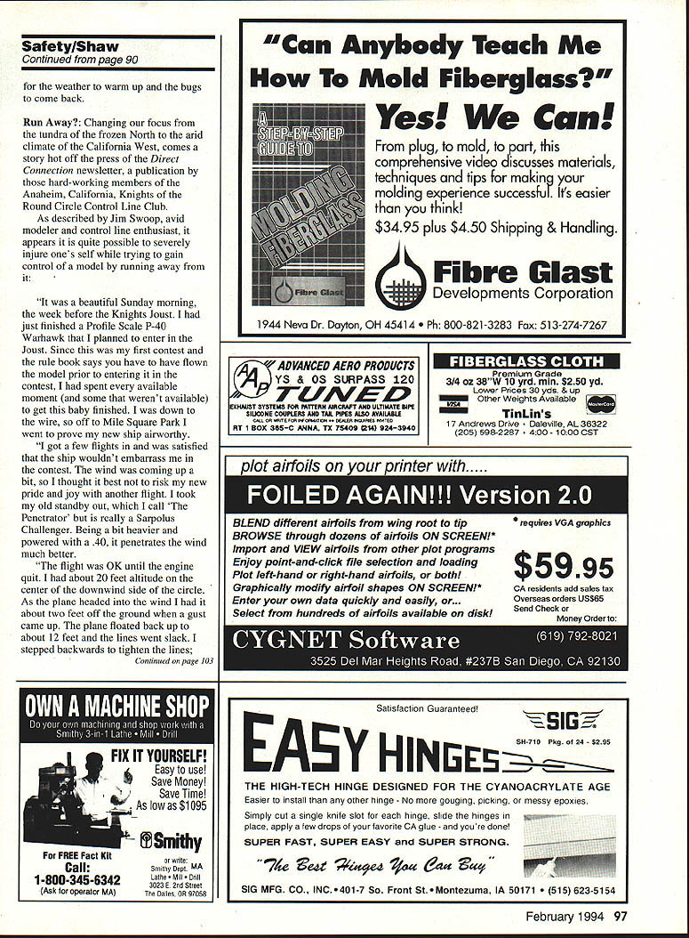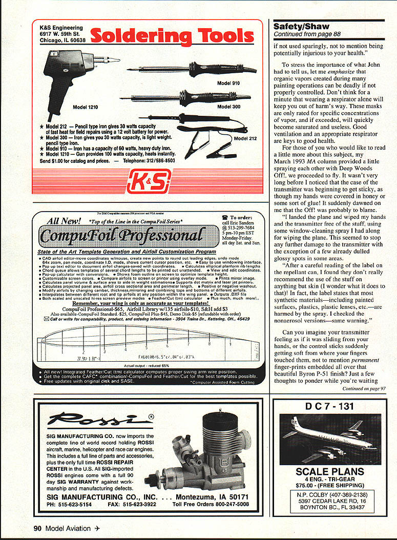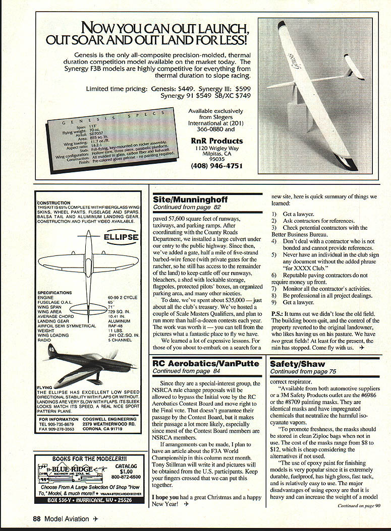 U Gary Shaw CHECK THOSE BATTERIES recent phone call veteran Pattern flier Albert Glenn Memphis Tennessee brought back mind easily can save aircraft early trip garbage can simply checking batteries prior flight Albert shared preventable story about rival Pattern flier lost control aircraft crashed because low receiver battery poweran electrical condition created case one-toomany flights say preventable story because simple battery voltage check VOM Volt-Ohm-Milliammetcr after flight needed avoid losing aircraft prevent injuries get true representation battery condition recommend checking batteries \% 4 . just before flight again right after landing Checking right after landing lets know battery condition its lowest level After half-hour batteries can bounce back enough give false sense security however under load quickly return post-flight levels check batteries often seem getting less less usable flight time field cycling remove built up memory may order Several excellent battery cyclers available purpose through hobby shops catalogues nationwide cyclers charge batteries peak discharge slowly timing duration discharge display after being cycled least twice dont see increase battery cycling time indicates cell has gone bad needs replaced Its easy routine get used cheaper replacing entire aircraft year again Santa has come gone new year has rung building projects delivered elves well underway No doubt have already finished basic construction waiting some warmer weather little painting recently scanning August 1993 newsletter Belleville RC Flyers Mascoutah Illinois picked up valuable tip may benefit trigger finger old paint gun itching John Benson writes Health Safety Division 3M company warns hazardous isocyanate vapors formed epoxy paint mixed its catalyst vapors inhaled can cause severe respiratory damage injurious vapors build up body over time point sensitization leads severe allergic reaction no antidote condition modelers warned use appropriate ventilation combined February 1994 75 Painting Precautions Its time ofContinued page 88 SitelMunninghoff Continued page 82 paved 57600 square feet runways taxiways parking ramps After coordinating County Roads Department installed large culvert under entry public highway Since weve added gate half mile five-strand barbed-wire fence private gates rancher still has access remainder land keep cattle off runways bleachers shed lockable storage flagpoles protected pilots boxes organized parking area other niceties date weve spent about $35000 just about clubs treasury Weve hosted couple Scale Masters Qualifiers plan run half-a-dozen contests year work worth can tell pictures what fantastic place fly have learned lot expensive lessons about embark search new site quick summary things learned 1 Get lawyer 2 Ask contractors references 3 Check potential contractors Better Business Bureau 4 Dont deal contractor bonded cannot provide references 5 Never have individual club sign document added phrase XXXX Club 6 Reputable paving contractors require money up front 7 Monitor contractors activities 8 Be professional project dealings 9 Get lawyer PS turns out didnt lose old field building boom quit control property reverted original landowner likes having us pasture have two great fields least present rain has stopped Come fly us erobaticslVanPutteSafetylShaw Continued page 84Continued page 75 Since special-interest group NSRCA rule change proposals will allowed bypass Initial vote RC Aerobatics Contest Board move right Final vote docsnt guarantee passage Contest Board makes passage lot likely especially since Contest Board members NSRCA members arrangements can made plan have article about F3A World Championship column next month Tony Stillman will write pictures will obtained US participants Keep fingers crossed can put together hope great Christmas happy NewYear ect respirator Available both automotive suppliers 3M Safety Products outlet #6986 #8709 painting masks identical masks have impregnated chemicals neutralize harmful iso cyanate vapors promote freshness masks should stored clean Ziploc bags use cost masks range $8 $12 cheap considering alternatives used use epoxy paint finishing models very popular since extremely durable fuelproof has high gloss fast tack relatively easy use major disadvantages using epoxy heavy can increase weight model Continued page 90 88 Model Aviation ou CAN lAUNcH OUr SOAR AND 01ff LAND FOR LESS Genesis all-composite precision-molded thermal duration competition model available market today Synergy F3B models highly competitive everything thermal duration slope racing Limited time pricing Genesis $449 Synergy Ill $599 Synergy 91 $549 SB/XC $749 Available exclusively Slegers International 201 366-0880 RnR Products 1120 Wrigley Way Milpitas cA 95035 408 946-4151 CONSTRUCTION THIS KIT 1S65%COMPLETE WITH FIBERGLASS WING SKINS WHEEL PANTS FUSELAGE AND SPARS BALSA TAIL AND ALUMINUM LANDING GEAR CONSTRUCTION AND FLIGHT VIDEO AVAILABLE SPECIFICATIONS ENGINE60-90 2 CYCLE FUSELAGE OAL WING SPAN WING AREA AVERAGE CHORD LANDING GEAR AIRFOIL SEMI SYMMETRICALRAF-48 WEIGHT11 LBS WING LOADING241 oziSo IN RADIO5 CHANNEL FLYING THE E-SE HAS EXCELLENT LOW SPEED DIRECTIONAL STABILITY WITH FLAPS OR WITHOUT LANDINGS ARE VERY SLOW WITH FLAPS ITS SLEEK LOOKS MATCH ITS SPEED REAL NICE SPORT PATTERN PLANE FOR INFORMATION COGSWELL ENGINEERING TEL 909-735-86792379 WEATHERWOOD RD FAX 909-278-3563CORONA CA 91719 BOOKS FOR THE MODELER! BLUEIIE LOG 8008724500 Choose Lage Selection Shop Model & much morel ISAMASThRCARDUSCOWR K&S Engineering 6917 W 59th St Soldering Tools Chicago IL 60638 Model 910 ak Model 300 N * Model 212 il type iron gives 30 watts capacity last heat field repairs using 12 volt battery power * Model 300Iron gives 30 watts capacity light weight pencil type iron * Model 910 Iron ham capacity 0160 Watts heavy duty iron * Model 1210 Gun provides 100 watts capacity heats instantly Send $100 catalog prices phone 312/586-8503 Model 212 P2 Safet
