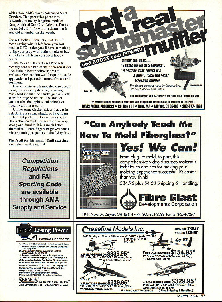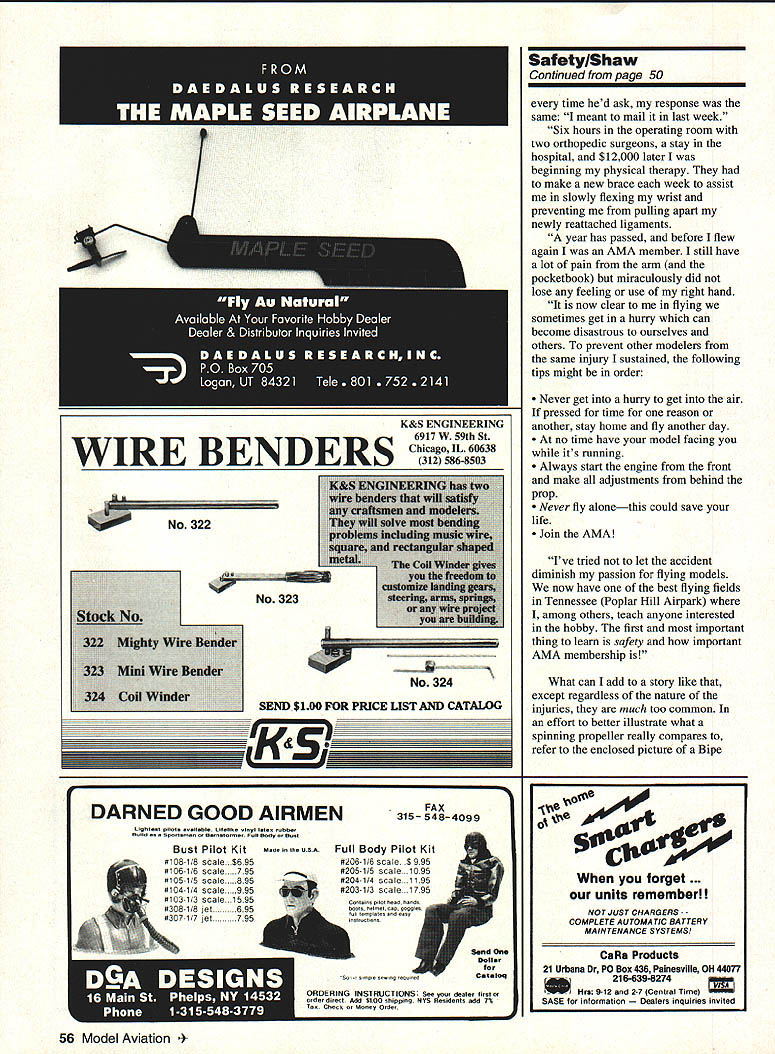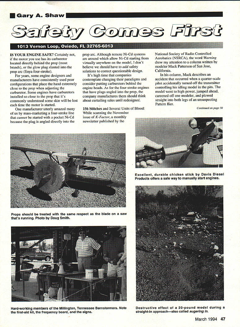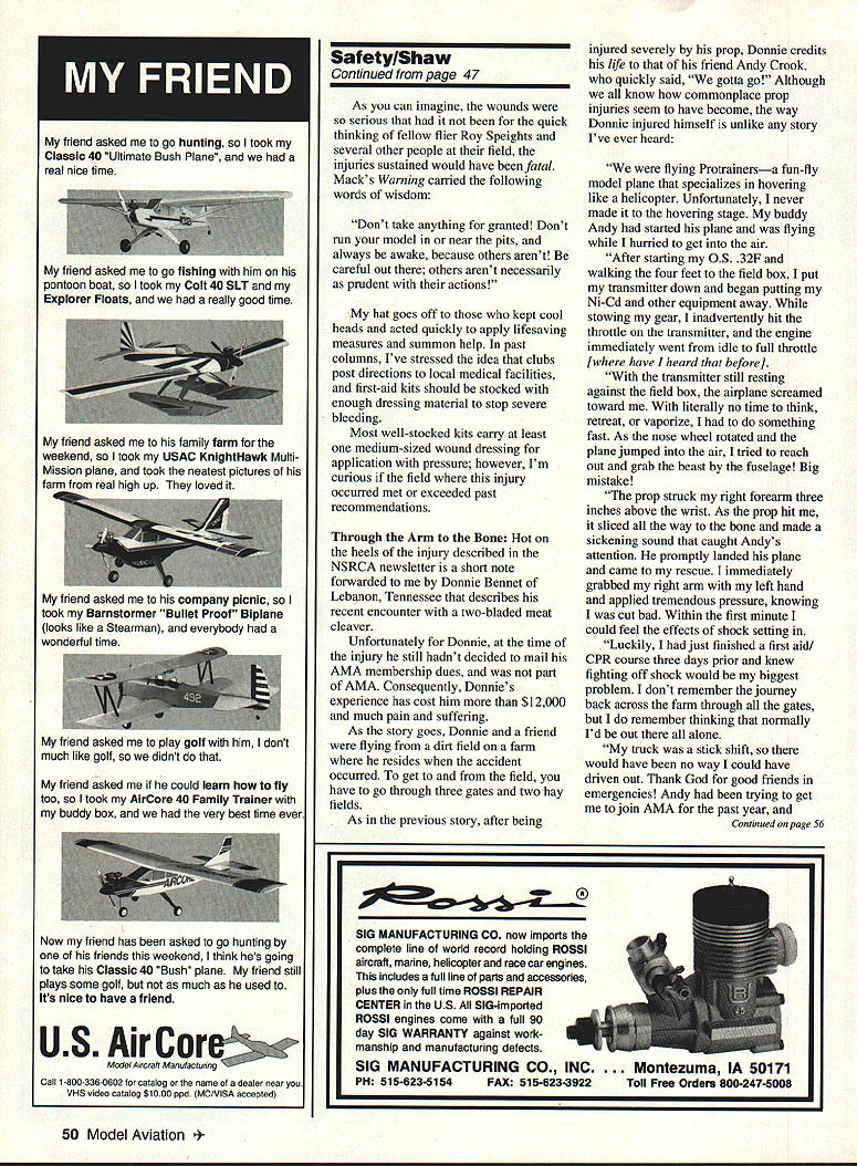 Gary Shaw IS YOUR ENGINE SAFE Certainly motor use has its carburetor located directly behind prop brands glow plug slanted prop arc Enya four-stroke years some engine designers manufacturers have consistently used poor configurations place hand extremely close prop adjusting carburetor Some engines have carburetors installed close prop its commonly understood some skin will lost time motor started manufacturer utterly amazed us mass-marketing four-stroke line cannot started pocket Ni-Cd because plug angled directly prop arc Although remote Ni-Cd systems around allow Ni-Cd starting virtually anywhere model dont believe should have add safety solutions correct questionable design Its high time companies contemplate changing paradigms consider putting carburetors behind engine heads As four-stroke engines have plugs angled prop company manufactures should think about curtailing sales until redesigned 156 Stitches Several Units Blood scanning November issue K-Factor monthly newsletter published National Society Radio Controlled Aerobatics NSRCA word Warning drew attention column written modeler Mack Patterson San Jose California column Mack describes accident occurred quarter-scale pilot accidentally turned off transmitter controlling idling model pits model went high power jumped ahead careened off modeler plowed straight both legs unsuspecting Pattern flier Continued page 50 March 1994 47 Excellent durable chicken stick Davis Diesel Products offers safe way manually start engines Props should treated same respect blade saw thats running Photo Doug Smith Hard-working members Millington Tennessee Barnstormers Note first-aid kit frequency board signs Destructive effect 20-pound model during straight-in approachalso called augering friend asked go hunting took Classic 40 Ultimate Bush Plane real nice time friend asked go fishing him pontoon boat took Colt 40 SIT Explorer Floats really good time friend asked family farm weekend took USAC KnightHawk MultiMission plane took neatest pictures farm frnm real high up loved friend asked company picnic took Barnstormer Bullet Proof Biplane looks like Stearman everybody wonderful time friend asked play golf him dont much like golf didnt friend asked could learn fly too took AirCore 40 Family Trainer buddy box very best time ever Now friend has asked go hunting friends weekend think hes going take Classic 40 Bush plane friend still plays some golf much used its nice have friend Model Aircraft Manufacturing call 1 -800-336-0602 catalog name dealer near VHS video catalog $1000 ppd MO/VISA accepted SafetylShaw Continued page 47 As can imagine wounds serious quick thinking fellow flier Roy Speights several other people field injuries sustained would have fatal Macks Warning carried following words wisdom Dont take anything granted Dont run model near pits always awake because others arent careful out others arent necessarily prudent actions hat goes off kept cool heads acted quickly apply lifesaving measures summon help past columns Ive stressed idea clubs post directions local medical facilities first-aid kits should stocked enough dressing material stop severe bleeding Most well-stocked kits carry least medium-sized wound dressing application pressure however Im curious field injury occurred met exceeded past recommendations Through Arm Bone Hot heels injury described NSRCA newsletter short note forwarded Donnie Bennet Lebanon Tennessee describes recent encounter two-bladed meat cleaver Unfortunately Donnie time injury still hadnt decided mail AMA membership dues part AMA Consequently Donnies experience has cost him $12000 much pain suffering As story goes Donnie friend flying dirt field farm resides accident occurred get field have go through three gates two hay fields As previous story after being injured severely prop Donnie credits lfe friend Andy Crook quickly said gotta go Although know commonplace prop injuries seem have become way Donnie injured himself unlike story Ive ever heard flying Protrainersa fun-fly model plane specializes hovering like helicopter Unfortunately never made itto hovering stage buddy Andy started plane flying hurried get air After starting OS 32F walking four feet field box put transmitter down began putting Ni-Cd other equipment away stowing gear inadvertently hit throttle transmitter engine immediately went idle full throttle [where have heard before] transmitter still resting against field box airplane screamed toward literally no time think retreat vaporize something fast As nose wheel rotated plane jumped air tried reach out grab beast fuselage Big mistake prop struck right forearm three inches above wrist As prop hit sliced way bone made sickening sound caught Andys attention promptly landed plane came rescue immediately grabbed right arm left hand applied tremendous pressure knowing cut bad Within first minute could feel effects shock setting Luckily just finished first aidl CPR course three days prior knew fighting off shock would biggest problem dont remember journey back across farm through gates remember thinking normally Id out alone truck stick shift would have no way could have driven out Thank God good friends emergencies Andy trying get join AMA past year Continued page S6 50 Model Aviation MANUFACTURING CO now imports complete line world record holding ROSSI aircraft marine helicopter race car engines includes full line parts accessories plus full time ROSSI REPAIR CENTER US 910-imported ROSSI engines come full 90 day SIG WARRANTY against work manship manufacturing defects SIG MANUFACTURING CO INC PH 515-623-5154FAX 515-623-3922 . Montezuma IA 50171 Toll Free Orders 800-247-5008 Sat etylShaw Continued page 50 time hed ask response same meant mail last week Six hours operating room two orthopedic surgeons stay hospital $12000 later beginning physical therapy make new brace week assist slowly flexing wrist preventing pulling apart newly reattached ligaments year has passed before flew again AMA member still hav