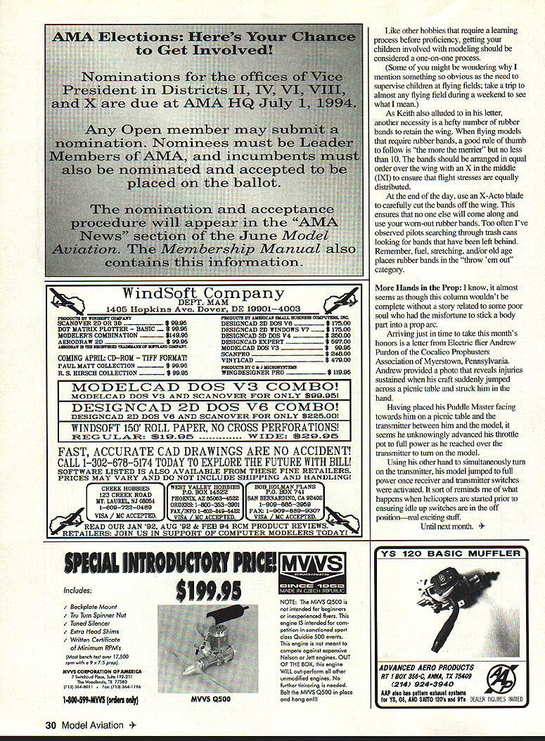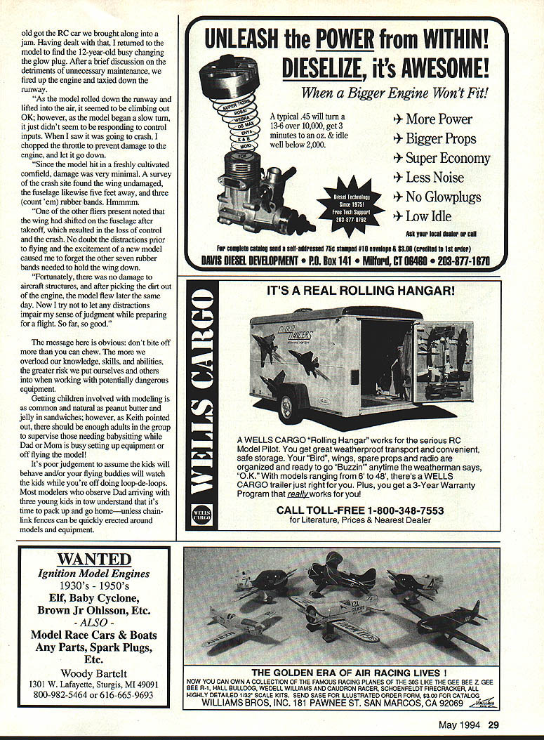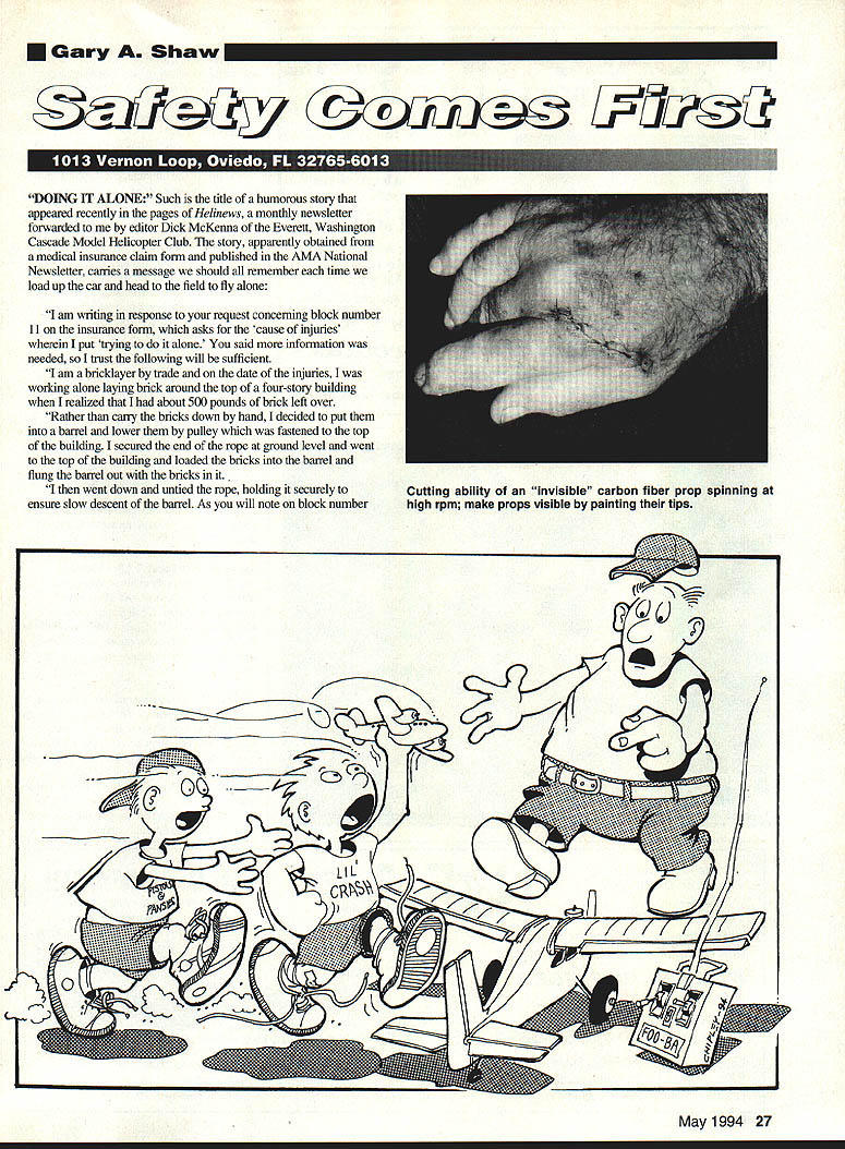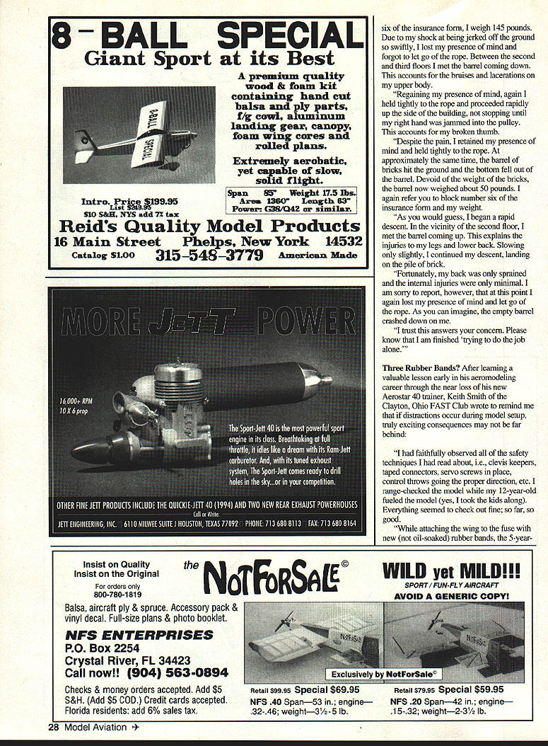 U Gary Shaw ... DOING IT ALONE Such title humorous story appeared recently pages Helinews monthly newsletter forwarded editor Dick McKenna Everett Washington Cascade Model Helicopter Club story apparently obtained medical insurance claim form published AMA National Newsletter carries message should remember time load up car head field fly alone am writing response request concerning block number 11 insurance form asks cause injuries wherein put trying alone said information needed soT trust following will sufficient am bricklayer trade date injuries working alone laying brick around top four-story building realized about 500 pounds brick left over Rather carry bricks down hand decided put barrel lower pulley fastened top building secured end rope ground level went top building loaded bricks barrel flung barrel out bricks it. went down untied rope holding securely ensure slow descent barrel As will note block number May 1994 27 Cutting ability invisible carbon fiber prop spinning high rpm make props visible painting tips six insurance form weigh 145 pounds Due shock being jerked off ground swiftly lost presence mind forgot let go rope Between second third floors met barrel coming down accounts bruises lacerations upper body Regaining presence mind again held tightly rope proceeded rapidly up side building stopping until right hand jammed pulley accounts broken thumb Despite pain retained presence mind held tightly rope approximately same time barrel bricks hit ground bottom fell out barrel Devoid weight bricks barrel now weighed about 50 pounds again refer block number six insurance form weight As would guess began rapid descent vicinity second floor met barrel coming up explains injuries legs lower back Slowing slightly continued descent landing pile brick Fortunately back sprained internal injuries minimal am sorry report however point again lost presence mind let go rope As can imagine empty barrel crashed down trust answers concern Please know am finished trying job alone Three Rubber Bands After learning valuable lesson early aeromodeling career through near loss new Aerostar 44 trainer Keith Smith Clayton Ohio FAST Club wrote remind distractions occur during model setup truly exciting consequences may far behind faithfully observed safety techniques read about ie clevis keepers taped counectors servo screws place control throws going proper direction etc range-checked model 12-year-old fueled model yes took kids along Everything seemed check out fine far good attaching wing fuse new oil-soaked rubber bands 5-year28 Model Aviation LL SPECIAL Giant Sport its Best premium quality wood & foam kit containing hand cut balsa ply Varts f cowL aluminum landing gear canopy foam wing cores roiled plans Extremely asrobatic yetof slow Span 55 Weight 175 1bs Intro Prive 19995Area 1360 Length 63 ListPower G3&142 similar 310 S&H NYS add 7 tax Reids Quality Model Products 16 Main Street Phelps New York 14532 Catalog 51003155483779 American Made NOTERSALE Insist Quality Insist Original orders 800-780-1819 Balsa aircraft ply & spruce Accessory pack & vinyl decal Full-size plans & photo booklet NFS ENTERPRISES PO Box 2254 Crystal River FL 34423 Call now! 904 563-0894 Checks & money orders accepted Add $5 S&H Add $5 COD Credit cards accepted Florida residents add 6% sales tax WILD yet MILD! SPORT FUN-FLYAIRCRAFT xGIusIv Retail $9995 peciai $6995 NFS 40 Span53 engine 32-46 weight3Y2-5 lb rufue Retail $7995 peciai NFS 20 Span42 engine 15-32 weight2-3/2 lb old got RC car brought along jam Having dealt returned model find 12-year-old busy changing glow plug After brief discussion detriments unnecessaiy maintenance fired up engine taxied down runway As model rolled down runway lifted air seemed climbing out OK however model began slow turn just didnt seem responding control inputs saw going crash chopped throttle prevent damage engine let go down Since model hit freshly cultivated cornfield damage very minimal survey crash site found wing undamaged fuselage likewise five feet away three count em rubber bands Hmmmm other fliers present noted wing shifted fuselage after takeoff resulted loss control crash No doubt distractions prior flying excitement new model caused forget other seven rubber bands needed hold wing down Fortunately no damage aircraft structures after picking dirt out engine model flew later same day Now try let distractions impair sense judgment preparing flight So far good message obvious dont bite off can chew overload knowledge skills abilities greater risk put ourselves others working potentially dangerous equipment Getting children involved modeling common natural peanut butter jelly sandwiches however Keith pointed out should enough adults group supervise needing babysitting Dad Mom busy setting up equipment off flying model Its poor judgement assume kids will behave and/or flying buddies will watch kids youre off doing loop-de-loops Most modelers observe Dad amving three young kids tow understand its time pack up go homeunless chainlink fences can quickly erected around models equipment May1994 29 typicai 45 will turn over 10000 get 3 minutes oz & idle well below 2000 UNLEASH POWER WITHIN ELIZE its AWESOME Bigger Engine Wont Fit r er Props r Economy Noise lowplugs Idle Ask kN ism mci far emplata catiag situ siaNremi 7k atampi #10 mnvhlmpm SLID crsiIt ta lit miar h EVE MESEL DEVHIPMEE ox 141 d CT 06461 Rhl-hDhI REAL ROLLING HANGAR i WELLS CARGO Rolling Hangar works serious RC Model Pilot get great weatherproof transport convenient safe storage Bird wings spare props radio organized ready go Buzzin anytime weatherman says OK models ranging 6 48 theres WELLS CARGO trailer just right Plus get 3-Year Warranty Program really works CALL TOLL-FREE 1-800-348-7553 Literature Prices & Nearest Dealer WANTED Ignition Model Engines 1930s 1950s Elf Baby Cyclone Brown Jr Ohlsson Etc -ALSO Model Race Cars & Boats Any Parts Spark Plugs Etc Woody Bartelt 1301 W Lafayette Sturgis MI 49091 800-982-5464 616-