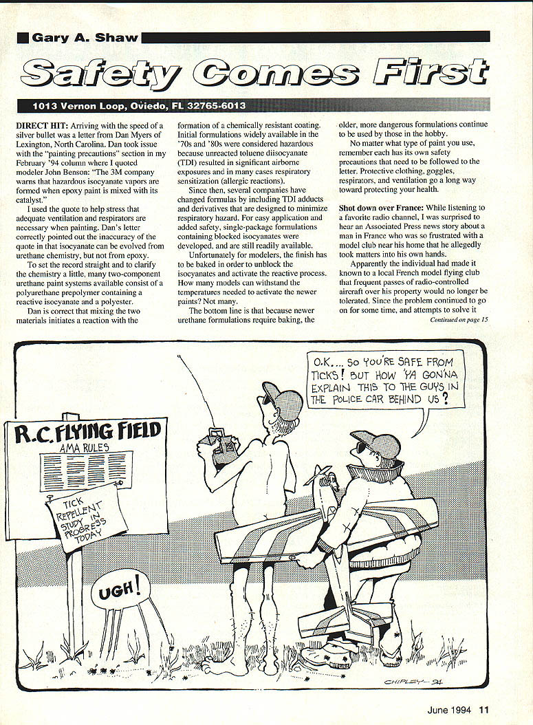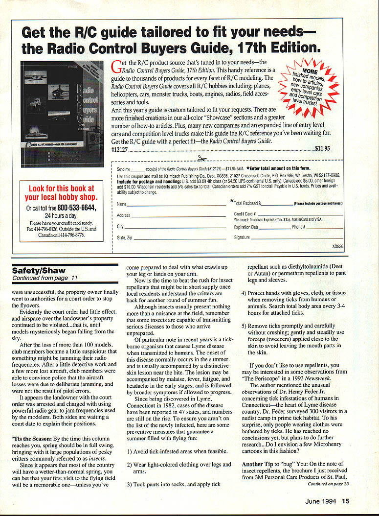 U Gary Shaw DIRECT HIT Arriving speed silver bullet letter Dan Myers Lexington North Carolina Dan took issue painting precautions section Februaiy 94 column quoted modeler John Benson 3M company warns hazardous isocyanate vapors formed epoxy paint mixed its catalyst used quote help stress adequate ventilation respirators necessary painting Dans letter correctly pointed out inaccuracy quote isocyanate can evolved urethane chemistry epoxy set record straight clarify chemistry little two-component urethane paint systems available consist polyurethane prepolymer containing reactive isocyanate polyester Dan correct mixing two materials initiates reaction formation chemically resistant coating Initial formulations widely available 70s SOs considered hazardous because unreacted toluene diisocyanate TDI resulted significant airborne exposures cases respiratory sensitization allergic reactions Since several companies have changed formulas including TDI adducts derivatives designed minimize respiratory hazard easy application added safety single-package formulations containing blocked isocyanates developed still readily available Unfortunately modelers finish has baked order unblock isocyanates activate reactive process models can withstand temperatures needed activate newer paints bottom line because newer urethane formulations require baking older dangerous formulations continue used hobby No matter what type paint use remember has its own safety precautions need followed letter Protective clothing goggles respirators ventilation go long way toward protecting health Shot down over France listening favorite radio channel surprised hear Associated Press news story about man France frustrated model club near home allegedly took matters own hands Apparently individual made known local French model flying club frequent passes radio-controlled aircraft over property would no longer tolerated Since problem continued go some time attempts solve Continued page 15 F4PLTh TH\ TO THE GU5 IK ___AMA_RULE 5 June1994 11 Get RIC guide tailored fit needs Radio Control Buyers Guide 17th Edition et R/C product source thats tuned needsthe Radio Control Buyers Guide 17th Edition handy reference f guide thousands products facet R/C modeling hd model5 Radio Control Buyers Guide covers R/C hobbies including planes flSwc~CiGS helicopters cars monster trucks boats engines radios field acces sories tools years guide custom tailored fit requests finished creations all-color Showcase sections greater number how-to articles Plus new companies expanded line entry level cars competition level trucks make guide R/C reference youve waiting Get R/C guide perfect fitthe Radio Control Buyers Guide #12127$1195 [v32][b-1-10-1-10]] Name __________________________________________ Send _______ copys 01 tOe Radio Control Buyers Go/Se #12127$1 195 *Entsr total amount form Use rhis coupon mail Kaimbach Poblishing Co Dept XD836 21027 Crnssroads Circle PO Boo 986 Waukesha WI 53187-0986 Include postage handling US add $300 4th class nr $450 UPS continental US Canada add $500 other foreige add $1000 Wisconsin residents add 5% sales tan total Canadian orders add 7% GSI total Payable US toads Prices avail ahility subject change ________________________________________________ *Total Enclosed $________________ Please Include pestageand tales City State Zip Credit Card # accept American Express mix $151 Masrercard VISA topiration Date_________________ Phone # ___________________ Signature XD836 Safety/Shaw Continued page 11 unsuccessful property owner finally went authorities court order stop flyovers Evidently court order little effect airspace over landowners property continued violated. until models mysteriously began falling sky After loss 100 models club members became little suspicious something might jamming radio frequencies After little detective work few lost aircraft club members able convince police aircraft losses due deliberate jamming result pilot errors appears landowner court order arrested charged using powerful radio gear jam frequencies used modelers Both sides waiting court date explain positions Tis Season time column reaches spring should full swing bringing large populations pesky critters commonly referred insects Since appears country will have wetter-than-normal spring can bet first visit flying field will memorable oneunless youve come prepared deal what crawls up leg lands arm Now time beat rush insect repellents might short supply once local residents understand critters back another round summer fun Although insects usually present nothing nuisance field remember some insects capable transmitting serious diseases arrive unprepared particular note recent years tickborne organism causes Lyme disease transmitted humans onset disease normally occurs summer usually accompanied distinctive skin lesion near bite lesion may accompanied malaise fever fatigue headache early stages followed broader symptoms allowed progress Since being discovered Lyme Connecticut 1982 cases disease have reported 47 states numbers still rise ensure aren t list newly infected some preventive measures guarantee summer filled flying fun 1 Avoid tick-infested areas feasible 2 Wear light-colored clothing over legs arms 3 Tuck pants socks apply tick repellant such diethyltoluamide Deet Autan permethrin repellents pant legs sleeves 4 Protect hands gloves cloth tissue removing ticks humans animals Search total body area 3-4 hours attached ticks 5 Remove ticks promptly carefully crushing gently steadily use forceps tweezers applied close skin avoid leaving mouth parts skin dont like use repellents may interested some observations Periscope 1993 Newsweek author mentioned unusual observations Dr Henry Feder Jr concerning tick infestations humans Connecticutthe heart Lyme disease country Dr Feder surveyed 300 visitors nudist camp prime tick habitat surprise people wearing clothes bothered ticks has reached no conclusions yet plans further research .Do envisi