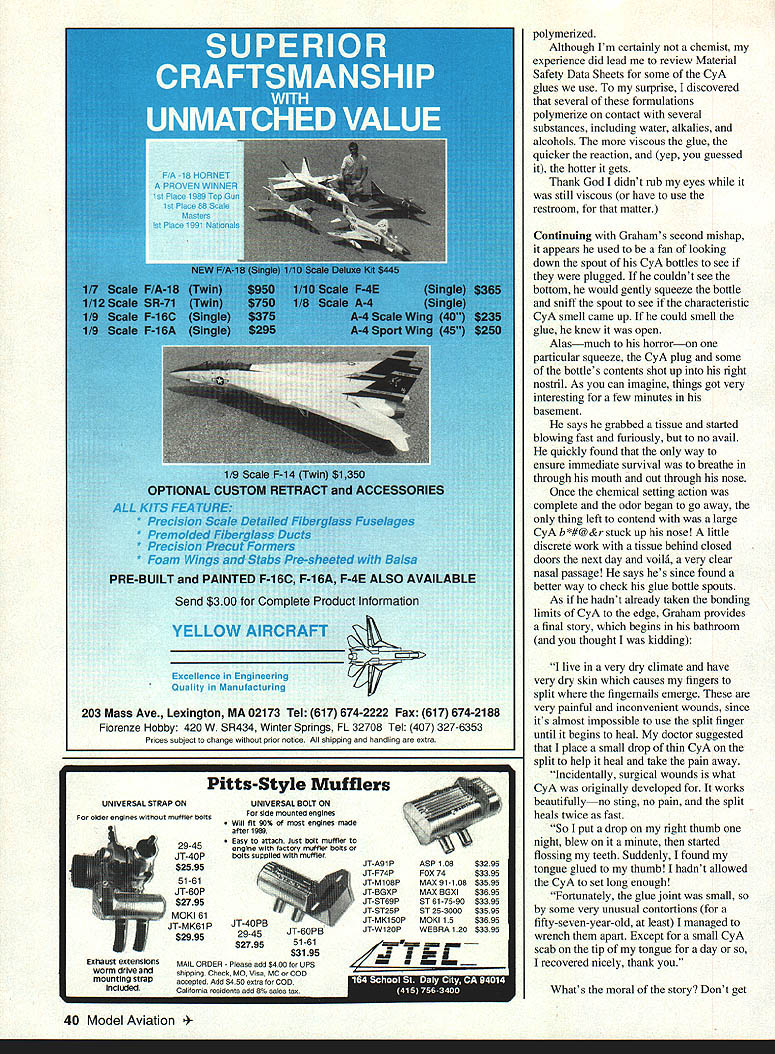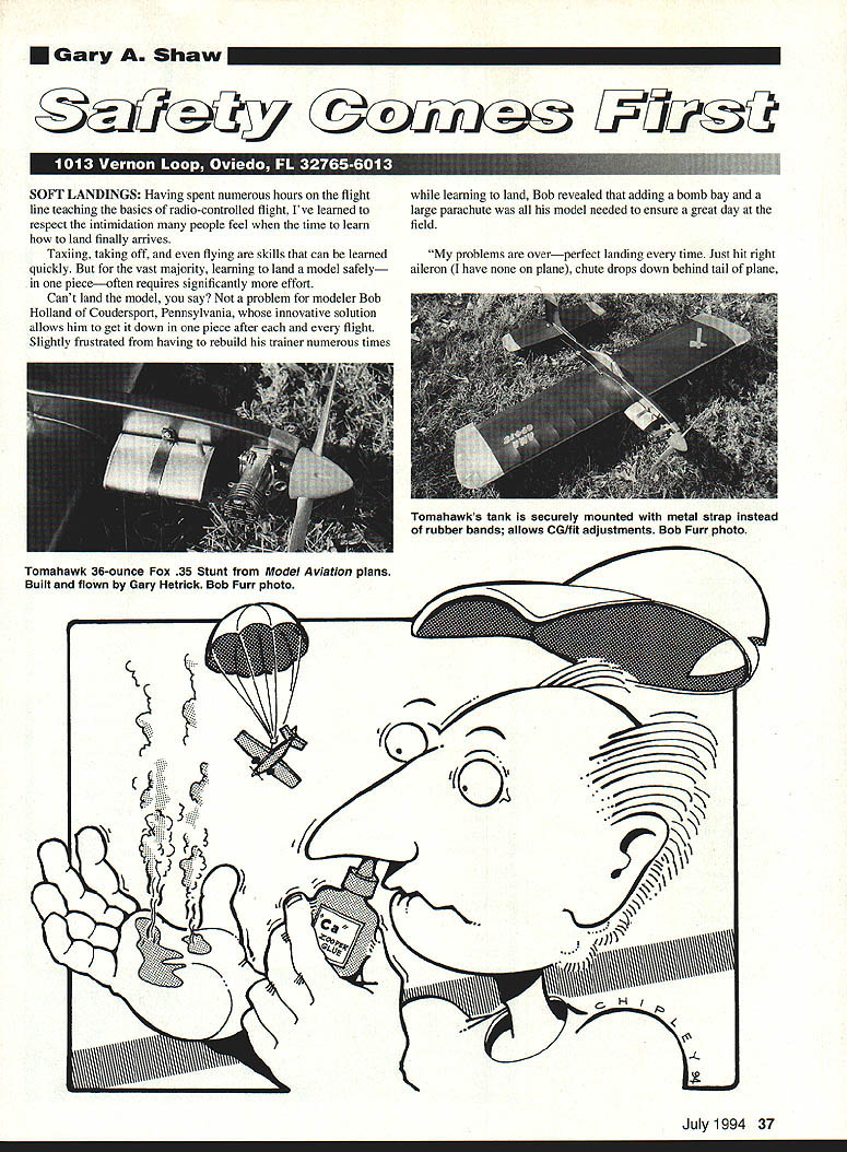 U Gary Shaw LZ ru - FT LANDINGS Having spent numerous hours flight line teaching basics radio-controlled flight Ive learned respect intimidation people feel time learn land finally arrives Taxiing taking off flying skills can learned quickly vast majority learning land model safely pieceoften requires significantly effort Cant land model say problem modeler Bob Holland Coudersport Pennsylvania innovative solution allows him get down piece after flight Slightly frustrated having rebuild trainer numerous times learning land Bob revealed adding bomb bay large parachute model needed ensure great day field problems overperfect landing time Just hit right aileron have plane chute drops down behind tail plane ~0 0 July1994 37 Tomahawk 36-ounce Fox 35 Stu*it Model Aviation plans Built flown Gary Hetrick Bob Furr photo Tomahawks tank securely mounted metal strap instead rubber bands allows CGIfit adjustments Bob Furr photo plane stops does vertical descent Since repacking chute takes about five minutes Im back air no time Bob hasnt told hes learned land conventional way yet Im sure hell master have neat trick show audience during future fun-fly think parachute may ticket master dreaded element landingforget Seek help club members have time capability buddy-box model until become proficient Learning fly model proficiently through phases will save possibly fly headaches future Sticky Situation increased use CyA days should come no surprise CyA-related accidents occur often would like admit afraid share experiences CyA Graham Hicks La Grande Oregon thought might learn lesson very least enjoy what appears some humorous situations repairing delicate wood carving brought back trip Zimbabwe cracked transit appeared few drops CyA just right spots would make good new squeezed little CyA cracks held carving angle allow glue run break During procedure small drop fell finger glue carving didnt set immediately grabbed kicker hit quick spray Instantly finger heated up like branding iron smoke poured off tip dropped carving floor grabbed jug water stuck finger it too lateI cooked medium-well blister raised over next few days taught hard lesson using accelerators havent experienced sensation its about pleasant touching hot end kettle iron anything thats hot time figure out what youve done its too late Sounds like Ive learned experience bet unknowingly smeared thin CyA over right hand applying several rib sections Ultra Sport 60 via plastic glue extension pushed onto end spout time tilted bottle horizontal vertical extra glue ran down spout onto palm help bond ribs quickly applying accelerator rib section right after applying CyA As soon placed hand section waxed paper residual accelerator felt hot sensation heard sound similar fresh bacon being thrown griddle Yeouuuu go what White mist hissed palm few seconds glue quickly FUEL ONE 4 GAL 24 GAL 60 GAL 126 GAL 54 GAL TOTAL RED MIXTURE GAL PERGAkPERGAPERGAL DRUM $AMT RED MAX PREMIUM FUEL Easy beginners powerful experts Available synthetic Castor blends RED MAX 01035776755693621 16677 RED MAX 51143857834766686 21343 _____ RED MAX 101278958933856767 27175 ____ RED MAX 121332999972892799 29507 _____ RED MAX 15138610391012929832 31840 ____ RED MAX RACING FUEL Trophy winners planes boats cars loads documented records RED MAX 201574118111491055945 37486 _____ RED MAX 2517101282124811461026 42972 _____ RED MAX 3018441383134612361107 48430 ____ RED MAX 4021151586154414171269 59375 ____ RED MAX 5024391829178116341464 72513 _____ RED MAX 6027092032197818151626 83448 ____ RED MAX 6528442133207619061707 88915 ____ RED MAX 4-CYCLE FUEL Eliminates detonation & kickback 4-cy engines specially good older models 10-4 CYCLE1321 990 964 885 792 27201 _____ 15-4 CYCLE 1456 1092 1063 975 873 32669 _____ RED MAX HELICOPTER FUEL Extremely smooth & cool running extra defoamer & special oil helicopters 10 HELICOPTER13591019992911816 28773 _____ 15 HELICOPTER1494112110911001897 34240 25 HELICOPTER18021351131512071081 46694 ____ 30 HELICOPTER19381454141512991163 52214 _____ RED MAX DUCTED FAN FUEL Nigh flash point special oil use tuned pipes ducled fan other heavy duty applicalions 5 FAN1224918894820735 23305 _____ 10 FAN13591019992911816 28773 _____ 15 FAN1494112110911001897 34240 _____ RED MAX PATTERN FUEL Proven best fuel pattern engines using pumps tuned pipes 5 PATTERN1175881858787705 23328 _____ 10 PATTERN 1323993966887794 29342 ____ 15 PATTERN 147211041074986883 35357 _____ SUPER TIGER 3000 FUEL aest fuel Super Tiger 2000 4000 engInes ST 3000 1278 958 933 856 767 27175 _____ RED MAX DIESEL FUEL Superior diesel back list popular demand customers GAL 2213 1660 1615 1482 1328 55234 _____ OTS 1473 1105 1075 987 884 ______ CUSTOM BLENDED FUEL INGREDIENTSGrand will mix custom fuel formula special engine Total minimum gallon Fuel ingredients available minimum quantities gallon Call prices items Also special 2cycle oil big engines such SAX etc Cleaner cooler running oil other market PRICES MAY CHANGE WITHOUT NOTICE. Power easy starting power smooth take offs power intricate maneuvers Red Max makes engine come alive power performance never expected can have power Its phone call away Power today next week next year Red Maxs secret ingredients keep engine lasting longer running powerfully other 100% money back guarantee completely satisfied reason Red Max has power better idle better wear characteristics other fuel 38 Model Aviation MAX FUEL Order Form CALL OR USE THIS HANDY ORDER FORM TO SPEED YOUR ORDER FILL IN QTY ON THE LEFT THE TOTAL ON RIGHT Freight free qts gals No handling charge Freight collect drums deduct 3% prepay Mix qty Total qty determines price SC orders add 5% sales tax Dealer club prices avail Accept credit cards checks COD COD add $450 per cartonl UPS shipments add $700 per carton hazardous materials fee No hazard fee orders 24 gals shipped motorfreight EASE PRINT ISTREET STATE/ZIP -- TYPE AND NO -XPIRATION DATE Excellence Engineering Ouality Manufacturing 203 Mass Ave Lexingt