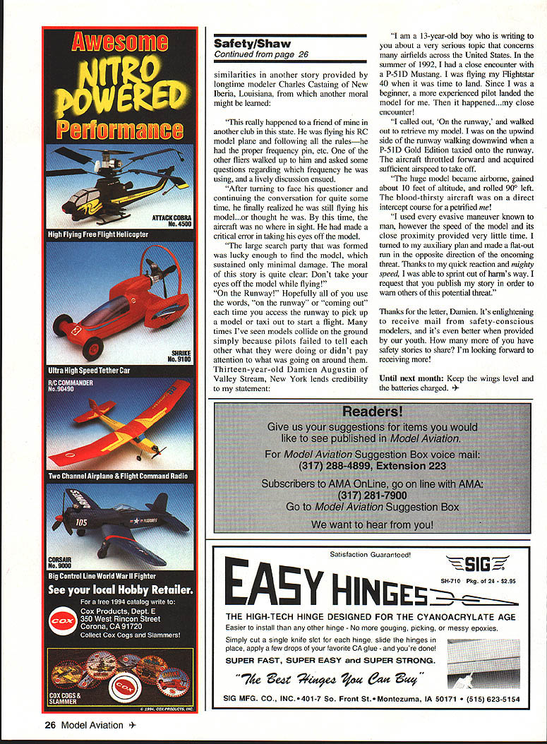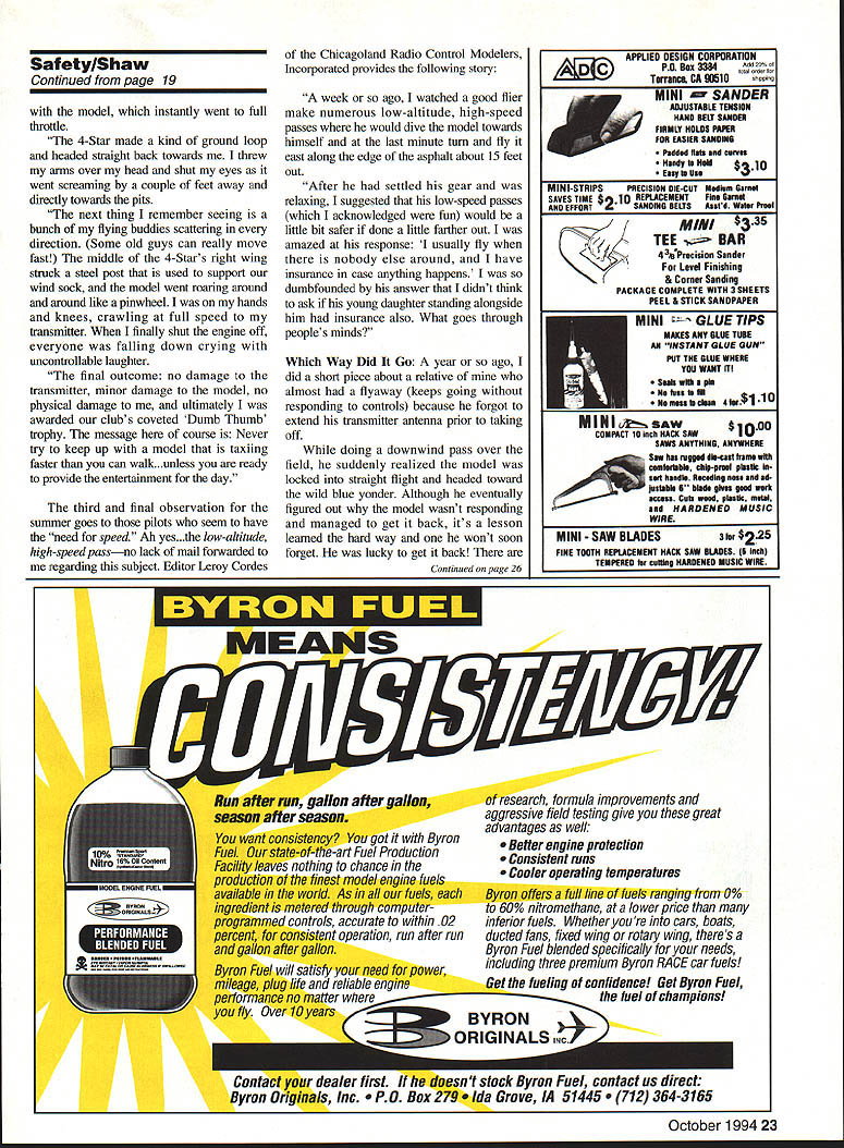 U Gary Shaw WHILE VISITING several flying fields during summer became increasingly aware really dangerous things giving second thought Leading pack neck woods pilots run engines full speed kneeling sitting front models Although few newcomers sport may unaware danger vast majority us veterans just plain know better visiting local flying field noted experienced modeler sitting front idling 40-sized model legs crossed hands transmitter no holding model holding watching model busy setting up computer radio prior taxiing out fly would someone obvious experience place himself such jeopardy Ignorance complacencyyou judge Another common mistake taxiing model pit area right up flight boxes lawn chairs Although some occasions observed pilots being politely reminded motors should shut off before being aimed pits reminders exception rather norm What would happen model couldnt slow down radio glitched model went out control Could move fast enough get out way emphasize point let share story forwarded modeler Roger Caron San Jose California engines running cleanly club field fly has long taxi strip afraid engine Sig 4-Star 40 would quit halfway out runway set idle couple clicks fast Almost immediately realized model taxiing faster could walk began trotting beside model picked up speed did right folks should have shut down time running about full tilt tried reach down grab tail should never attempted old fat guy Somehow legs couldnt keep up rest went sprawling head-first down taxiway transmitter went skidding out hand almost catching up cold humid morning ourContinued page 23 -1-c7PL 94 M October 1994 19 SafetylShaw Continued page 19 model instantly went full throttle 4-Star made kind ground loop headed straight back towards threw arms over head shut eyes went screaming couple feet away directly towards pits next thing remember seeing bunch flying buddies scattering direction Some old guys can really move fast middle 4-Stars right wing struck steel post used support wind sock model went roaring around around like pinwheel hands knees crawling full speed transmitter finally shut engine off everyone falling down crying uncontrollable laughter final outcome no damage transmitter minor damage model no physical damage ultimately awarded clubs coveted Dumb Thumb trophy message course Never try keep up model taxiing faster can walk.unless ready provide entertainment day third final observation summer goes pilots seem have need speed Ah yes.the low-altitude hi gh-speed passno lack mail forwarded regarding subject Editor Leroy Cordes Chicagoland Radio Control Modelers Incorporated provides following story week ago watched good flier make numerous low-altitude high-speed passes would dive model towards himself last minute turn fly east along edge asphalt about 15 feet out After settled gear relaxing suggested low-speed passes acknowledged fun would little bit safer done little farther out amazed response usually fly nobody else around have insurance case anything happens dumbfounded answer didnt think ask young daughter standing alongside him insurance also What goes through peoples minds Which Way Did Go year ago did short piece about relative almost flyaway keeps going responding controls because forgot extend transmitter antenna prior taking off doing downwind pass over field suddenly realized model locked straight flight headed toward wild blue yonder Although eventually figured out model wasnt responding managed get back its lesson learned hard way wont soon forget lucky get back Continued page 26 APPLIED DESIGN CORPORATION p iiiXAdd 20 total ordor Twranca CA 00510 soppog MINI ER ADJUSTABLE TENSION HAND BELT SANDER FEUD HOLDS PAPER FOR EASIER SANDING Padded tints cmv. Handy Ia H Easyte use $310 MINI-STRIPS PIIECISION DIE-CUT Medium Savant SAVES TIME $210 REPLACEMENT Flue Garnet AND EFFORTSANDING BELTSAaatd Water Prant MINI $335 // TEE N43MPrecision Sander Level Finishing & Corn Sanding PACKAGE COMPLETE WITH 3 SHEETS PEEL & STICK SANDPAPER MINI ~~GLUETIPS MAKES ANY GLUE TUBE INSTANT GLUE GUN PUT THE GLUE WHERE YOU WANT ITt Seals pin Na tess teE Nnmeastncline 4ter$110 SAW COMPACT 10 inch HACK SAW SAWS ANYTHING ANYWNERE Saw hat mqnd die-cast tram chip-preet plastic hi sevun Receding nese ad jestabeva blade gives pad weik access Cute weed plastic metal ned HARDENED MUSIC WIRE MINI SAW BLADES 31 $225 FINE TOOTH REPLACEMENT HACK SAW BLADES S Inch TEMPERED tei catting HARDENED MUSIC WIRE j Ii L uj SE MEANS Ru after nnv gallon after gallee D after season research formula improvements aggressive field testing give great advantages well Better engine protection Consistent runs Cooler operating temperatures want consistency got Byron Fuel state-of-the-art Fuel Production Facility leaves nothing chance pmduction finest model engine fuels available world As fuels eachByron offers full line fuels ranging 0% ingredient metered thmugh computer-to 60% nitromethane lower price pmgrammexl controls accurate within 02inferior fuels Whether youre cars boats percent consistent operation run after runducted fans fixed wing rotary wing theres gallon after gallonByron Fuel blended specifically needs Byron Fuel wifi satisfy need powerincluding three premium Byron RACE car fuels mileage plug life reliable engineGet fueling confidence Get Byron Fuel performance no matter champions Contact dealer first doesnt stock Byron Fuel contact us direct Byron Originals Inc ox 279 Grove IA 51445 364-3165 October 1994 23 BrnoNLs* SafetylShaw Continued page 26 similarities another story provided longtime modeler Charles Castaing New Iberia Louisiana another moral might learned really happened friend another club state flying RC model plane following ruleshe proper frequency pin etc other fliers walked up him asked some questions regarding frequency using lively discussion ensued After turning face questioner continuing conversation quite some time finally realized still flying model.or thought time aircraft no sight made critical error taking eyes of