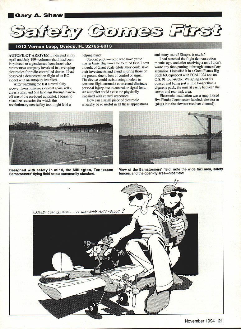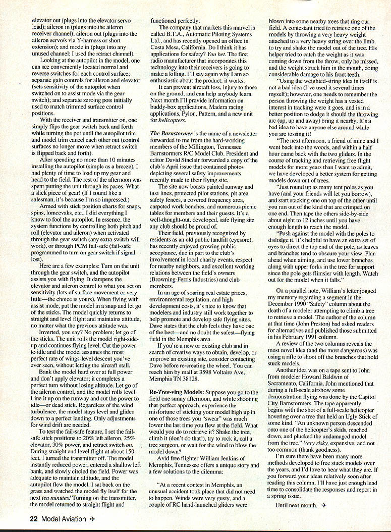 U Gary Shaw AUTOPILOT ARRIVES indicated April July 1994 columns introduced gentheman fromIsrael represents company involved developing electronics radio-controlled drones observed demonstration flight RC model autopilot installed After watching test aircraft fully recover numerous violent spins rolls dives stalls bad landings through handsoff use on-hoard autopilot began visualize scenarios revolutionary new safety tool might lend helping hand Student pilotsthose have yet master basic flightcame mind first next thought Giant Scale pilots could save investments avoid injuring ground due loss control signal device could assist racing models constant flight around course eliminate personal injury due control signal loss An autopilot could assist physically impaired control responses can small piece electronic wizardry useful applications Simple works watched flight demonstration months ago after receiving unit didnt waste time putting through some scenarios installed Great Planes Big Stick 60 equipped PCM 1024 OS 91 four-stroke Weighing about six ounces being just little longer cigarette pack unit fit easily between servos rear tank area Electronic installation snap used five Futaba J connectors labeled elevator plugs elevator receiver channel November 1994 21 Designed safety mind Millington Tennessee View Barnstormers field note wide taxi area safety Barnstormers flying field sets community standard fences open-fly areanice field 7 CJOULD BELIEVE. WORXIJ\IG CJrc-PILOT elevator out plugs elevator servo lead aileron plugs aileron receiver channel aileron out plugs aileron servo/s via Y-harness short extension mode plugs unused channel used retract channel Looking autopilot model can see conveniently located normal reverse switches control surface separate gain controls aileron elevator sets sensitivity autopilot switched assist mode via gear switch separate zeroing pots initially used match trimmed surface control positions receiver transmitter simply flips gear switch back forth turning pot until autopilot trim model trim cancel other out control surfaces no longer move retract switch flipped back forth After spending no 10 minutes installing autopilot simple breeze plenty time load up gear head field rest afternoon spent putting unit through its paces What slick piece gear sound like salesman its because Im impressed Armed stick position charts snaps spins lomcevaks etc did everything know fool autopilot essence system functions controlling both pitch roll elevator aileron activated through gear switch extra switch will work through PCM fail-safe fail-safe programmed turn gear switch signal lost few examples Turn unit through gear switch autopilot assists flying dampens elevator aileron control what set sensitivity lots surface movement very littlethe choice yours flying assist mode put model snap let go sticks model quickly returns straight level flight maintains attitude no matter what previous attitude Inverted say No problem let go sticks unit rolls model right-sideup continues flying level Cut power idle model assumes perfect rate wings-level descent youve ever seen letting aircraft stall Bank model hard over full power dont apply elevator completes perfect turn losing altitude Let go aileron control model rolls level Line up runway cut power idleor dead stick Regardless wind turbulence model stays level glides down perfect landing Only adjustments wind drift needed test fail-safe feature set fail safe stick positions 20% left aileron 25% elevator 30% power retract switch During straight level flight about 150 feet turned transmitter off model instantly reduced power entered shallow left bank slowly circled field Power adequate maintain altitude autopilot flew model sat back grass watched model fly itself next ten minutes Turning transmitter model returned straight flight functioned perfectly company markets marvel called BTA Automatic Piloting Systems Ltd has recently opened office Costa Mesa California think has applications safety bet first radio manufacturer incorporates technology receivers going make killing Ill say again am enthusiastic about product works can prevent aircraft loss injury ground can help anybody leam Next month Ill provide information buddy-box applications Madera racing applications Pylon Pattern new unit helicopters Barnstormer name newsletter forwarded hard-working members Millington Tennessee Barnstormers RIC Model Club President editor David Sinclair forwarded copy clubs April issue contained photos depicting several safety improvements recently made flying site site now boasts painted runway taxi lines protected pilot stations pit area safety fences covered frequency area carpeted work benches numerous picnic tables members guests Its well-thought-out developed safe flying site club should proud field previously recognized residents old public landfill eyesore has recently enjoyed growing public acceptance due part clubs involvement local charity events respect nearby neighbors excellent working relations between fields owners Browning-Ferris Industries club members age soaring real estate prices environmental regulation high development costs its nice know modelers industry still work together help promote develop safe flying sites Dave states club feels have bestand no doubt safestflying field Memphis area youre new existing club search creative ways obtain develop improve existing site consider contacting Dave before re-creating wheel can reach him mail 3598 Voltaire Aye Memphis TN 38128 Re-Tree-ving Models Suppose go field sunny afternoon shooting perfect approach experience misfortune sticking model high up trees r~ much lower last time flew field What would retrieve Shake tree climb dont try rock call tree surgeon wait wind blow model down Avid free fighter William Jenkins Memphis Tennessee offers unique story few solutions dilemma recent contest Memphis unusual accident took place did need happen Winds very gusty couple RC hand-launched gliders blo