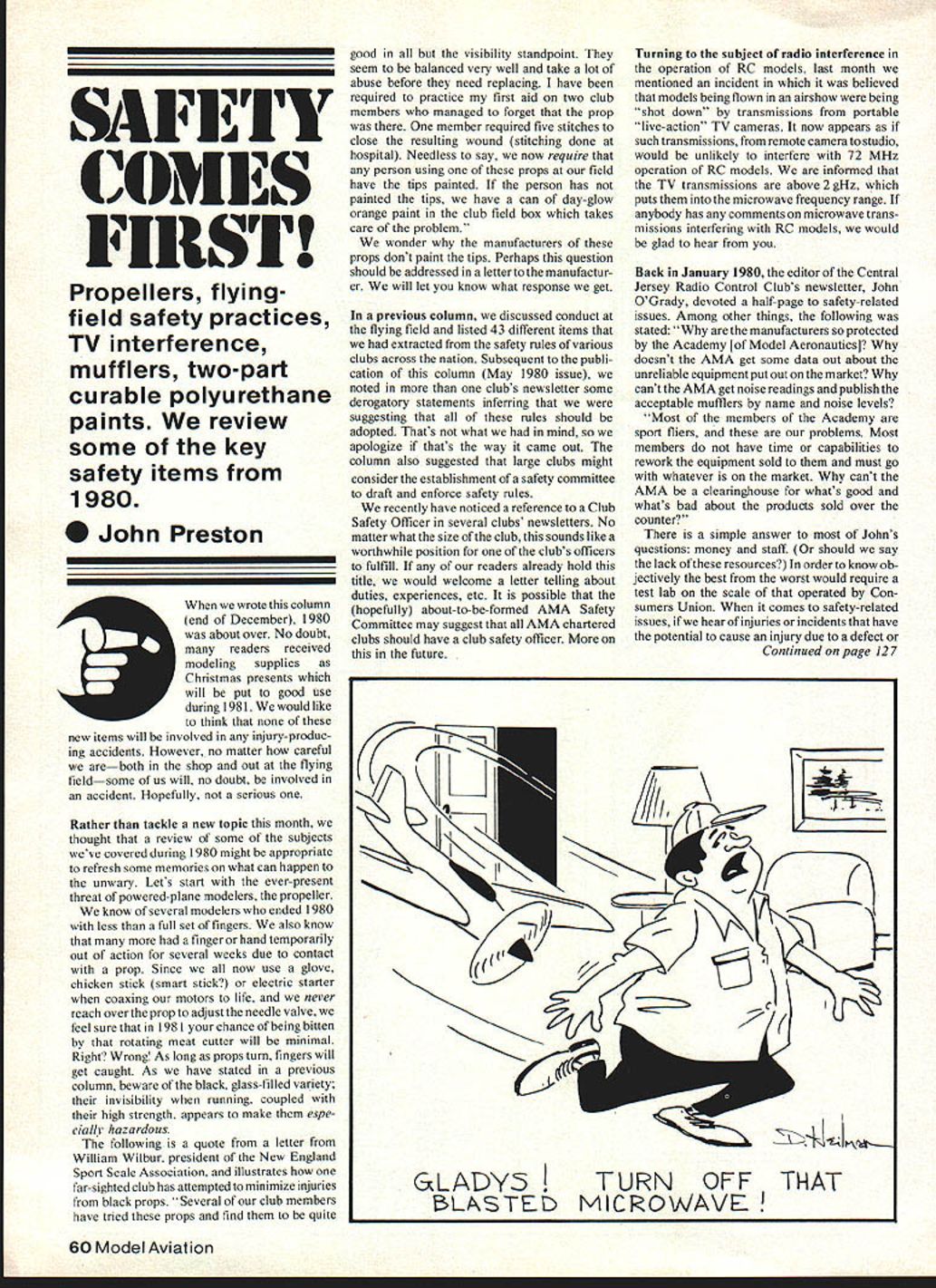 SAFETY COMES FIRST Propellers flyingfield safety practices TV interference mufflers two-part curable polyurethane paints review some key safety items 1980 0 John Preston wrote column end December 1980 about over No doubt readers received modeling supplies Christmas presents will put good use during 1981 would like think new items will involved injury-produc ing accidents However no matter careful areboth shop out flying fieldsome us will no doubt involved accident Hopefully serious Rather tackle new topic month thought review some subjects weve covered during 1980 might appropriate refresh some memories what can happen unwary Lets start ever-present threat powered-plane modelers propeller know several modelers ended 1980 less full set fingers also know finger hand temporarily out action several weeks due contact prop Since now use glove chicken stick smart stick electric starter coaxing motors life never reach over prop adjust needle valve feel surethatin 1981 yourchanceofbeingbitten rotating meat cutter will minimal Right Wrong As long props turn fingers will get caught As have stated previous column beware black glass-filled variety invisibility running coupled high strength appears make espe ciallv hazardous following quote letter William Wilbur president New England Sport Scale Association illustrates far-sighted club has attempted minimize injuries black props Several club members have tried props find quite good visibility standpoint seem balanced very well take lot abuse before need replacing have required practice first aid two club members managed forget prop member required five stitches close resulting wound stitching done hospital Needless say now require person using props field have tips painted person has painted tips have can day-glow orange paint club field box takes care problem wonder manufacturers props dont paint tips Perhaps question should addressed letter manufactur er will let know what response get previous column discussed conduct flying field listed 43 different items extracted safety rules various clubs across nation Subsequent publi cation column May 1980 issue noted clubs newsletter some derogatory statements inferring suggesting rules should adopted Thats what mind apologize thats way came out column also suggested large clubs might consider establishment safety committee draft enforce safety rules recently have noticed reference Club Safety Officer several clubs newsletters No matter what size club sounds like worthwhile position clubs officers fulfill readers already hold title would welcome letter telling about duties experiences etc possible hopefully about-to-be-formed AMA Safety Committee may suggest AMA chartered clubs should have club safety officer future Turning subject radio interference operation RC models last month mentioned incident believed models being flown airshow being shot down transmissions portable live-action TV cameras now appears such transmissions remote camera studio would unlikely interfere 72 MHz operation RC models informed TV transmissions above 2 gHz puts microwave frequency range anybody has comments microwave trans missions interfering RC models would glad hear Back January 1980 editor Central Jersey Radio Control Clubs newsletter John OGrady devoted half-page safety-related issues Among other things following stated manufacturers protected Academy [of Model Aeronautics] doesnt AMA get some data out about unreliable equipment put out market cant AMA get noise readings publish acceptable mufflers name noise levels Most members Academy sport fliers problems Most members have time capabilities rework equipment sold must go whatever market cant AMA clearinghouse whats good whats bad about products sold over counter simple answer Johns questions money staff should say lack resources order know ob jectively best worst would require test lab scale operated Con sumers Union comes safety-related issues hear injuries incidents have potential cause injury due defect Continued page 127 IIk LL I.6 V 6 GLADY5 LATEtZ TURN OFF N1ICOWAVL TRAT 60 Model Aviation floats smaller props can help best cure will come addition proper spray rails similar used full-sized birds same purpose foregoing no interest you FF scale type name has got Jim Dean Dean built 18 Loening Kitten Southern California Antique Model Plane Society SCAMPS meet changed ROW took wheels off Kitten mounted pair simple sled floats instead Contrary customary behavior brand-new ROW models built ignorant water lore Kitten fairly leapt off water executed graceful circles until winds dissipated came nice smooth water landing Asked about secret success Dean replied dont have thing did build light conclusion wish gratefully acknowl edge help suggestions received Walt Mooney Loren Williams Bill Warner Bill Hannan Jim Adams Bill Stroman Joe Tschirgi finally Jim Dean Safety Preston Continued page 60 less-than-desirable feature product feel obligated inform through column However have no wish sued manu facturer have fairly sure facts isnt always easy chore Some products may perfectly safe hands modeler have potential lethal hands klutz reasons suggested AMA Executive Council should AMA Safety Committee establish panel experts order evaluate products practices may lead bodily injury subject noise levels acceptable mufflers area dear heart However appears significant number modelers would like completely away mufflers Scale Rules Change Proposal SC-82- 10 seeks eliminate muf fler requirement CL Scale events Editors note rule proposalfailed pass Scale Contest Board deadfor cycle rules revisions RBMcM recent opinion poll members National Association Scale Aeromodelers NASA showed split exactly 50/50 proposal hope Scale Board members see fit retain requirement firmly believe mufflers should stay would go step further say should upper limit established engine noise levels However stated previous comlumn would very hard justit hearing loss issue Again anybody wants get soapbox subject noise lev