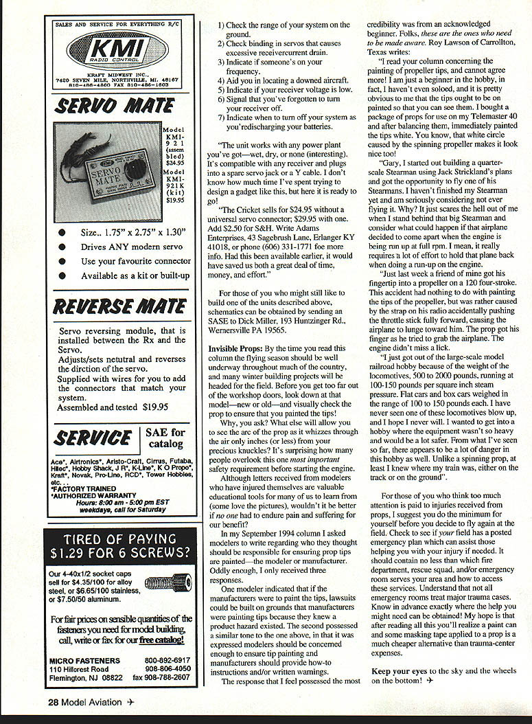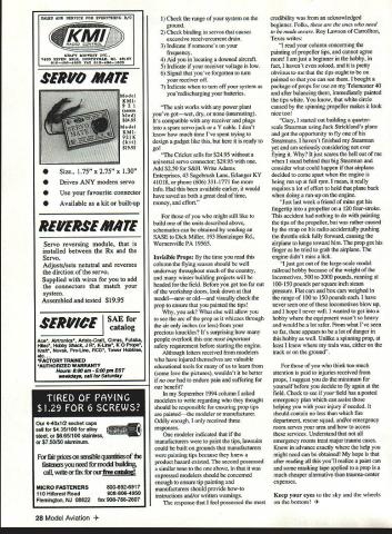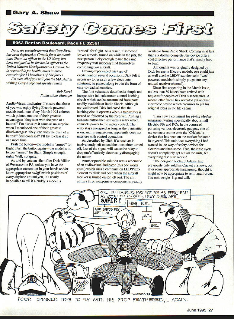 Gary Shaw Note recently learned Gary Shaw has deployed Croatia six-month tour Shaw officer US Navy has assigned health officer United Nations Headquarters Croatia responsible health issues three countries 33 battalions UN forces Im sure will join MA staff wishing Gary safe speedy return Rob Kurek Publications Manager Audio-Visual Indicator Im sure enjoy flying Electric powered models took note March 1995 column pointed out greatest advantages start push button Im also sure came no surprise mentioned greatest disadvantages start push button Still confused Ill try clear up time Push buttonthe model armed flight Push button againthe model no longer armed flight Simple enough right Well quite As told veteran silent flier Dick Miller Wernersville PA unless have appropriate transmitter hands and/or know appropriate on/off switch positions airplane around its nearly impossible tell buddys model armed flight As result someone leaves model turned pits next person lucky enough use same frequency will suddenly find themselves controlling two aircraft Having experienced type excitement several occasions Dick felt necessary research few electronic solutions passed along two form easy-to-read schematics first schematic described simple inexpensive fail-safe motor-control latching circuit can constructed parts readily available Radio Shack Although well tested Dick indicated latching circuit operates transmitter turned followed receiver Pushing fail-safe button activates relay connects power motor control relay stays energized long transmitter its engagement apparently does interfere control operations As described Dick receiver inadvertently left transmitter turned off loss signal will cause relay drop out/effectively electrically disengaging motor Another possible solution schematic audio-visual indicator works great uses combination LED/Piezo element blink beep aircraft receiver turned left unit utilizes three inexpensive components readily available Radio Shack Coming less six dollars complete device offers cost effective performance thats simply hard beat Although originally designed Dick use Electric models could just well use LED/Piezo device wet powered models simply plugs unused receiver channel Since first appearing March issue no less 30 letters have arrived requests copies Dicks schematics recent letter Dick revealed yet another electronic device promises put original ideas file cabinet am now columnist Flying Models magazine writing specifically about small Electric FFs RCs course pursuing various electronic gadgets contacts set onto Cricket device has market some four years unit does everything wanted way safety devices electrics some True rinse cycle doesnt completely get out suds everything else sure works designer Richard Adams previously sold Cricket shows after some appropriate haranguing thought might now appropriate sell mail-order unit weighs 1 ig will 5UT.Ij~ POOR SPN4ER 1Th5 TO FLY WTR H13 DROP WAYHRDJ. AGAIN June1995 27 SERL47 lIME Size. 175 x 275 x 130 Drives ANY modem servo 0 0 Use favourite connector Available kit built-up REVERSE M*TE Servo reversing module installed between Rx Servo Adjusts/sets netutral reverses dirction servo Supplied wires add connectors match system Assembled tested $1995 SERVICE SAE catalog Ace Alrtronics Aristo-Craft Cirrus Futaba Hioc Hobby Shack J R K-Lhie K 0 Propo Krait Novak Pro-Une RCD Tower Hobbles etc. 4FACTORY TRAINED AUTHORIZED WARRANTY Howe 900 500pm EST wOkdajw call lbr Saturday irpnces cxi ble quantities fr youneedirmo&J1ng call wi*orfforourfl~g MICRO FASTENERS 110 Hillcrest Road Flemington NJ 08822 800-892-6917 908-806-4050 fax 908-788-2807 1 Check range system ground 2 Check binding servos causes excessive receivercurrent drain 3 Indicate someones frequency 4 Aid locating downed aircraft 5 Indicate receiver voltage low 6 Signal youve forgotten turn receiver off 7 Indicate turn off system youredischarging batteries unit works power plant youve gotwet dry interesting Its compatible receiver plugs spare servo jack Y cable dont know much time Ive spent trying design gadget like ready go Cricket sells $2495 universal servo connector $2995 Add $250 S&H Write Adams Enterprises 43 Sagebrush Lane Erlanger KY 41018 phone 606 331-1771 foe info available earlier would have saved us both great deal time money effort might still like build units described above schematics can obtained sending SASE Dick Miller 193 Huntzinger Rd Wernersville PA 19565 Invisible Props time read column flying season should well underway throughout much country winter building projects will headed field Before get too far out workshop doors look down modelnew oldand visually check prop ensure painted tips ask What else will allow see arc prop whizzes through air inches less precious knuckles Its surprising people overlook important safety requirement before starting engine Although letters received modelers have injured themselves valuable educational tools us learn some love pictures wouldnt better no endure pain suffering benefit September 1994 column asked modelers write regarding thought should responsible ensuring prop tips paintedthe modeler manufacturer Oddly enough received three responses modeler indicated manufacturers paint tips lawsuits could built grounds manufacturers painting tips because knew product hazard existed second possessed similar tone above expressed modelers should concerned enough ensure tip painting manufacturers should provide how-to instructions and/or written warnings response feel possessed credibility acknowledged beginner Folks ones need made aware Roy Lawson Carrollton Texas writes read column concerning painting propeller tips cannot agree am just beginner hobby fact havent soloed pretty obvious tips ought painted can see bought package props use Telemaster 40 after balancing immediately painted tips white know white circle caused spinning propeller makes look nice too Gary started out building quarterscale Steanrman using Jack Strickl