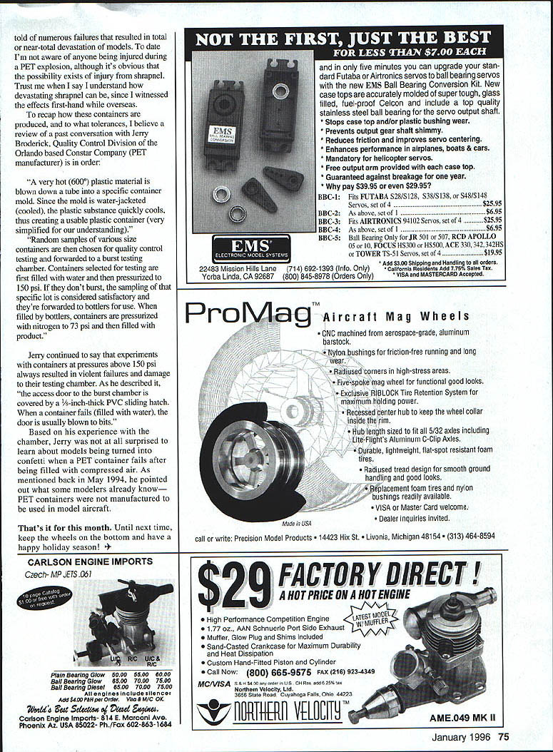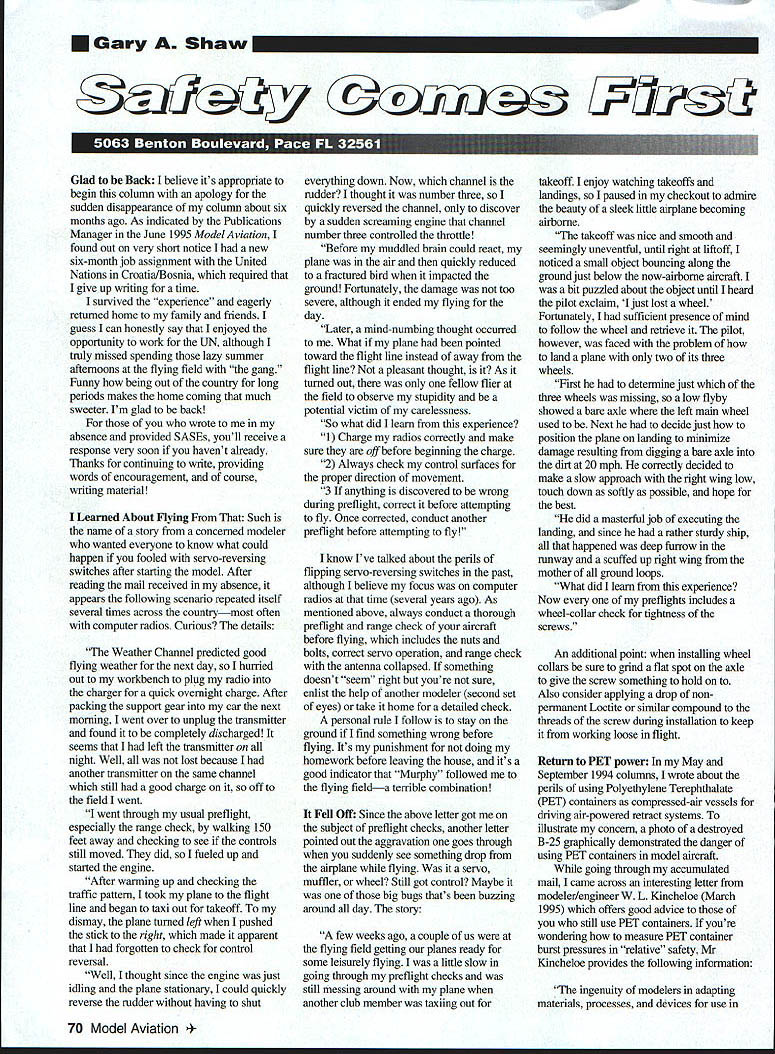 Gary Shaw Glad Back believe its appropriate begin column apology sudden disappearance column about six months ago As indicated Publications Manager June 1995 Model Aviation found out very short notice new six-month job assignment United Nations Croatia/Bosnia required give up writing time survived experience eagerly returned home family friends guess can honestly say enjoyed opportunity work UN although truly missed spending lazy summer afternoons flying field gang Funny being out country long periods makes home coming much sweeter Im glad back wrote absence provided SASEs youll receive response very soon havent already Thanks continuing write providing words encouragement course writing material Learned About Flying Such name story concerned modeler wanted everyone know what could happen fooled servo-reversing switches after starting model After reading mail received absence appears following scenario repeated itself several times across countrymost often computer radios Curious details Weather Channel predicted good flying weather next day hurried out workbench plug radio charger quick overnight charge After packing support gear car next morning went over unplug transmitter found completely discharged seems left transmitter night Well lost because another transmitter same channel still good charge off field went went through usual preflight especially range check walking 150 feet away checking see controls still moved did fueled up started engine After warming up checking traffic pattern took plane flight line began taxi out takeoff dismay plane turned left pushed stick right made apparent forgotten check control reversal Well thought since engine just idling plane stationary could quickiy reverse rudder having shut everything down Now channel rudder thought number three quickly reversed channel discover sudden screaming engine channel number three controlled throttle Before muddled brain could react plane air quickiy reduced fractured bird impacted ground Fortunately damage too severe although ended flying day Later mind-numbing thought occurred What plane pointed toward flight line instead away flight line pleasant thought As turned out fellow flier field observe stupidity potential victim carelessness So what did learn experience 1 Charge radios correctly make sure off before beginning charge 2 Always check control surfaces proper direction movement 3 anything discovered wrong during preflight correct before attempting fly Once corrected conduct another preflight before attempting fly know Ive talked about perils flipping servo-reversing switches past although believe focus computer radios time several years ago As mentioned above always conduct thorough preflight range check aircraft before flying includes nuts bolts correct servo operation range check antenna collapsed something doesn t seem nght youre sure enlist help another modeler second set eyes take home detailed check personal rule follow stay ground find something wrong before flying Its punishment doing homework before leaving house its good indicator Murphy followed flying fielda terrible combination Fell Off Since above letter got subject preflight checks another letter pointed out aggravation goes through suddenly see something drop airplane flying servo muffler wheel Still got control Maybe big bugs thats buzzing around day story few weeks ago couple us flying field getting planes ready some leisurely flying little slow going through preflight checks still messing around plane another club member taxiing Out takeoff enjoy watching takeoffs landings paused checkout admire beauty sleek little airplane becoming airborne takeoff nice smooth seemingly uneventful until right liftoff noticed small object bouncing along ground just below now-airborne aircraft bit puzzled about object until heard pilot exclaim just lost wheel Fortunately sufficient presence mind follow wheel retrieve pilot however faced problem land plane two its three wheels First determine just three wheels missing low flyby showed bare axle left main wheel used Next decide just position plane landing minimize damage resulting digging bare axle dirt 20mph correctly decided make slow approach right wing low touch down softly possible hope best did masterful job executing landing since rather sturdy ship happened deep furrow runway scuffed up right wing mother ground loops What did learn experience Now preflights includes wheel-collar check tightuess screws An additional point installing wheel collars sure grind flat spot axle give screw something hold Also consider applying drop non permanent Loctite similar compound threads screw during installation keep working loose flight Return PET power May September 1994 columns wrote about perils using Polyethylene Terephthaiate PET containers compressed-air vessels driving air-powered retract systems illustrate concern photo destroyed B-25 graphically demonstrated danger using PET containers model aircraft going through accumulated mail came across interesting letter modeler/engineer W L Kincheloe March 1995 offers good advice still use PET containers youre wondering measure PET container burst pressures relative safety Mr Kincheloe provides following iaformation ingenuity modelers adapting materials processes devices use 70 Model Aviation ncing hobby extends back least 1871 whalebone stays ladies corsets used power early helicopter surprising lure modern materials methods should felt ranks new products metallurgists organic chemists point out pose certain hazards carbon fiber boron fiber PET bottles come mind immediately major hazard whalebone whale supplied it didnt have vote would use beverage containers compressed gas reservoirs have some advice distant past industry used steam engines drive large compressors compressed-air needs factory testing pressure vessel make proof destructive tests using water instead gas air Being incompressible least pressures interest modelers water will expand crack hole appears conta