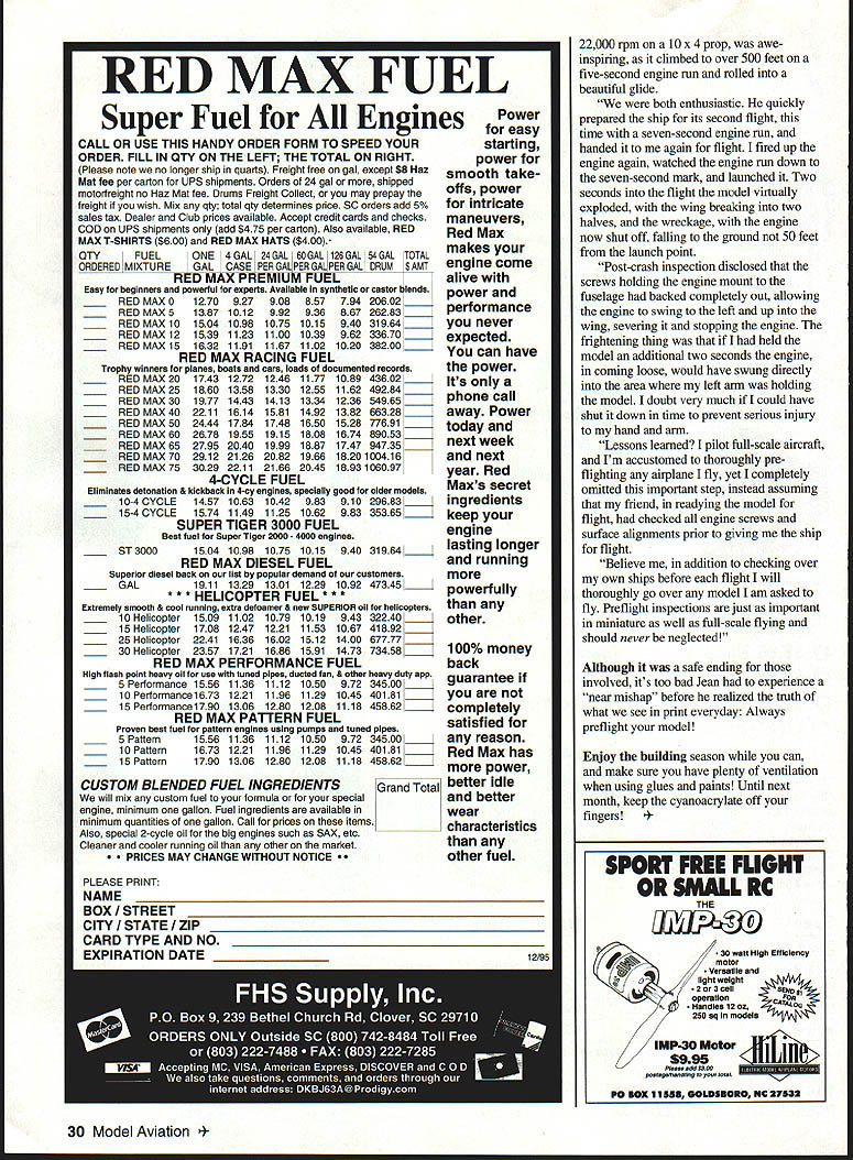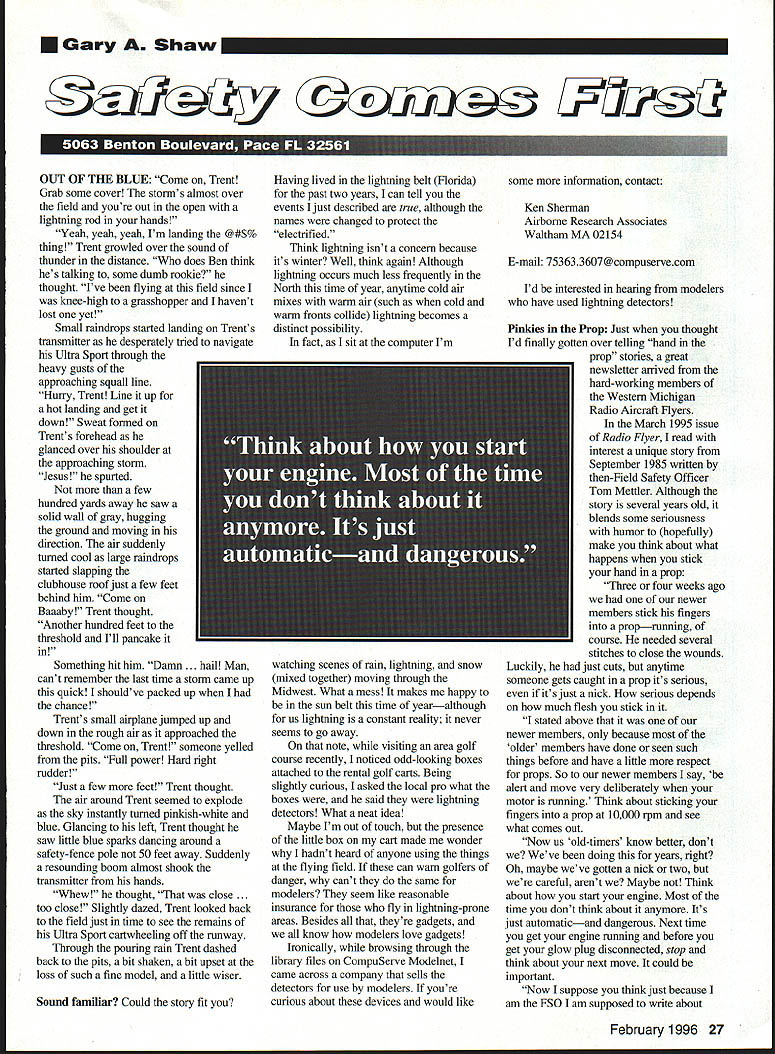 U Gary Shaw 1kFU -1 SI IJ s4U OF TIlE BLUE Come Trent Grab some cover storms almost over field youre out open lightning rod hands Yeah yeah yeah Im landing @#$% thing Trent growled over sound thunder distance does Ben think hes talking some dumb rookie thought Ive flying field since knee-high grasshopper havent lost yet Small raindrops started landing Trents transmitter desperately tried navigate Ultra Sport through heavy gusts approaching squall line Hurry Trent Line up hot landing get down Sweat formed Trent s forehead glanced over shoulder approaching storm Jesus spurted few hundred yards away saw solid wall gray hugging ground moving direction alr suddenly turned cool large raindrops started slapping clubhouse roof just few feet behind him Come Baaaby Trent thought Another hundred feet threshold Ill pancake Something hit him Damn . hall Man cant remember last time storm came up quick shouldve packed up chance Trent s small airplane jumped up down rough air approached threshold Come Trent someone yelled pits Full power Hard right rudder Just few feet Trent thought air around Trent seemed explode sky instantly turned pinkish-white blue Glancing left Trent thought saw little blue sparks dancing around safety-fence pole 50 feet away Suddenly resounding boom almost shook transmitter hands Whew thought close too close Slightly dazed Trent looked back field just time see remains Ultra Sport cartwheeling off runway Through pouring rain Trent dashed back pits bit shaken bit upset loss such fine model little wiser Sound familiar Could story fit Having lived lightning belt Florida past two years can tell events just described true although names changed protect electrified Think lightning isnt concern because its winter Well think again Although lightning occurs much less frequently North time year anytime cold air mixes warm air such cold warm fronts collide lightning becomes distinct possibility fact sit computer Im watching scenes rain lightning snow mixed together moving through Midwest What mess makes happy sun belt time yearalthough us lightning constant reality never seems go away note visiting area golf course recently noticed odd-looking boxes attached rental golf carts Being slightly curious asked local pro what boxes said lightning detectors What neat idea Maybe Im out touch presence little box cart made wonder hadnt heard anyone using things flying field can wam golfers danger cant same modelers seem like reasonable insurance fly lightning-prone areas Besides theyre gadgets know modelers love gadgets Ironically browsing through library files CompuServe Modelnet came across company sells detectors use modelers youre curious about devices would like some information contact Ken Sherman Airborne Research Associates Waltham MA 02154 E-mail 753633607@compuservecom Id interested hearing modelers have used lightning detectors Pinkies Prop Just thought Id finally gotten over telling hand prop stories great newsletter arrived hard-working members Western Michigan Radio Aircraft flyers March 1995 issue Radio Flyer read interest unique story September 1985 written then-Field Safety Officer Tom Mettler Although story several years old blends some seriousness humor hopefully make think about what happens stick hand prop Three four weeks ago newer members stick fingers proprunning course needed several stitches close wounds Luckily just cuts anytime someone gets caught prop its serious its just nick serious depends much flesh stick stated above newer members because older members have done seen such things before have little respect props So newer members say alert move very deliberately motor running Think about sticking fingers prop 10000 rpm see what comes out Now us old-timers know better dont Weve doing years right Oh maybe weve gotten nick two careful arent Maybe Think about start engine Most time dont think about anymore Its just automaticand dangerous Next time get engine running before get glow plug disconnected stop think about next move could important Now suppose think just because am FSO am supposed write about February 1996 27 4pr Wheds&WmgsetC eFBurn JG m rn Now 18008962582 LANIERRC PUII1T1 rs Only Please!fwPs jj I Wont Undersold see lower pric call! Shipping 4 YU Futaba 6VA $19999 6NFK18199 4NBF $13999 2NBR6999 4NBL12299 5-148 SPECIAL 3 3999 12 O9eaaddl Futaba Servos S148 Bulk149 Sl48w/Hdwe 69 S3001/metul259 S3101 micro349 S3002miniSS 9 S3302 1/4579 SSIOIBB409 S5102 Micro13B519 59303 BB HT71 9 S9202 BBSHT55 9 S9402 BBHS949 Futaba Accessories I27DF7Ch Rec6999 FM Crystals Call FM Dual Cony25 99 Aileron Ext5 99 AECI3 Y Harness 999 Tx butt 6NFK3799 NT-4 Rx bat1699 Trainer Cord1399 Hitec/RCD Servos 0300S StdII 99 0422 Pro1699 0605 Ultra3599 0705 Otauts42 99 Specify Air Fat Jr Sullivan 600/6013299/3599 Dynatron52 99 Glow Plug Specials Fox R/C Lou8 Ofor 1299 l2tor 1799 K&B 10/C Long 6for 1499 12 lor2299 DER TICIR OP IS ABC4994 GP 25 ABC5694 OP 40 ABC5994 GP6I ABC9494 R025 ABC8494 R036 ABC8994 tRO40 ABC9494 R046 ABC9994 R06 ABC48 94 Free shppzng FA-SO 18494 FA-6519394 FA-lOB21394 FA-91 S 24494 FA-120S34894 Saito 150 Retail Only $5999536994 Upgrade Golden Knight $15 include shippinl call other models 2S2Fl6 94 3SOFt 6394 S65FP11594 21S40SF2794 S 46 SF 14694 IS 46 ABC 5894 IS 61SF 21594 jrices include shipping call other models uuliii Silverline4D6999 Silverline 69999 Speed 12024999 Fox 40BB STD7799 40BB DLX8899 46BB ABC9999 K&B 45 Sportuter 65 Sportster 40 w/mfl 61 RIC w/m 6499 6799 6799 8499 JR Radios 26899 X-347 399 X-388 489 PCMIOS 96 Free shipping SIG Kadet Mk 11 1/4 Scale Cub Astro Hog Four Star 40 Mid Star 40 Fazer 559L 14994 809L 579 6194 4794 Hitec laah 4 ocus 6 trism7 FM 15594 16994 23994 Coverite 21st Century film 889 21st Cent fabric 1389 21st Fabric IS3289 MOKOTE paque92 acarls/Metallics119 Jeans139 25 3799/4599/ 479 Ultracote Ultracote999 UltracoteFlrscnt1299 Utracote Plus1199 Ultracote PIs FIr1399 3 Roll Special 3 $27 97 Coverite 2lst Century Iron2899 McDaniel NiStarters 101/